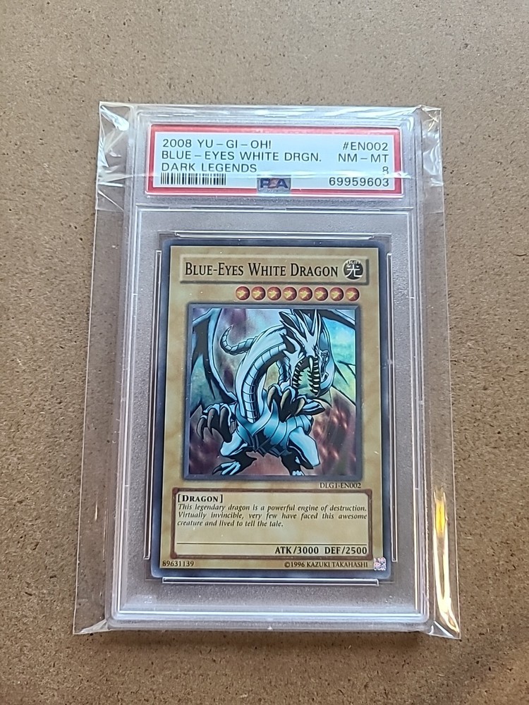 This Blue-eyes White Dragon card from the Yu-Gi-Oh! TCG game is a must-have for collectors. With a PSA 8 NM-Mint rating and a holographic surface, this card is a rare find from the Dark Legends set. The card features the character Blue-eyes White Dragon and is colored blue. It was manufactured in 2008 and has the card name Darkness. This card is perfect for those who love to collect and play Yu-Gi-Oh! TCG.