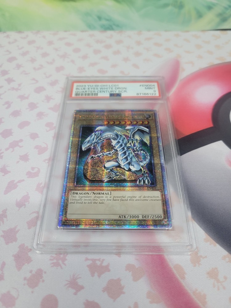 Own a piece of Yu-Gi-Oh! history with this PSA 9 graded Blue-Eyes White Dragon card from the 25th anniversary set. The card features a stunning foil finish and is part of the Legendary Collection. With a rare Quarter Century Secret Rare classification and card number 004, this English language card is a must-have for any collector or fan of the game. Professional Sports Authenticator (PSA) has verified the card's authenticity and graded it to a 9, ensuring its value and quality. Add this iconic character card to your collection today!