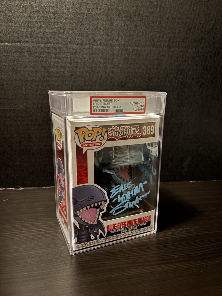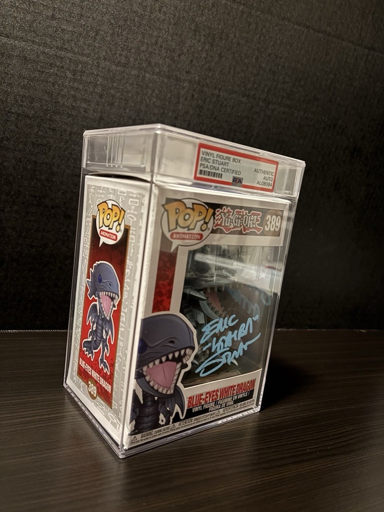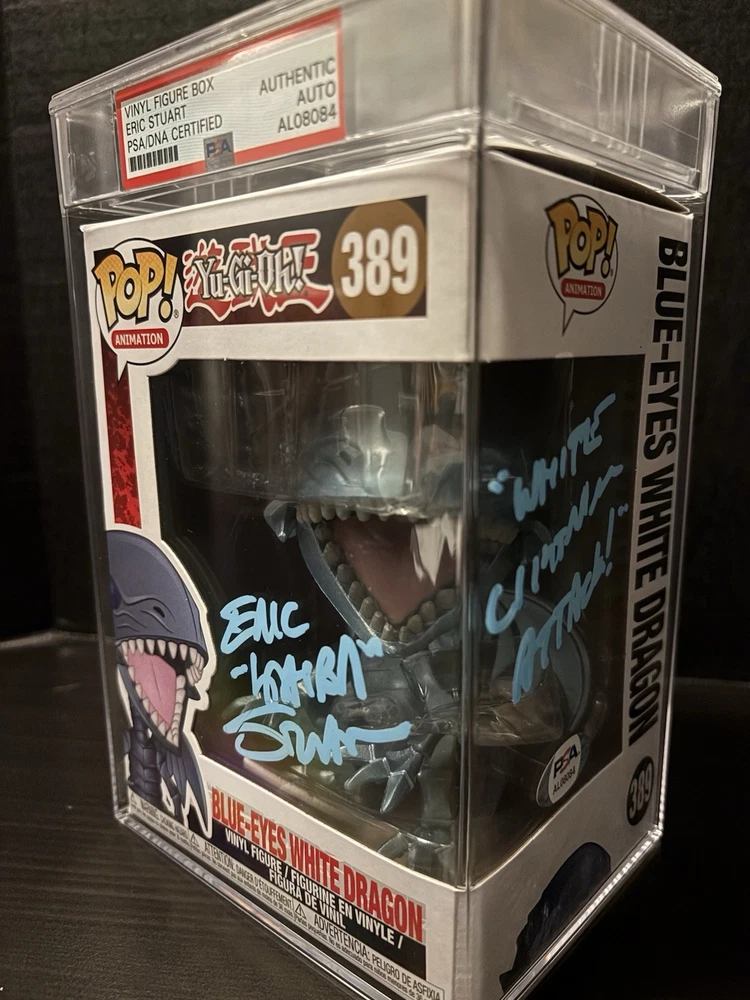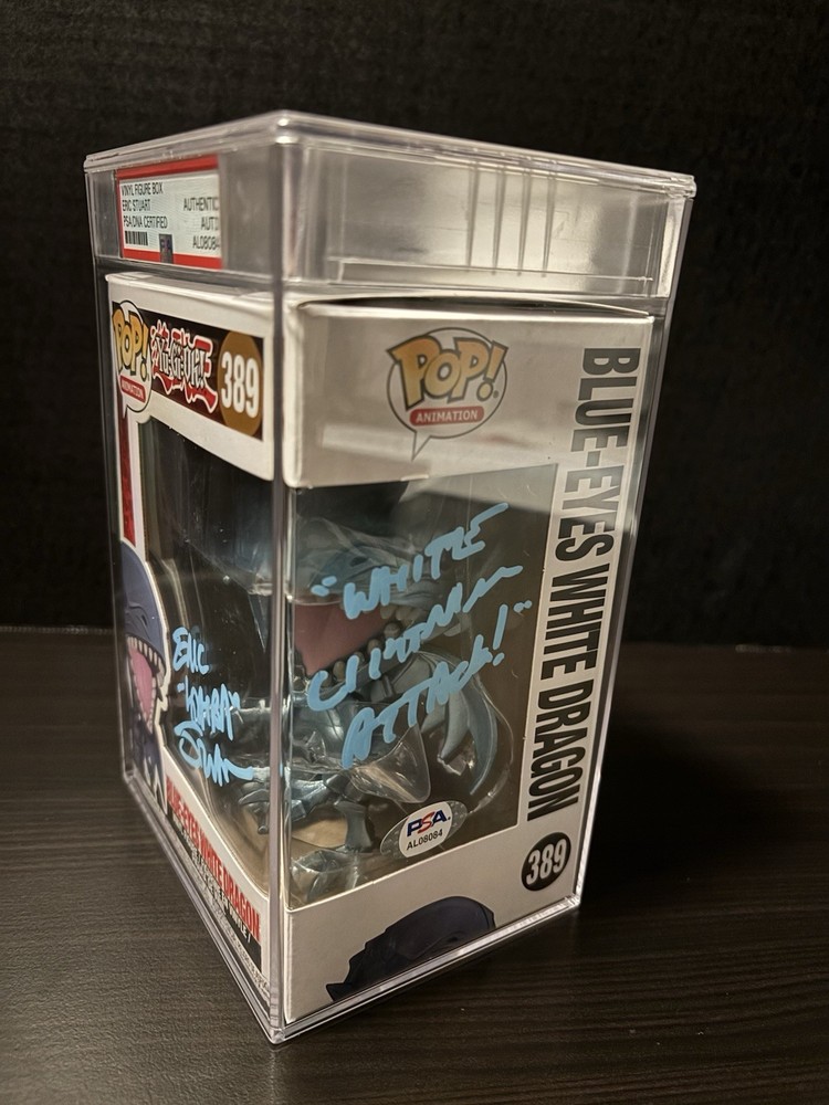 PSA Authenticated & Encapsulated Blue Eyes White Dragon Funko Pop! With autograph by Eric Stuart, English voice actor for Kaiba in the YuGiOh anime series. Funko includes signature and quote that reads: “White lightning, attack!” Free shipping!