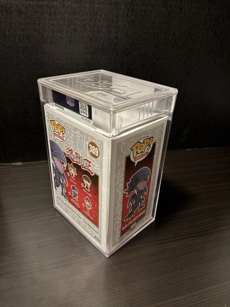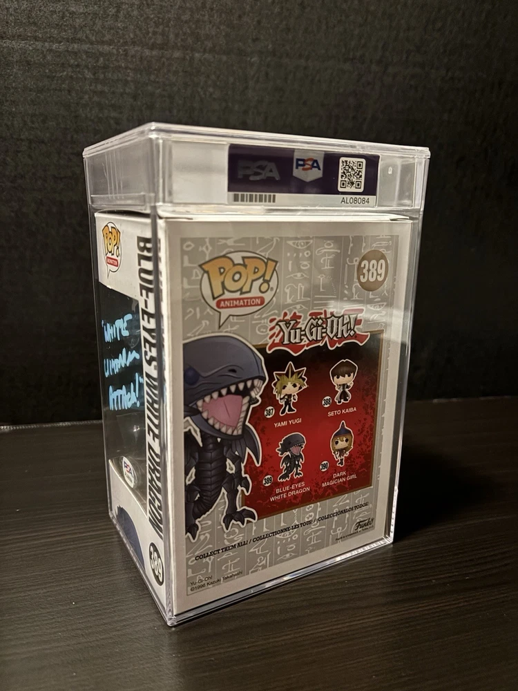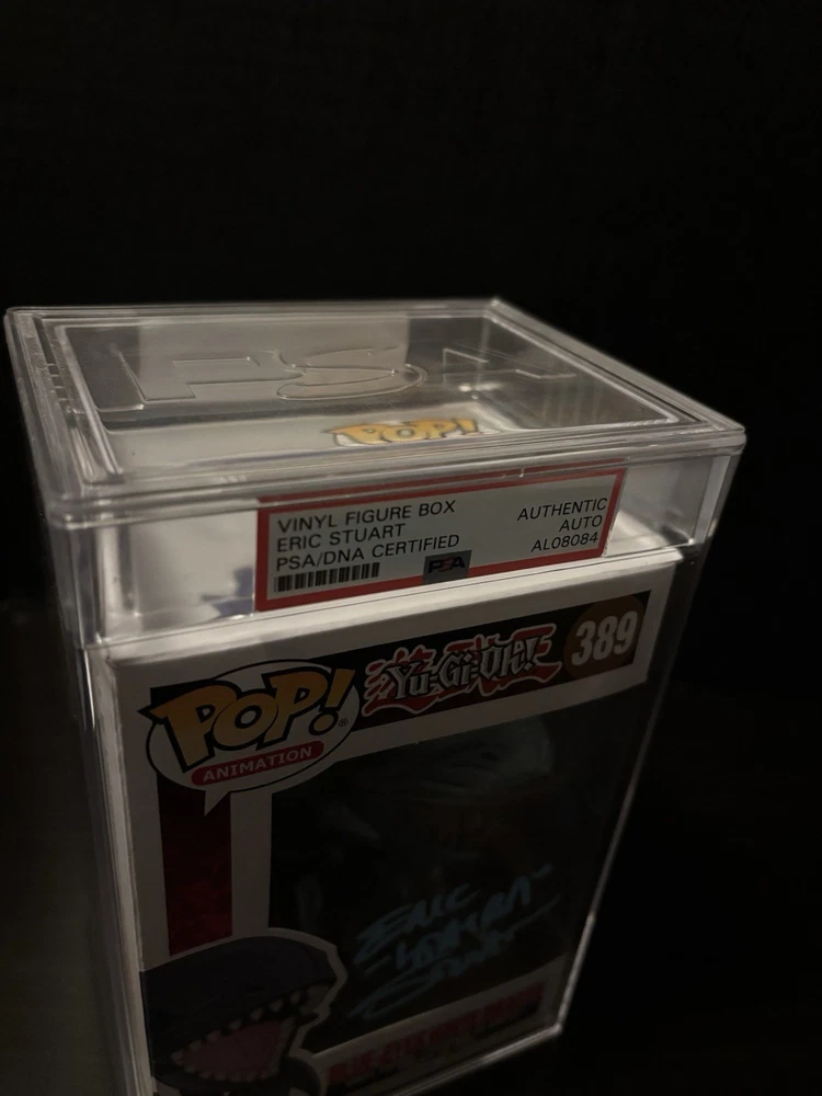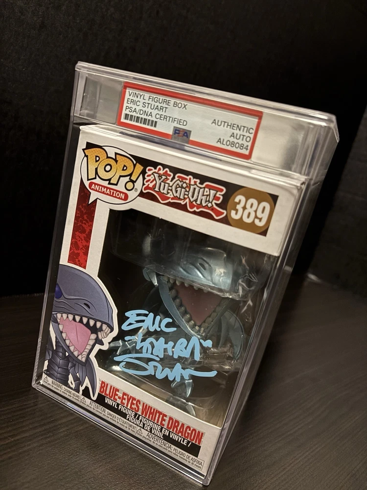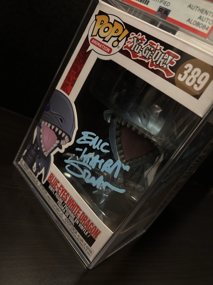PSA Authenticated & Encapsulated Blue Eyes White Dragon Funko Pop! With autograph by Eric Stuart, English voice actor for Kaiba in the YuGiOh anime series. Funko includes signature and quote that reads: “White lightning, attack!” Free shipping!