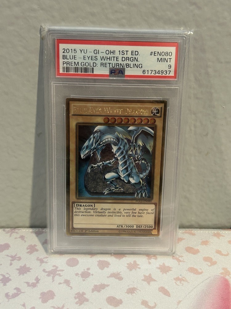 Elevate your Yu-Gi-Oh! TCG collection with the legendary Blue-Eyes White Dragon from the Premium Gold: Return of the Bling set. This card, numbered PGL2-EN080, boasts the prestigious 1st Edition status and has been meticulously graded by the Professional Sports Authenticator (PSA) with an impressive score of 9, ensuring its top-notch quality. The Gold Rare rarity and foil finish add a gleaming touch to this dragon card, making it a standout addition. Crafted with high-quality card stock, the card features the iconic Light attribute and the formidable attack power of 3000, coupled with a robust defense of 2500. This English-language card, manufactured by Konami in 2015, resonates with collectors and players alike, offering a blend of nostalgia and raw power. Its Japanese card size ensures compatibility with international collections, solidifying its place as a versatile and cherished piece.