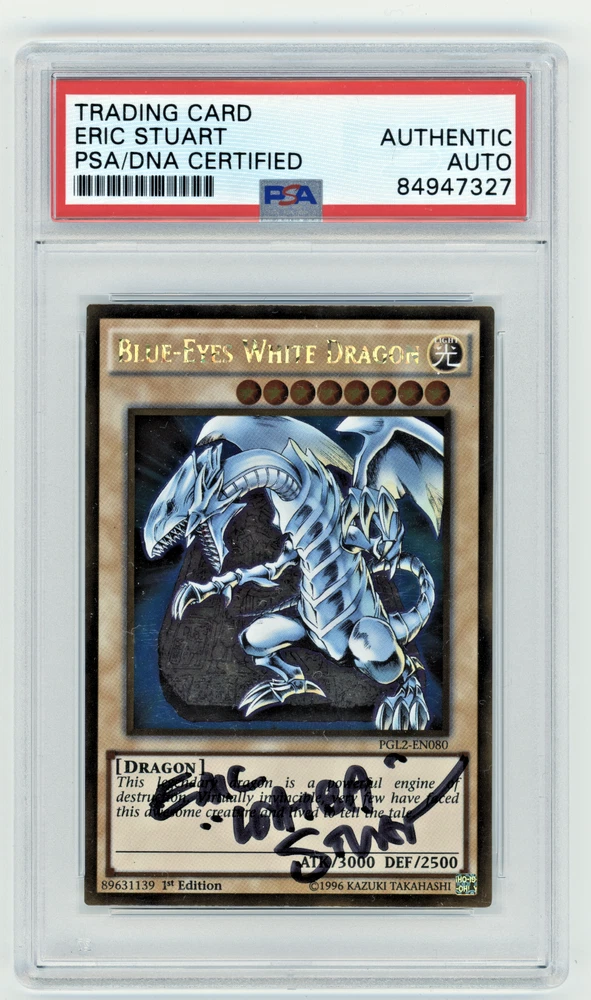 This Yu-Gi-Oh! TCG card is a Premium Gold 2 Blue Eyes White Dragon (PGL2-EN080) with a rare Holo finish. It features the autograph of Eric Stuart and is a 1st Edition card. The manufacturer of this card is Konami. The card is highly sought after by collectors of CCG Individual Cards and Collectible Card Games. It belongs to the Gold rarity category and is a must-have for any fan of the game.