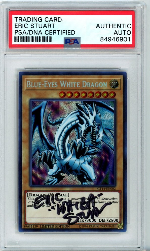 The Blue-Eyes White Dragon CT14-EN002 2017 Mega-Tins Limited Edition card is a highly sought-after collectible for fans of the Yu-Gi-Oh! TCG. This card features a high attack power of 3000 and a defense of 2500, making it a powerful addition to any deck. Autographed by Eric Stuart and authenticated by Professional Sports Authenticator (PSA), this Secret Rare card is a valuable and unique piece for collectors. The limited edition release adds to its appeal, making it a must-have for any serious CCG enthusiast.