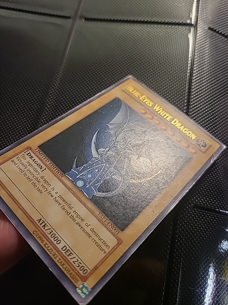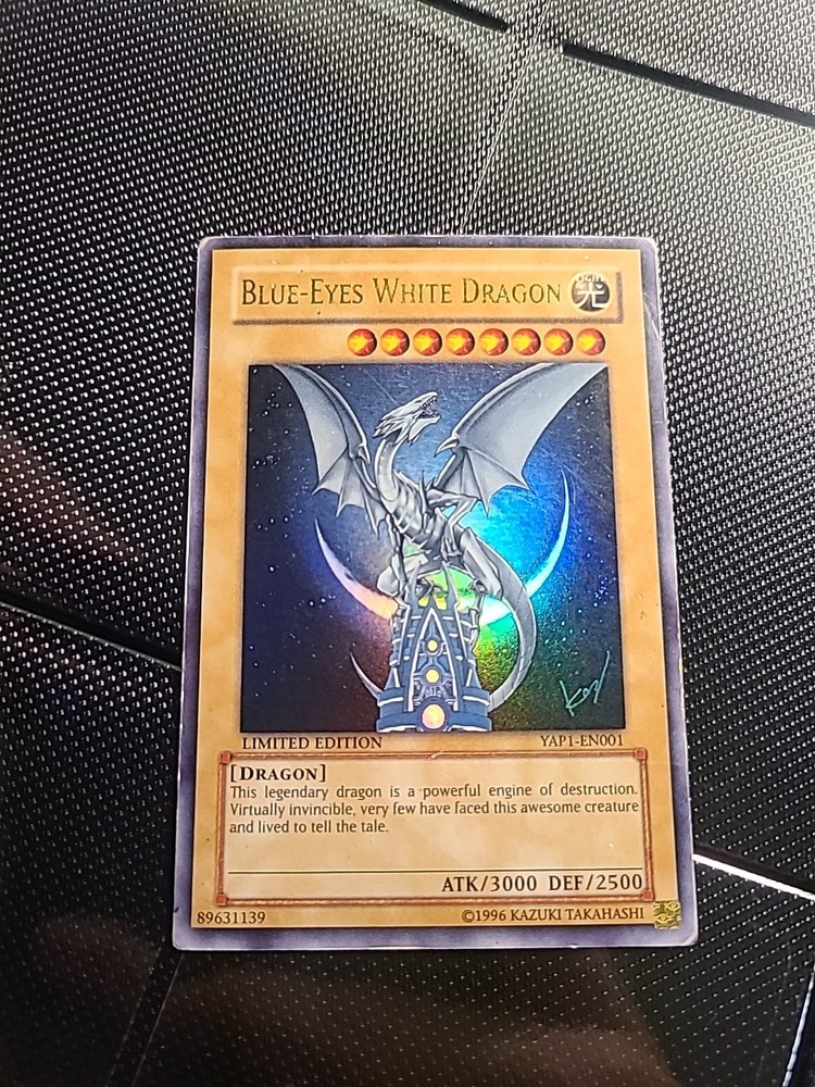 Elevate your Yu-Gi-Oh! TCG collection with the iconic Blue-Eyes White Dragon card, a treasure for both serious collectors and duelists. This card, numbered YAP1-EN001, is from the highly sought-after Anniversary Pack set and boasts the prestige of being a Limited Edition Ultra Rare card. The powerful beast stands out with an attack power of 3000 and a defense strength of 2500, ready to dominate the battlefield. The Blue-Eyes White Dragon is not just a formidable monster in the game; it also comes with the distinction of being autographed by the notable Eric Stuart, enhancing its collectability. Authenticated and encapsulated by the Professional Sports Authenticator (PSA), the autograph ensures its authenticity and adds considerable value to the card. This piece is a true vintage gem, presented in English and manufactured by Konami, a must-have for any Yu-Gi-Oh! enthusiast.