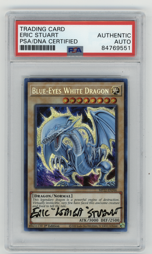 Up for sale is a highly sought-after card from the renowned Yu-Gi-Oh! TCG. This blue-colored Prismatic Secret Rare card features the iconic Blue-Eyes White Dragon and is autographed by Eric Stuart. It comes from the 2022 Tin of the Pharaohs Gods set and has a card number of MP22-EN266. This card is a 1st Edition and has a holo finish that adds to its aesthetic appeal. It has been manufactured by Konami, a trusted name in the gaming industry. This collectible card is perfect for any fan of the Yu-Gi-Oh! TCG. Its rarity and unique features make it a valuable addition to any collection. Bid with confidence and add this amazing card to your collection today!
