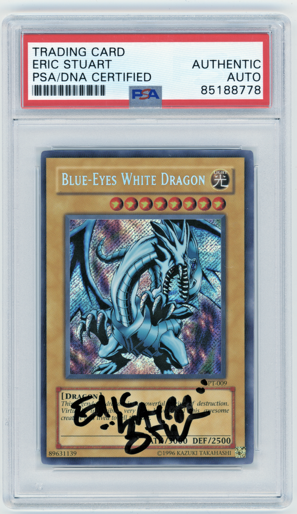 This is a unique Yu-Gi-Oh! TCG Blue-Eyes White Dragon BPT-009 card signed by the voice actor Eric Stuart and authenticated by PSA. This card is from the 2002/2003 Collector's Tins set and features a Light attribute and a Dragon creature type. The card is in good condition with a beautiful Holo finish and is considered a Secret Rare. This card is perfect for any Yu-Gi-Oh! TCG enthusiast or collector.