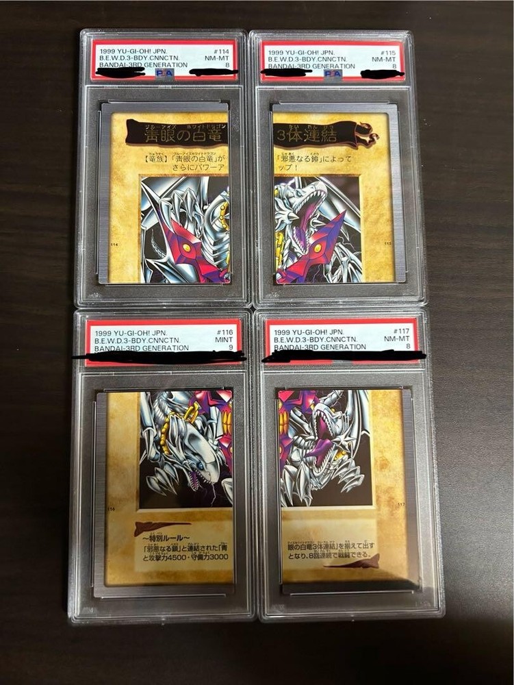 PSA9 PSA8 1999 YU-GI-Oh Japanese Bandai Blue-Eyes White Dragon's 3-Body set of 4 Item Description The cards are 1999 YU-GI-Oh! Japanese Bandai Blue-Eyes White Dragon's 3-Body Connection. The language of the card is Japanese . The card's grade is PSA9×1 PSA8×3 Shipping Standard Shipping (Fedex or DHL or Japan Post) Handling Time: 10 business days Business days are not include Saturday, Sunday and National holidays. We will arrange shipping for you asap except the holidays, after your payment cleared. The package will arrive 5-14 days after shipment. International Buyers - Please Note: Import duties, taxes, and charges are not included in the item price or shipping cost. These charges are the buyer's responsibility. Please check with your country's customs office to determine what these additional costs will be prior to bidding or buying. It is also sold on other sites. If it sells first, it may run out of stock. Please understand.Thank you for your understanding.