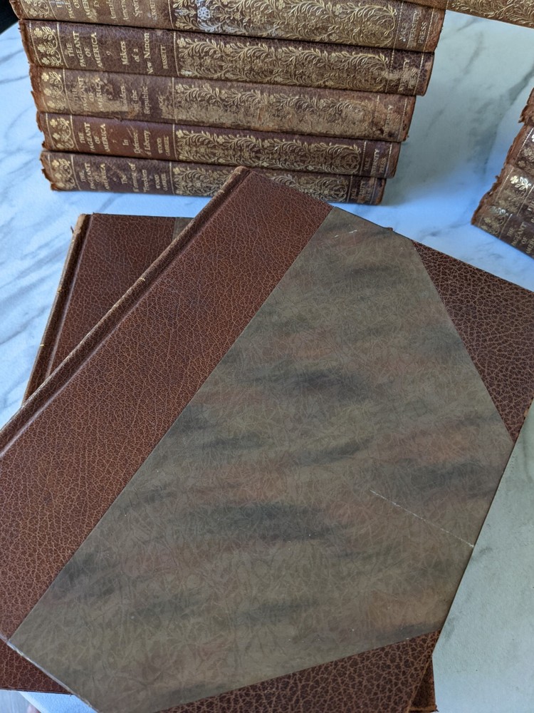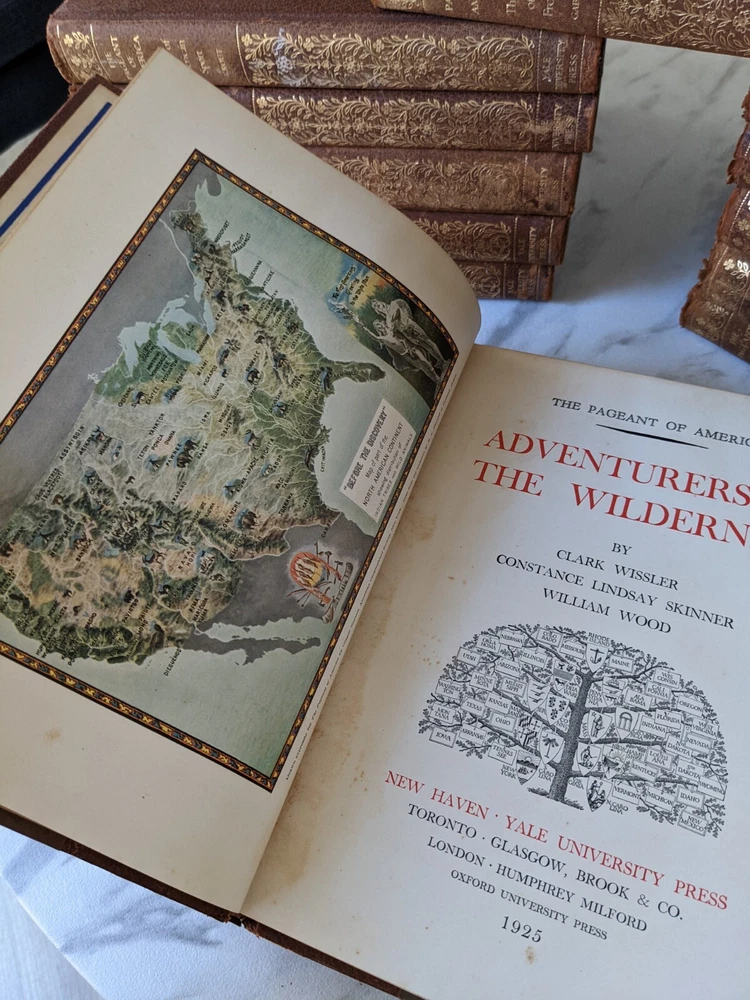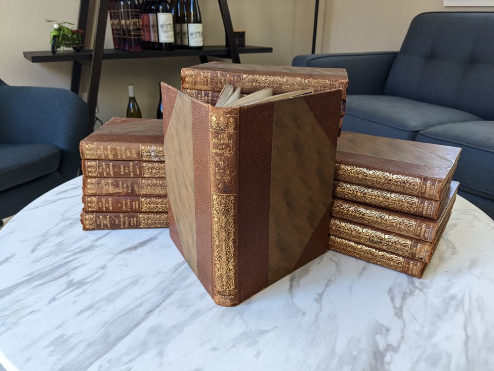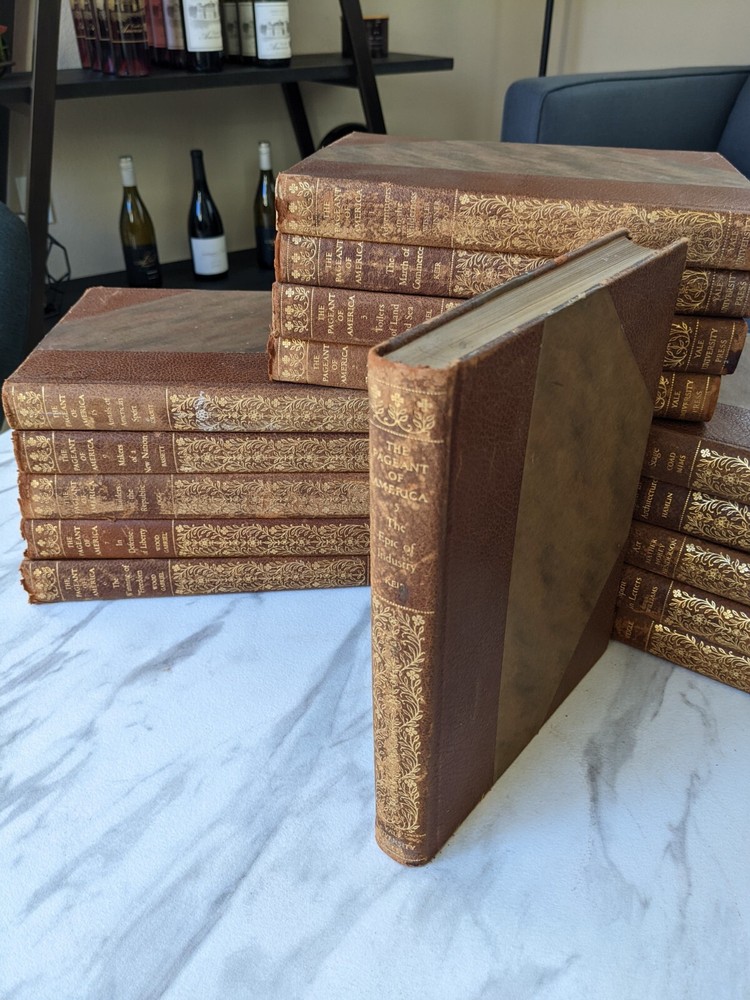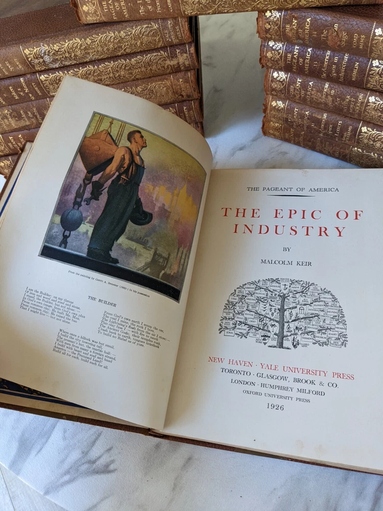 The Pageant of America Vol 1-15 Antique Leather Bound Pictorial History of the United States. Beautiful books printed 1925-1929. Ex Library of William Seward Webb (included biography of who these books might have belonged to. Webb passed away 1926, so not 100% sure since books published until 1929). William Seward Webb (January 31, 1851 – October 29, 1926) was a businessman, and inspector general of the Vermont militia with the rank of colonel. He was a founder and former president of the Sons of the American Revolution. Strong binding on high quality pages. Outer binding is "chipping". I will pack carefully to reduce shipping wear and tear. Very heavy set. Will be shipped media mail with insurance, and packed thoroughly. If you would like to pay extra for higher quality shipping please let me know. Please let me know if you have additional questions. Thanks! - Vol 1 Adventures in the Wilderness by Clark Wissler, Constance Lindsay Skinner, William Wood (1925) - Vol 2 The Lure of the Frontier by Ralph Henry Gabriel (1929) - Vol 3 Toilers of Land and Sea by Ralph Henry Gabriel (1926) - Vol 4 The March of Commerce by Malcom Keir (1927) - Vol 5 The Epic of Industry by Malcom Keir (1926) - Vol 6 The Winning of Freedom by William Wood, Ralph Henry Gabriel (1927) - Vol 7 In Defense of Liberty by William Wood, Ralph Henry Gabriel (1928) - Vol 8 Builders of the Republic by Frederic Austin OGG (1927) - Vol 9 Makers of a New Nation by John Spencer Bassett (1928) - Vol 10 American Idealism by Luther A. Weigle (1928) - Vol 11 The American Spirit in Letters by Stanley Thomas Williams (1926) - Vol 12 The American Spirit in Art by Frank Jewett Mather Jr., Charles Rufus Morey, William James Henderson (1927) - Vol 13 The American Spirit in Architecture by Talbot Faulkner Hamlin (1926) - Vol 14 The American Stage by Oral Sumner Coad, Edwin Mimd Jr. (1929) - Vol 15 Annals of American Sport by John Allen Krout (1929)