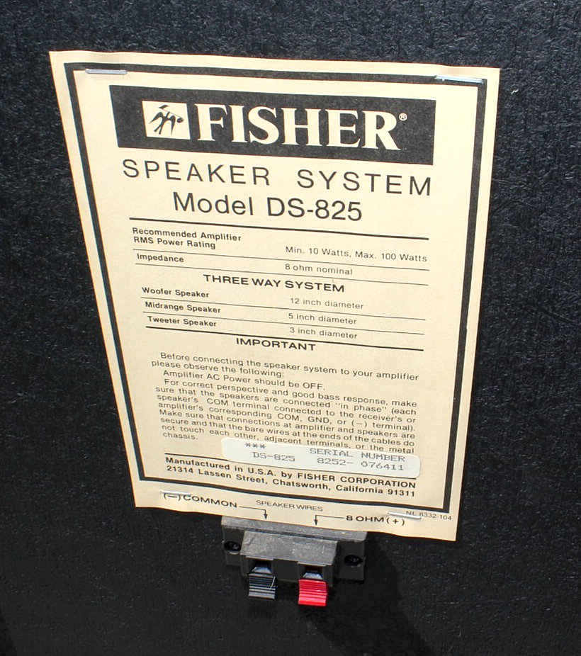 (m) Pair Vintage FISHER 3-Way Speakers Model DS-825 3", 5", 12" 10W - 100W 8 Ohms 29.5" x 14.25" x 13" Each Weigh Approx. 30 lbs. Each Very Good Working Condition Light wear only. Note one "Fisher" emblem missing from grille These will ship separately at the cost shown Or you are welcome to pick them up for free in Upstate New York (Village of Nassau near Albany, Not Nassau County) Please be sure to zoom-in on photos for more details ... if you need to know anything else, just a sk! Thanks for looking at this listing! Payment and Shipping Info : Payment can be made through PayPal or Cash upon Pickup. International Buyers: If you don't see a shipping price for your country please ask before purchasing. I may be able to add shipping options for you, but some items I do not ship internationally. Also, you are responsible for import/customs/duty fees incurred. I almost always ship within 1 business day! Free Tracking on all US orders. I'm happy to combine shipping when possible. When purchasing more than one item just wait for an invoice that will reflect combined shipping savings. If you'd like a quote ahead of time feel free to contact me. Additional Info: Your satisfaction is extremely important to me. Once you receive your item/s and are happy with them I hope you will consider leaving me positive feedback, as I will be doing the same for you. If you are not satisfied with your item please contact me immediately to arrange for a return/refund. Thank you for your interest, and please don't hesitate to contact me with any questions!