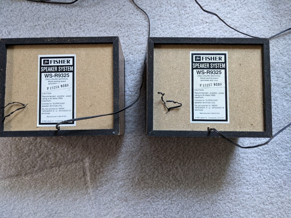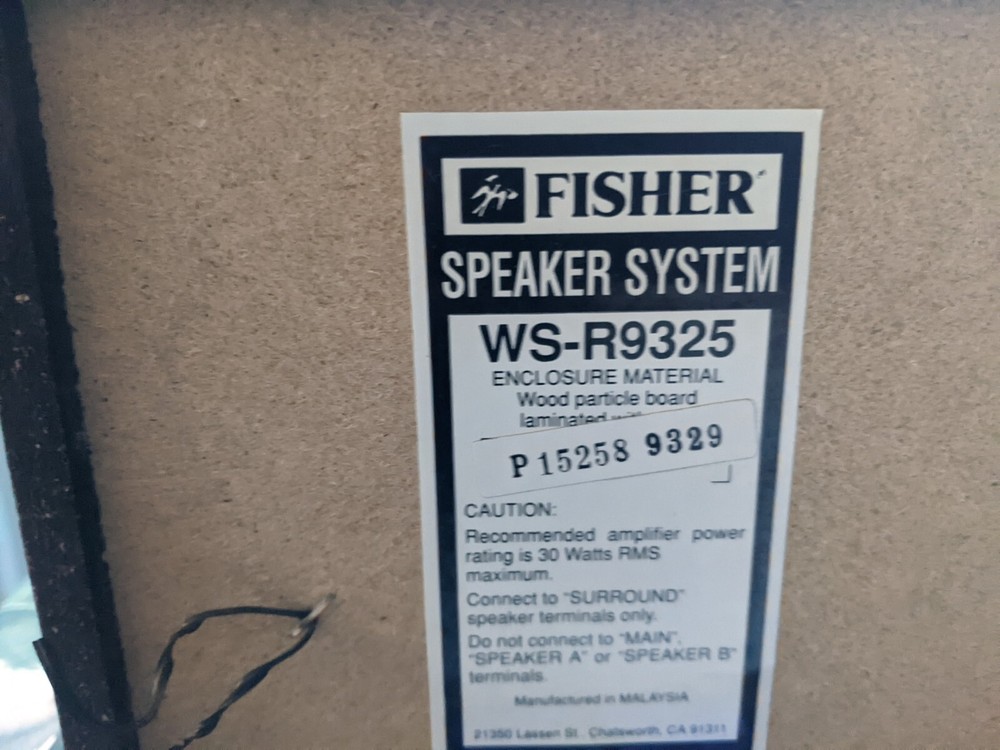 Experience high-quality sound with this pair of vintage Fisher Model WS-R9325 speaker systems speakers. These rectangular bookshelf speakers are designed to connect to surround terminals only and provide a seamless audio experience. The brown color and sleek design make them a perfect addition to any home decor. Will ship or available for local pickup. With a RMS power of 30 W, these wired speakers are perfect for any home audio setup. The unit quantity of 2 ensures that you have a complete set for your entertainment needs. The country/region of manufacture is unknown, adding to the mystery and charm of these vintage speakers. Upgrade your home audio system today with this pair of Fisher Model WS-R9325 speaker systems. Tested. Works. See pictures for content and conditions.