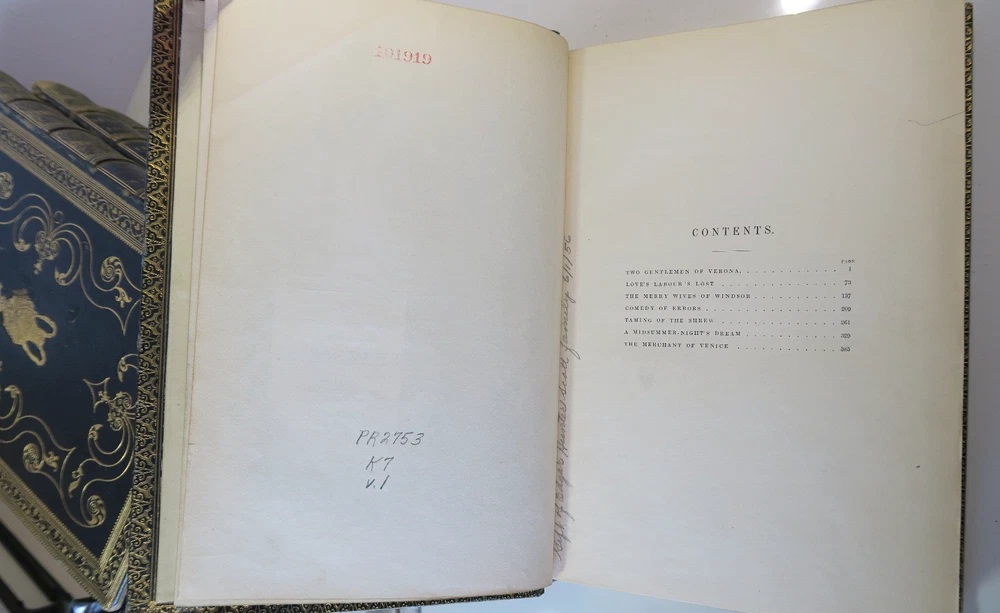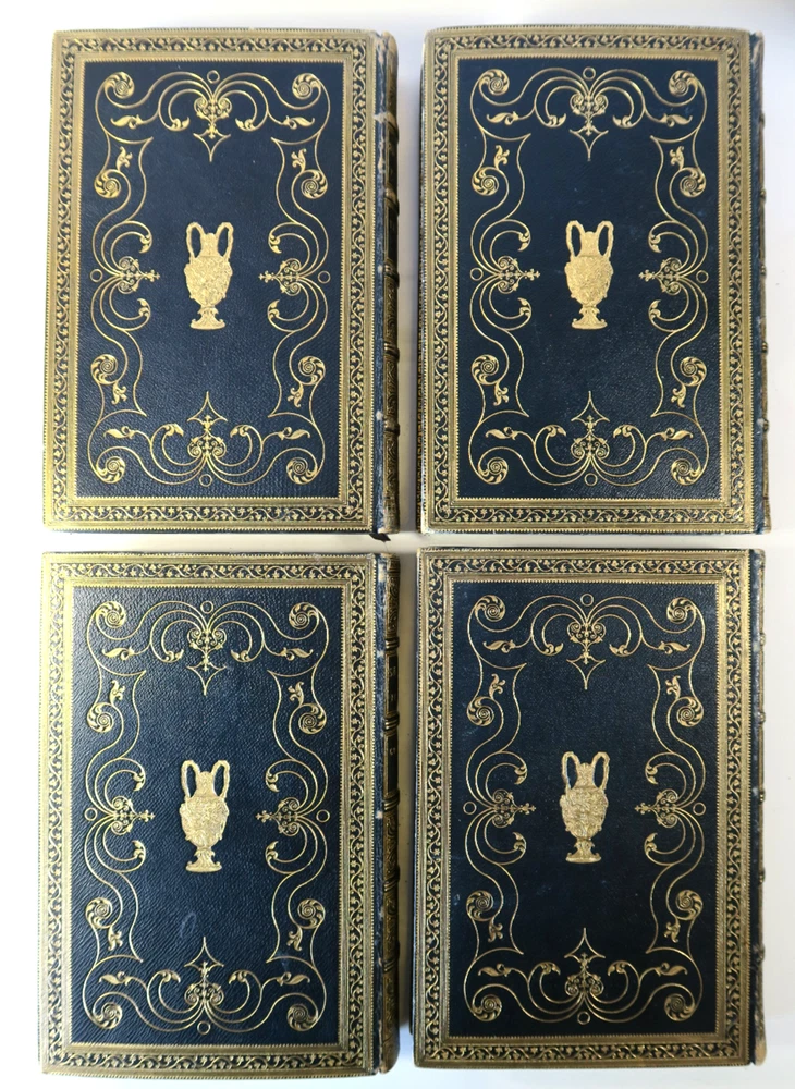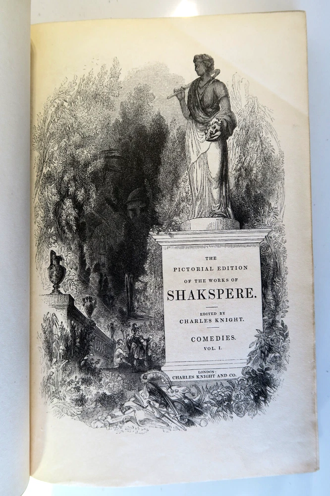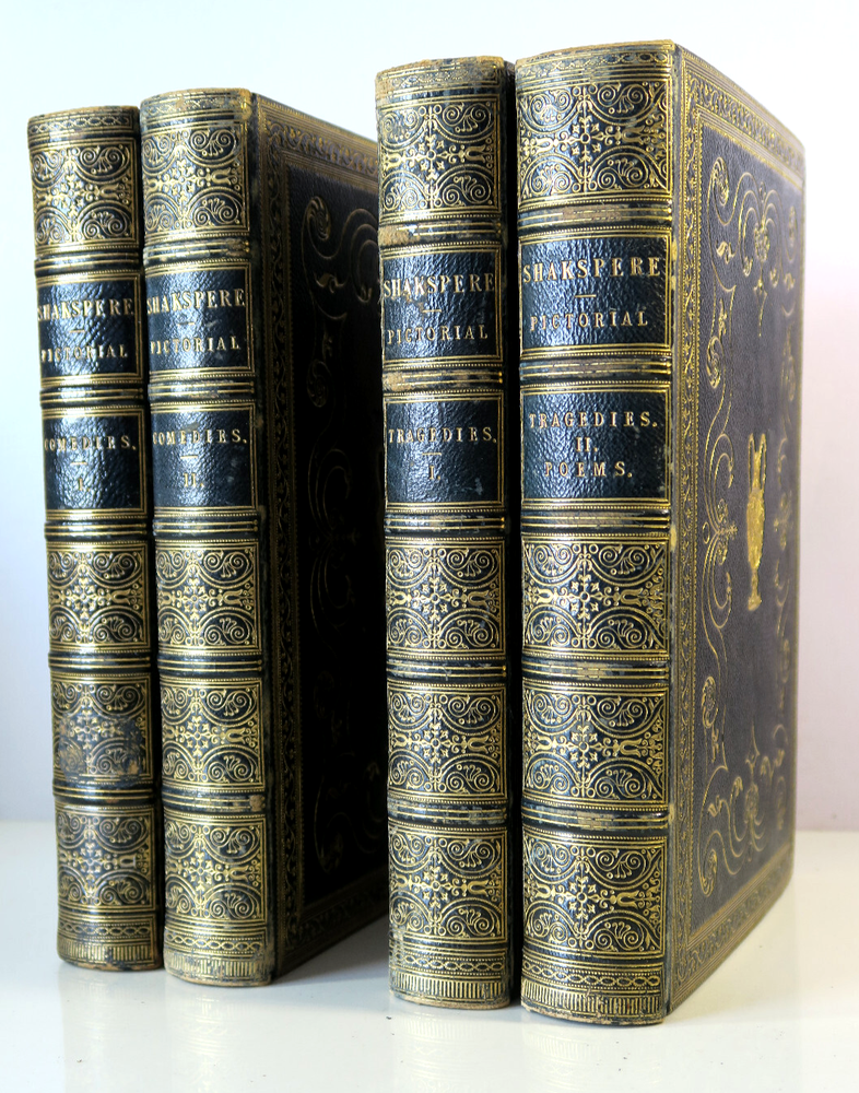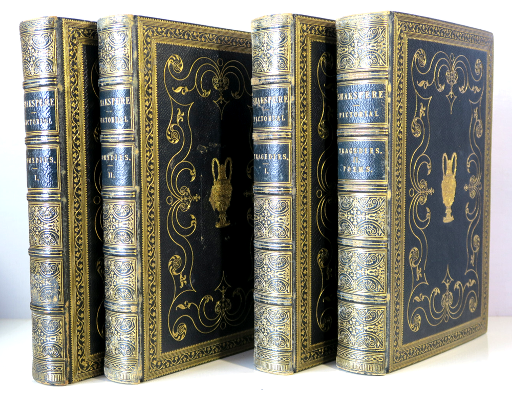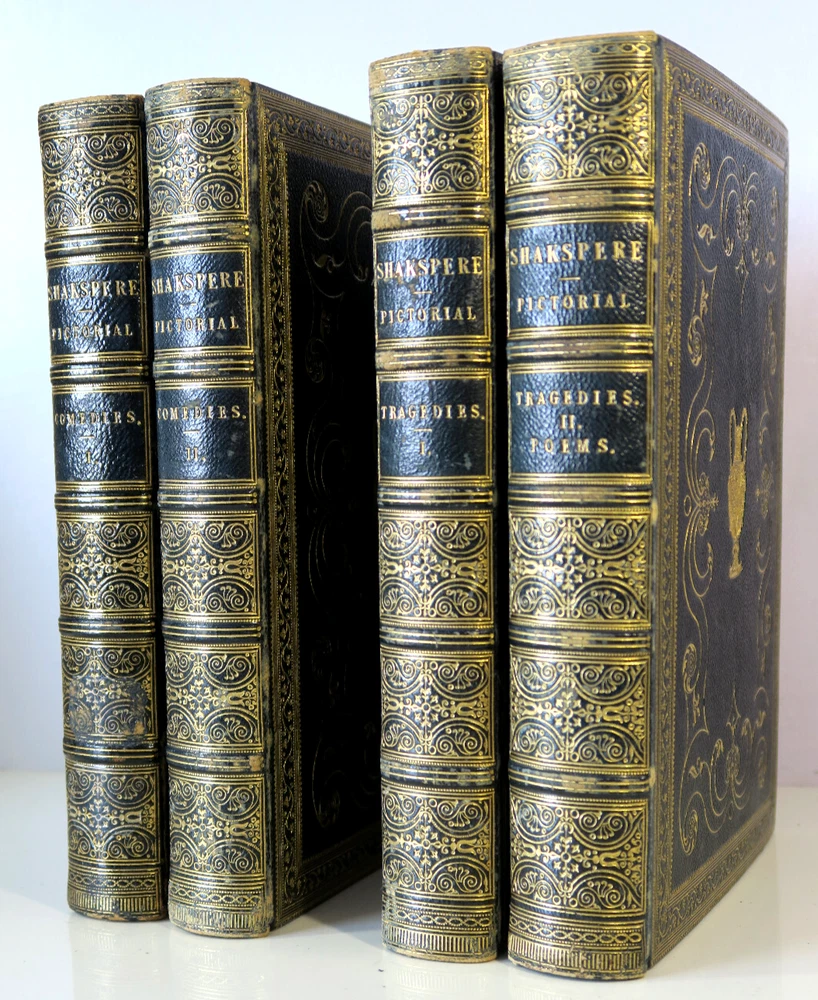 Pictorial Edition of the Works of Shakspere - 4 Vol Set Comedies & Tragedies VTG Profusely Illustrated with high quality engravings. Gilt emblem front boards; raised ribs and title and pattern in gilt to spines. All edges gilt. Comedies Volume I - Has library card envelope inside front cover. Presentation inside back cover "..1924" (this volume only) Comedies Volume II - Bookplate has been carefully removed Tragedies Volume I - Vintage bookplate inside front cover tragedies Volume II - Vintage bookplate inside front cover Vintage 4 volume set of leather bound hardcover books in very good - excellent condition. Firm spines and bindings, bright pages. Covers have light wear to spine ends and corners. Hinges are not split or cracked. Pages are supple with no odors.. Please inspect photos before purchasing and do not hesitate to contact us with any questions. Packed carefully and shipped quickly via USPS Media Mail. Please check our eBay store for many other Books. Shipping costs would be reduced for multiple items purchases.