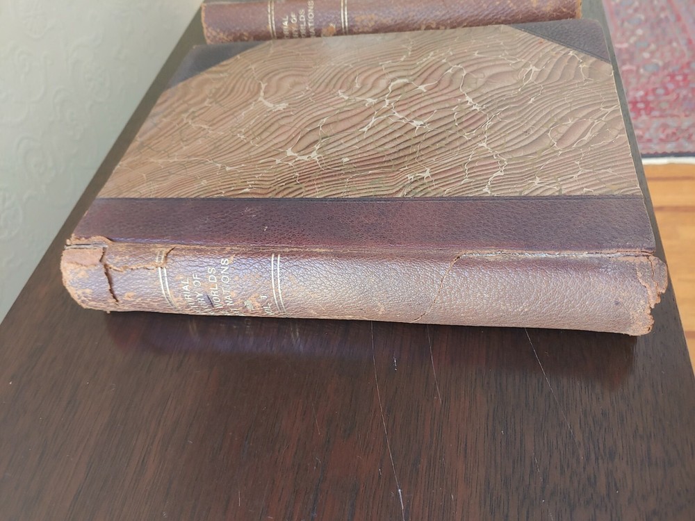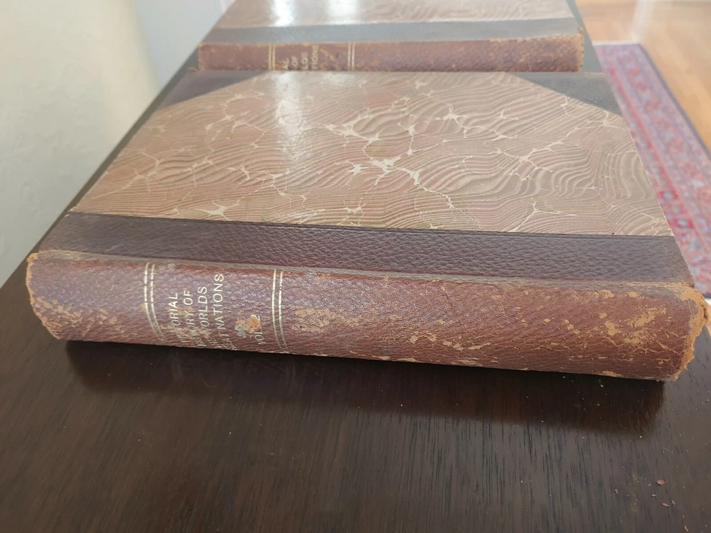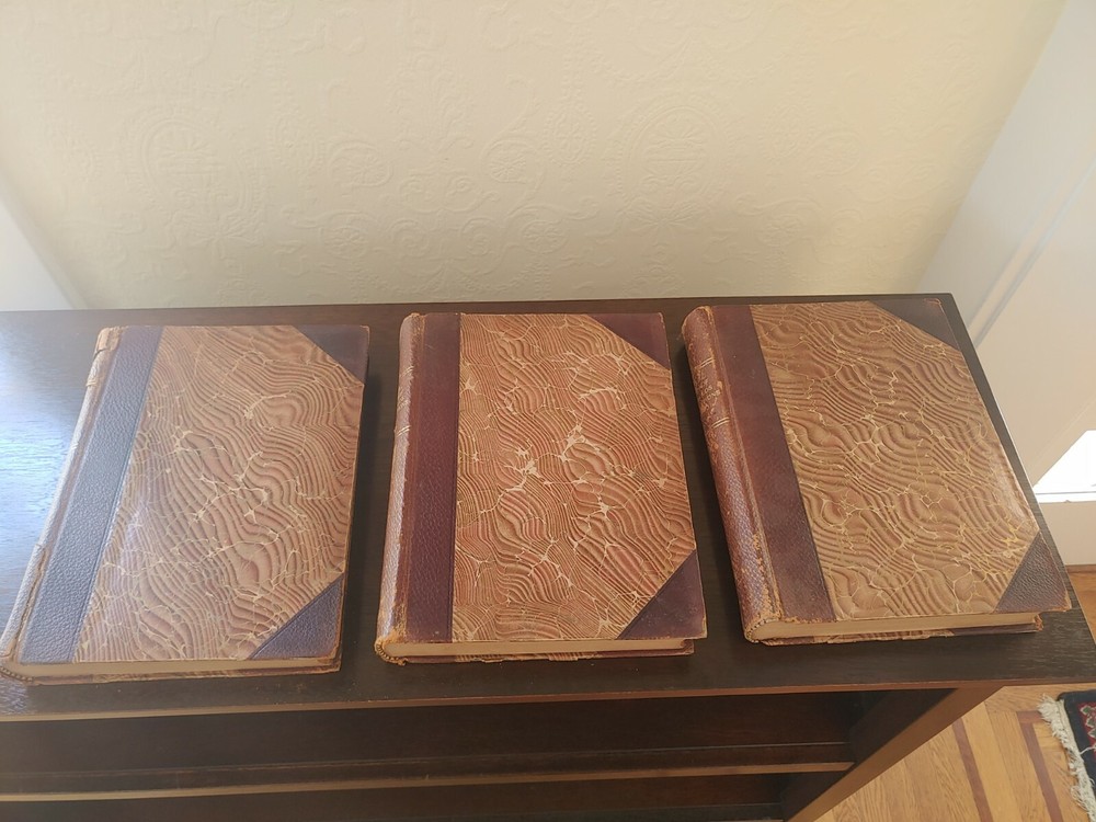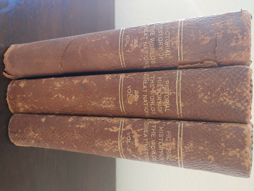 Pictorial History of the World's Great Nations 3 Vlm set Charlotte Yonge 1882. This 3 volume set is in acceptable/poor condition. The bindings are secure with no loose pages on volumes 2 & 3. The bindings/spine has pulled away from volume 1 with an actual separation from the front cover. There are numerous black/white illustrations. Leather bound covers show a good bit of wear especially on volume 1. Leather will flake without due care. This set has a copyright date of 1882.