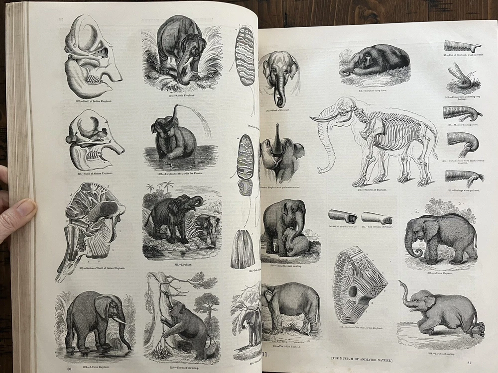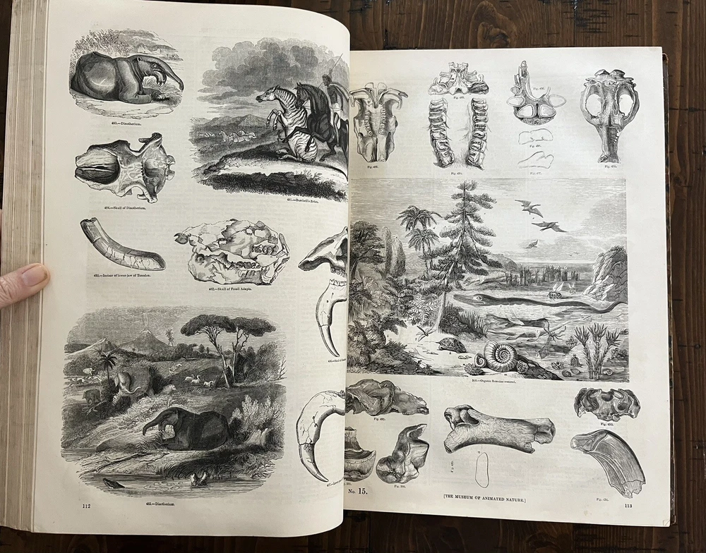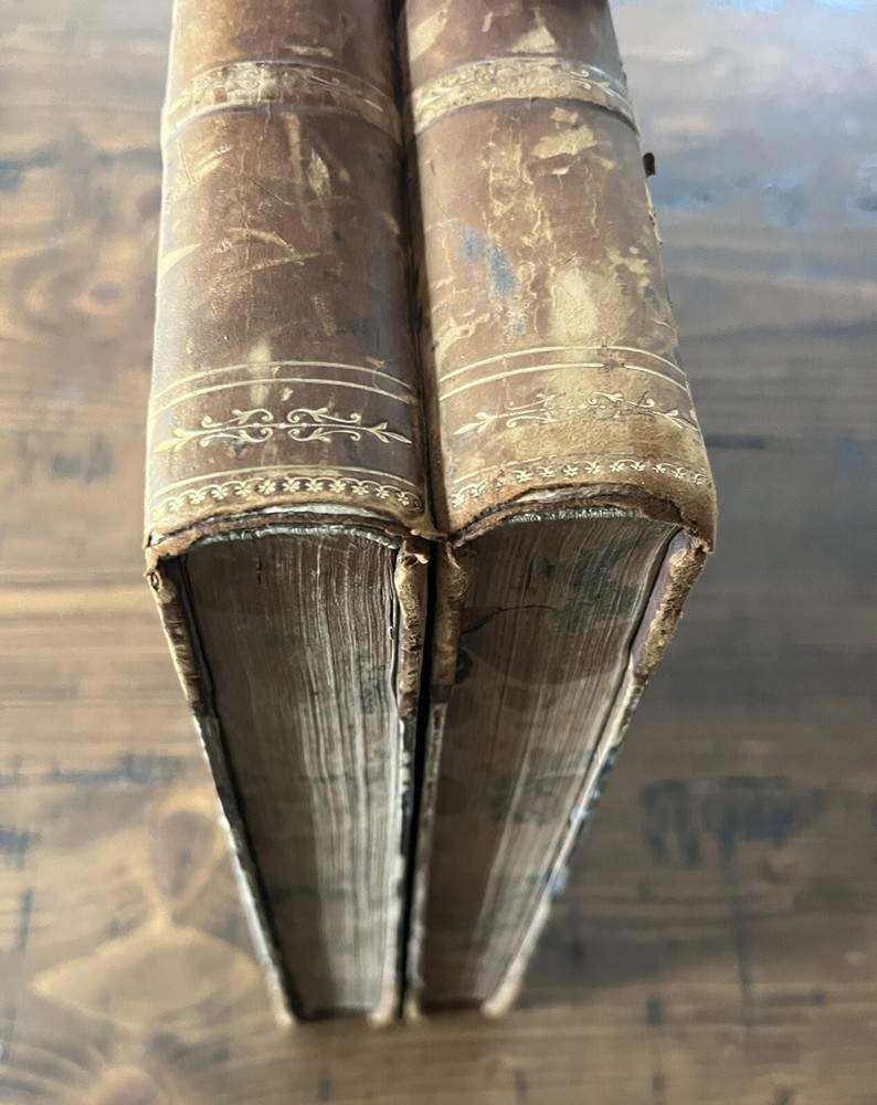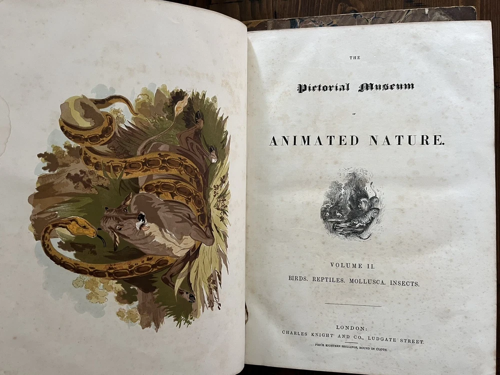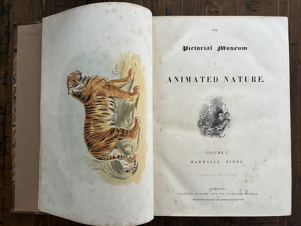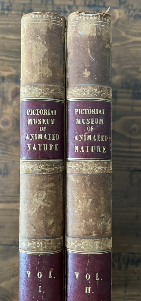 PICTORIAL MUSEUM OF ANIMATED NATURE 2 Volume Set in quarter leather Published by Charles Knight and Co. in London - undated, c. 1870 Rubbing and wear to boards and spine; corners bumped; bookplate and ink inside front board of each volume; water stain and foxing to endpages thru title page; bindings solid. Thank you for looking!