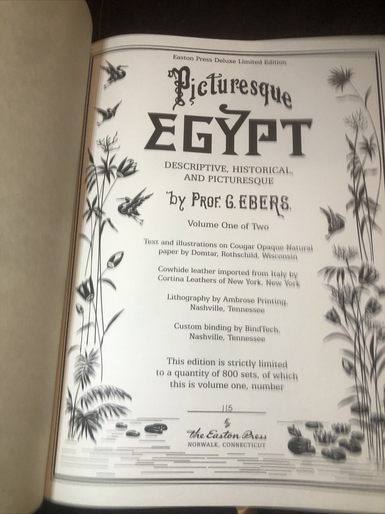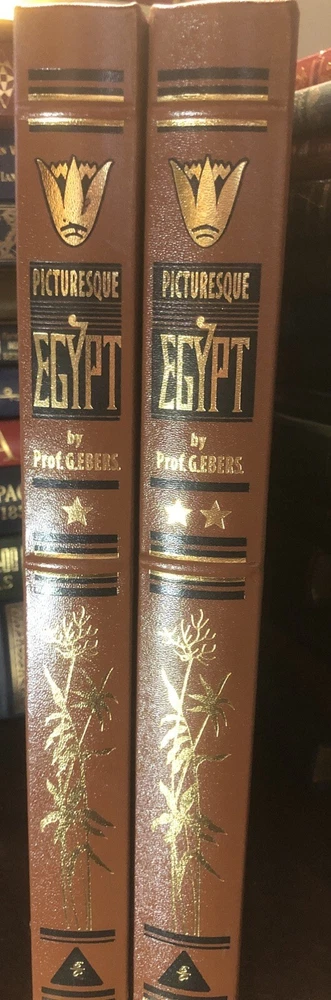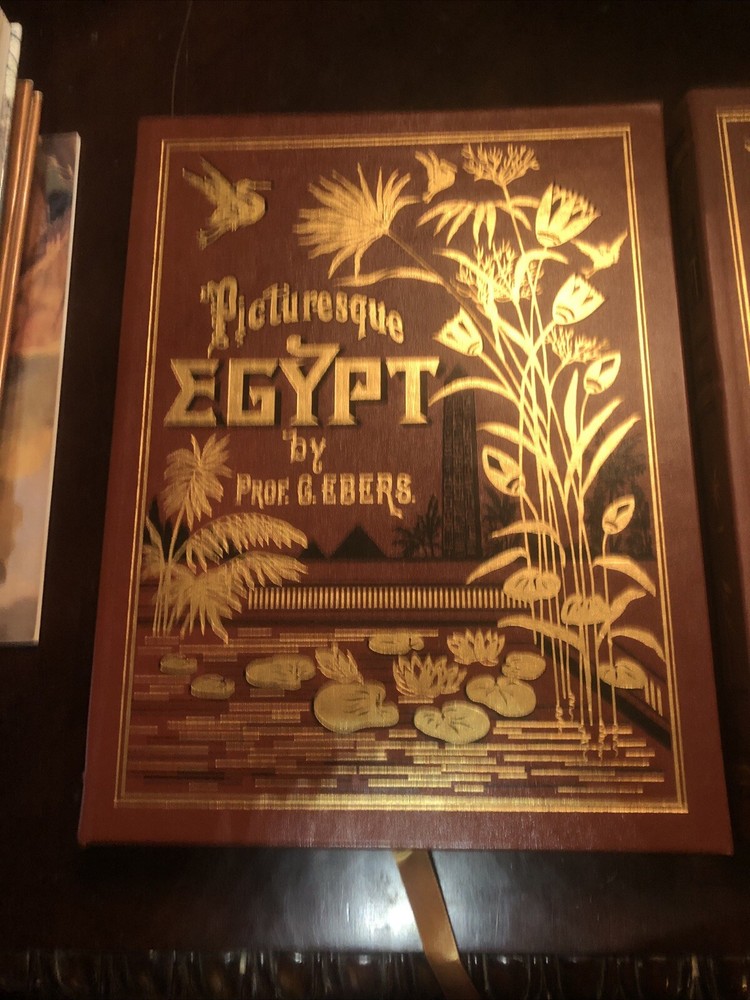 This is a rare and highly sought-after book titled "Picturesque EGYPT" by Prof. G. Ebers, published by Easton Press in a collector's edition limited to only 800 copies. The book covers the topic of exploration and travel in Egypt, and features stunning leather binding with special attributes that make it a unique addition to any collection. The author, Prof. G. Ebers, is an esteemed expert on Egyptian history and culture, and has compiled a comprehensive guide on the subject in these two volumes. The book is perfect for anyone interested in collecting rare books, or for those who simply appreciate the beauty and richness of Egyptian history. Don't miss your chance to own this exquisite collector's edition of "Picturesque EGYPT". From a large estate of 1,000 Easton Press mostly great leather books being listing over next several weeks. Non smoking & pet free estate. Blank bookplate & not signed or signature in book. Very nice pristine condition. Never read. They are all from 1 estate, see pics. Free shipping.