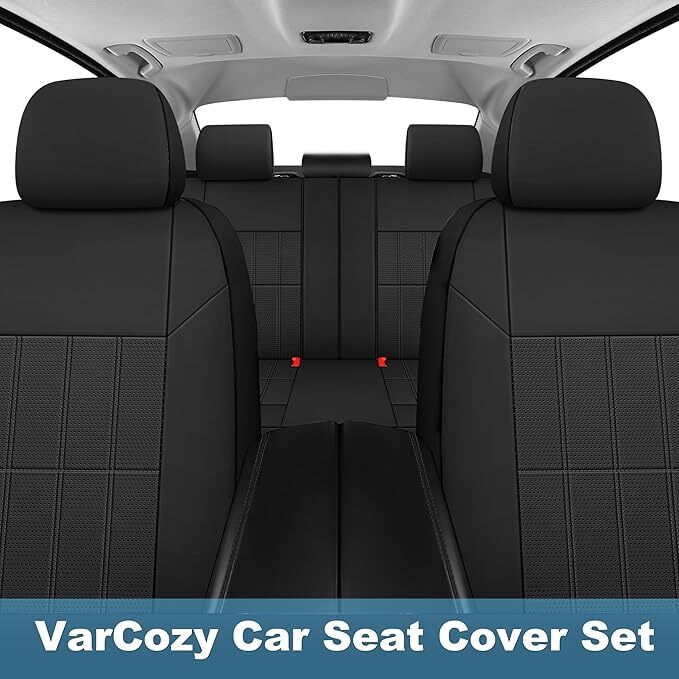 VarCozy Faux Leather Car Seat Covers Full Set, Front Seat Covers and Split Rear Bench Seat Covers for Car, Universal Seat Covers for SUV, Sedan, Automotive Interior Covers, Airbag Compatible, Black πππππ-π€π¨ππππ§π¬ π ππ§ππ₯ππππ¦: We use only high-quality microfiber PU leather and High-density foam padding, protecting the seat from possible stains and wear in all directions. Compatible with heated seats. ππ¨π‘ππ©ππ₯π¦ππ πππ§: VarCozy seat covers are designed to fit most vehicles including cars, trucks, vans and SUVs. Some additional work may be required to create a βperfectβ fit. This includes accommodations for seat belt buckles and other built-in features. ππ¦πππ πππ¦πππ‘: Front seat covers are designed to be airbag compatible. Front and rear seat covers will not affect the use of the seat belt buckle. Note that the rear seat cover needs to be cut with scissors at the seat belt buckle after installation. ππππ¦π¬ π§π’ ππ‘π¦π§πππ: Instruction is included in the package, which can be quickly installed according to the instruction. Equipped with snaps, the seat cover can be firmly fixed to the seat, preventing the seat cover from sliding. ππ¦π§π¬πππ¦π ππ‘π ππ’π ππ’π₯π§ππππ πππ¦πππ‘: Classic yet stylish designs refresh your car instantly, beautify the car interior and add new colors to the car interior. The breathable design improves ride comfort and is suitable for all seasons.