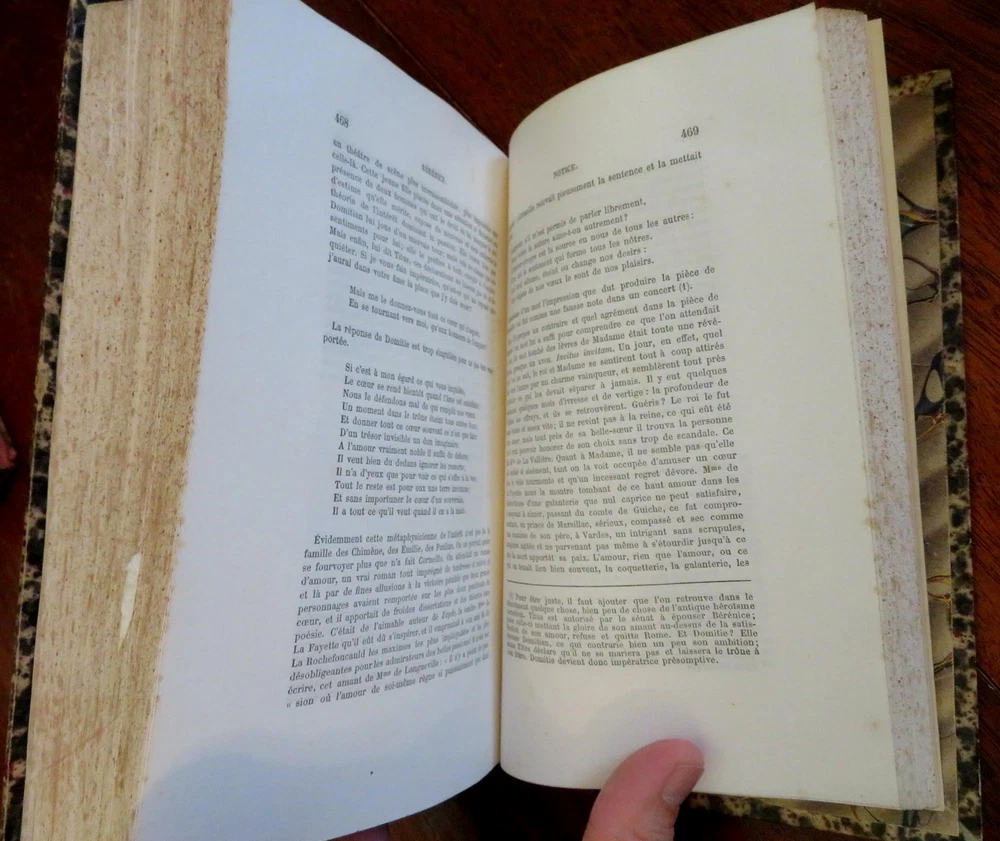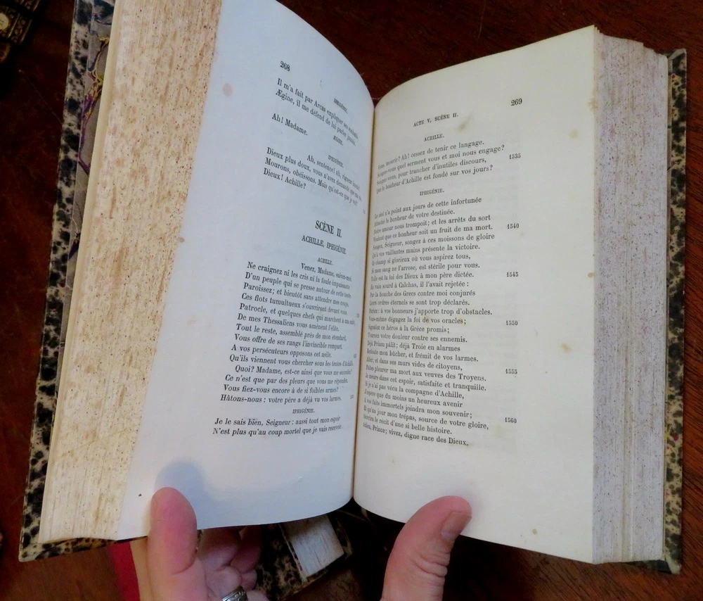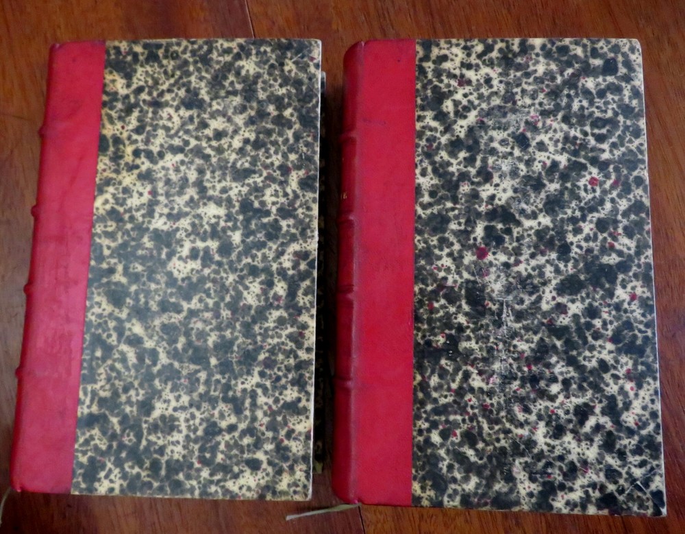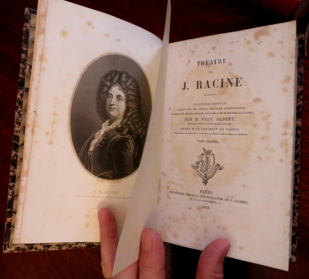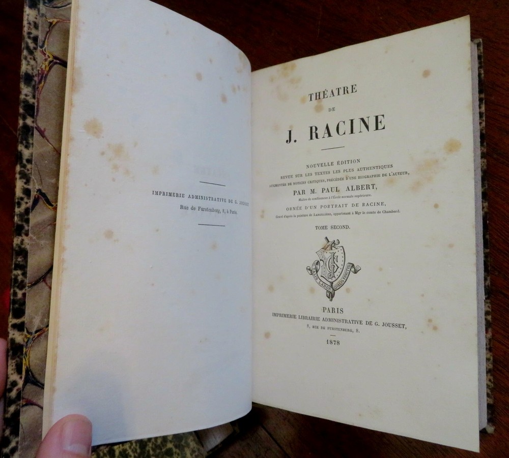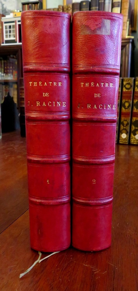 Plays of Jean Racine French Theatre 1878 2 volume leather set Plays of Jean Racine French Theatre 1878 2 volume leather set (Old Books, 19th Century Books, Leather Books, French Books, Theater, Jean Racine). Theatre de J. Racine, ed. by Paul Albert. Published 1878, Paris by G. Jousset. 2 volumes. 552, 544 pages. Text in French. Engraved frontis portrait in volume 1 protected by original tissue guard. Period 1/4 leather bindings, raised bands, gilt title lettering, marbled covers & end papers. Set is physically old and shows some signs of handling and time. Set is not new or in "new" condition. Bindings gently age worn, small remnant of sticker(?) at top of vol. 2 spine, leather rubbed but still supple, joints slightly scuffed, set remains overall attractive as an object. Text block paper is gently toned, light to moderate scattered age spotting, internally still well preserved, tight, sound. Still attractive on the shelf. Set displays a pleasing and unique age patina and is in nice antiquarian condition, any age flaws easy to overlook or forgive. Please review photos for more detail and our best attempt to convey how this antique Set survives. Books Measure c. 8 3/4" H x 5 5/8" W. [B3106].
