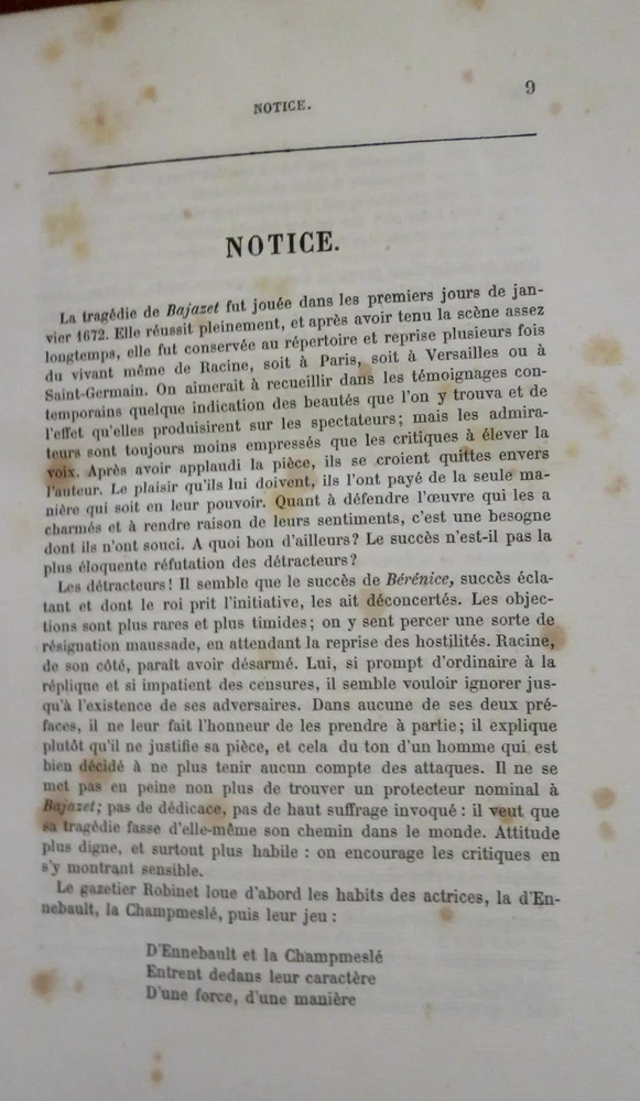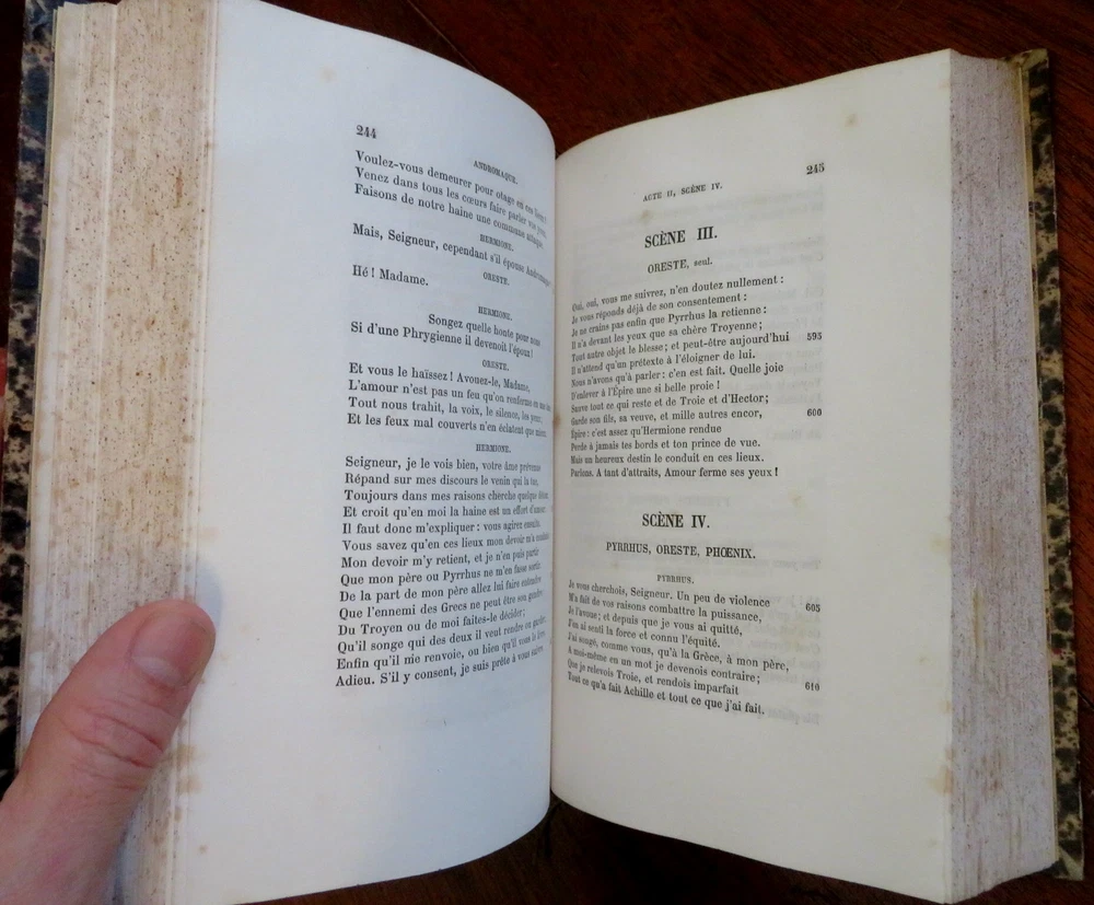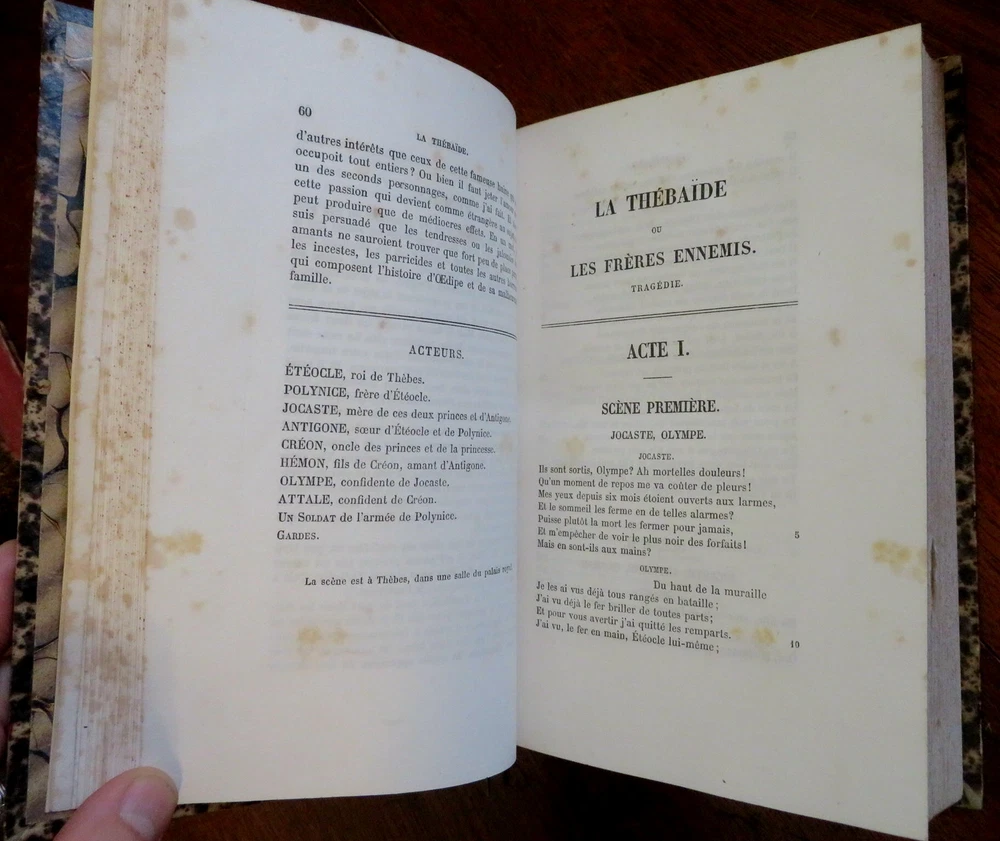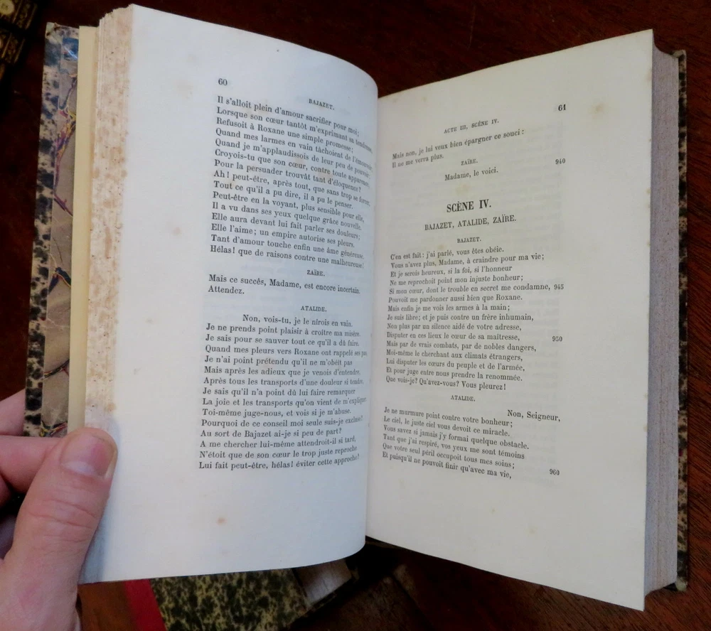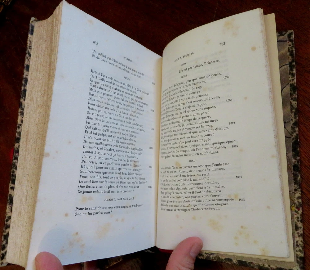 Plays of Jean Racine French Theatre 1878 2 volume leather set Plays of Jean Racine French Theatre 1878 2 volume leather set (Old Books, 19th Century Books, Leather Books, French Books, Theater, Jean Racine). Theatre de J. Racine, ed. by Paul Albert. Published 1878, Paris by G. Jousset. 2 volumes. 552, 544 pages. Text in French. Engraved frontis portrait in volume 1 protected by original tissue guard. Period 1/4 leather bindings, raised bands, gilt title lettering, marbled covers & end papers. Set is physically old and shows some signs of handling and time. Set is not new or in "new" condition. Bindings gently age worn, small remnant of sticker(?) at top of vol. 2 spine, leather rubbed but still supple, joints slightly scuffed, set remains overall attractive as an object. Text block paper is gently toned, light to moderate scattered age spotting, internally still well preserved, tight, sound. Still attractive on the shelf. Set displays a pleasing and unique age patina and is in nice antiquarian condition, any age flaws easy to overlook or forgive. Please review photos for more detail and our best attempt to convey how this antique Set survives. Books Measure c. 8 3/4" H x 5 5/8" W. [B3106].