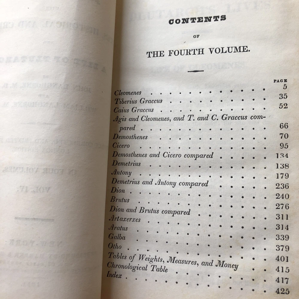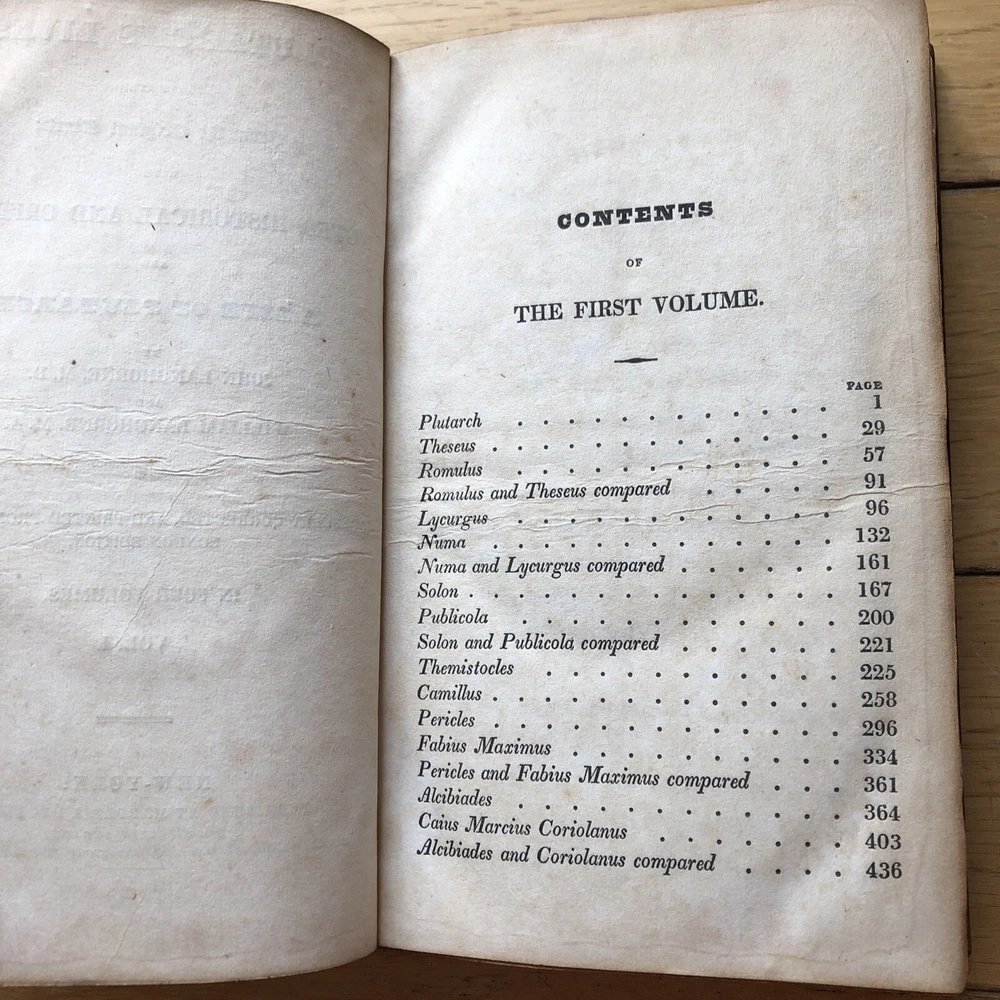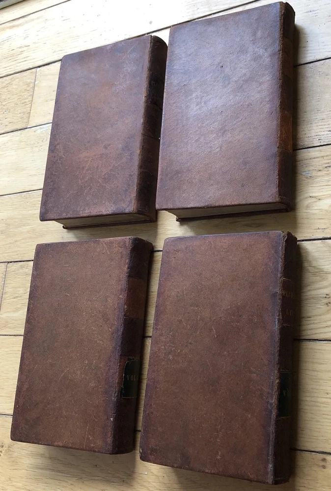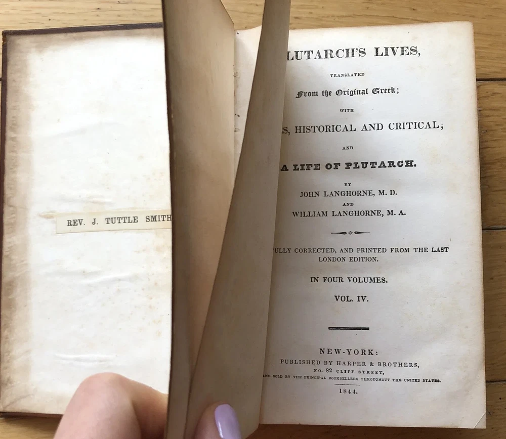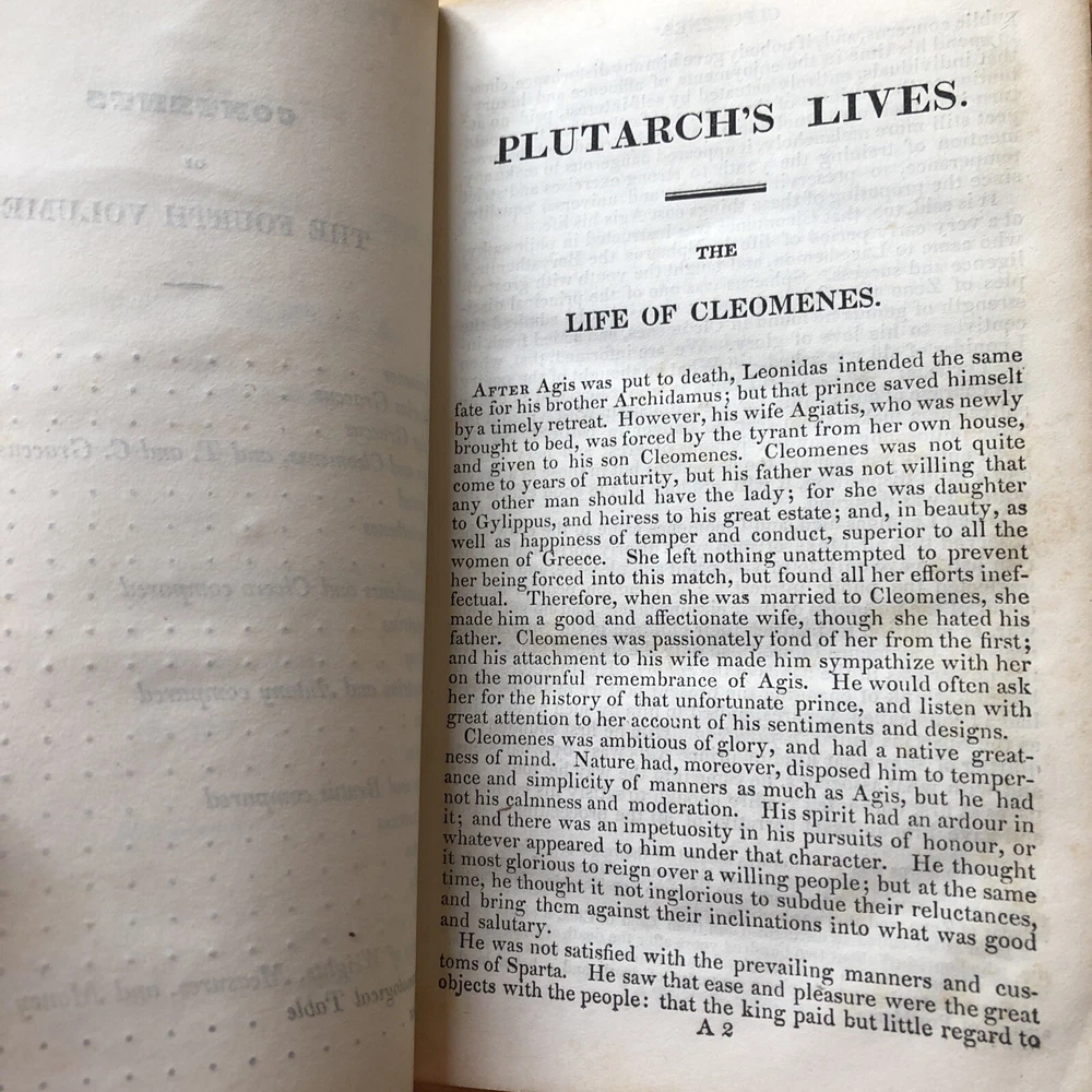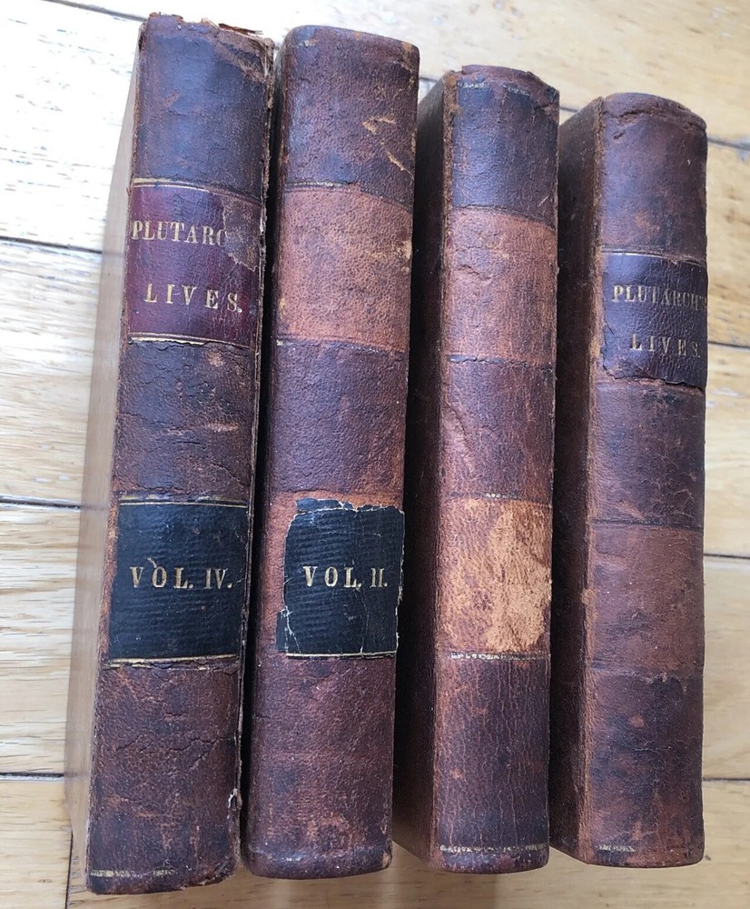 Plutarch's Lives in 4 Volumes, complete Set, by John & William Langhorne, leather, 1836/1841/1844. Complete set!! Volume I - 1836, 440 pages; Volume II- 1841, 465 pages; Volume III - 1844, 471 pages; Volume IV - 1844, 435 pages. Condition: name of the previous owner imprinted on covers and tag on 1st page, yellowing. For more details, refer to the pictures or contact us please. Will be shipped 100% insured with a tracking number!