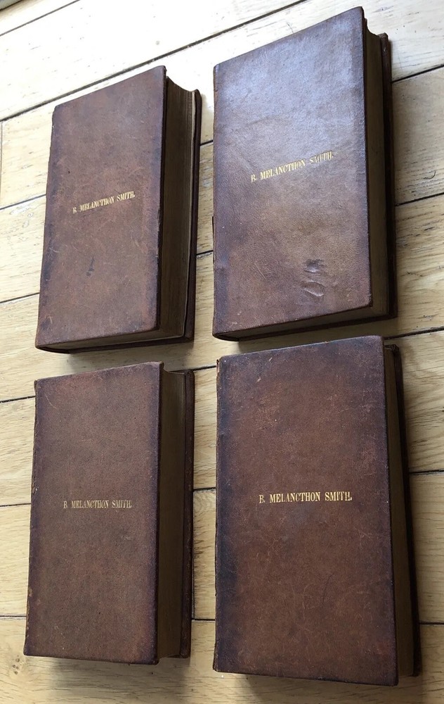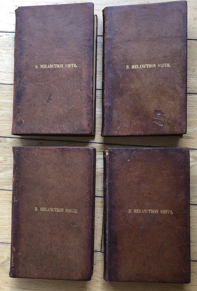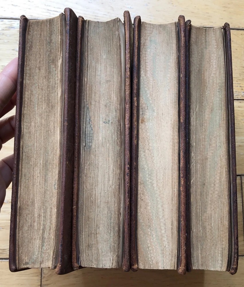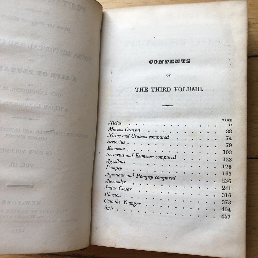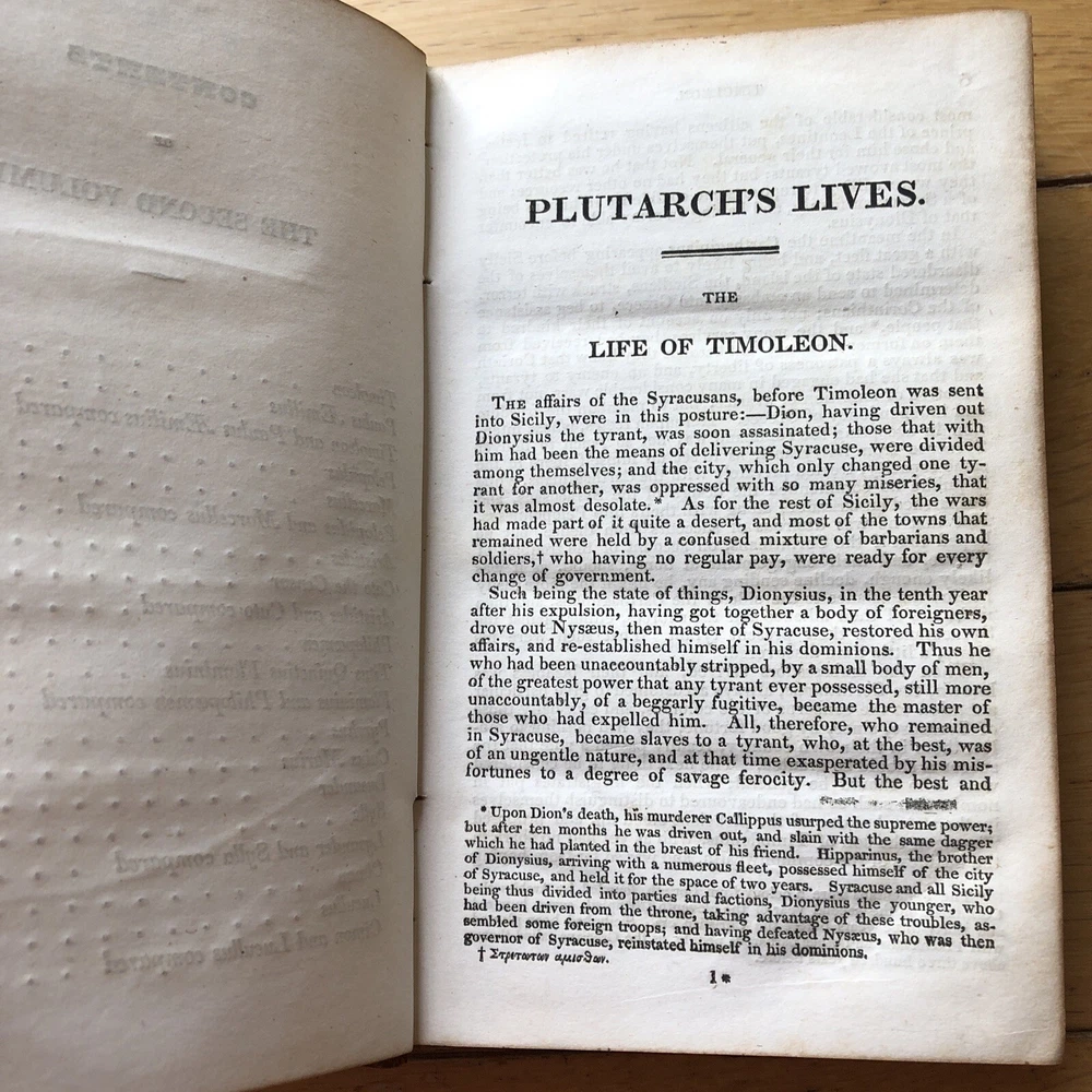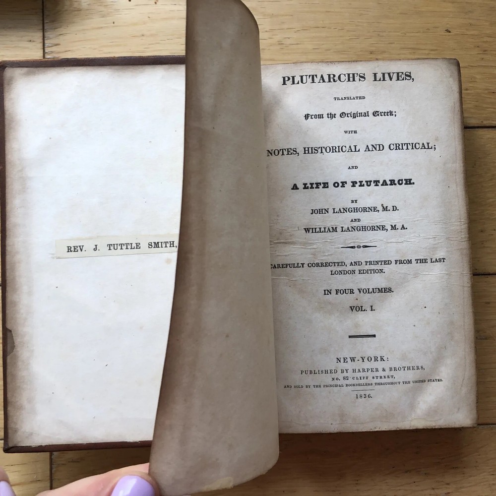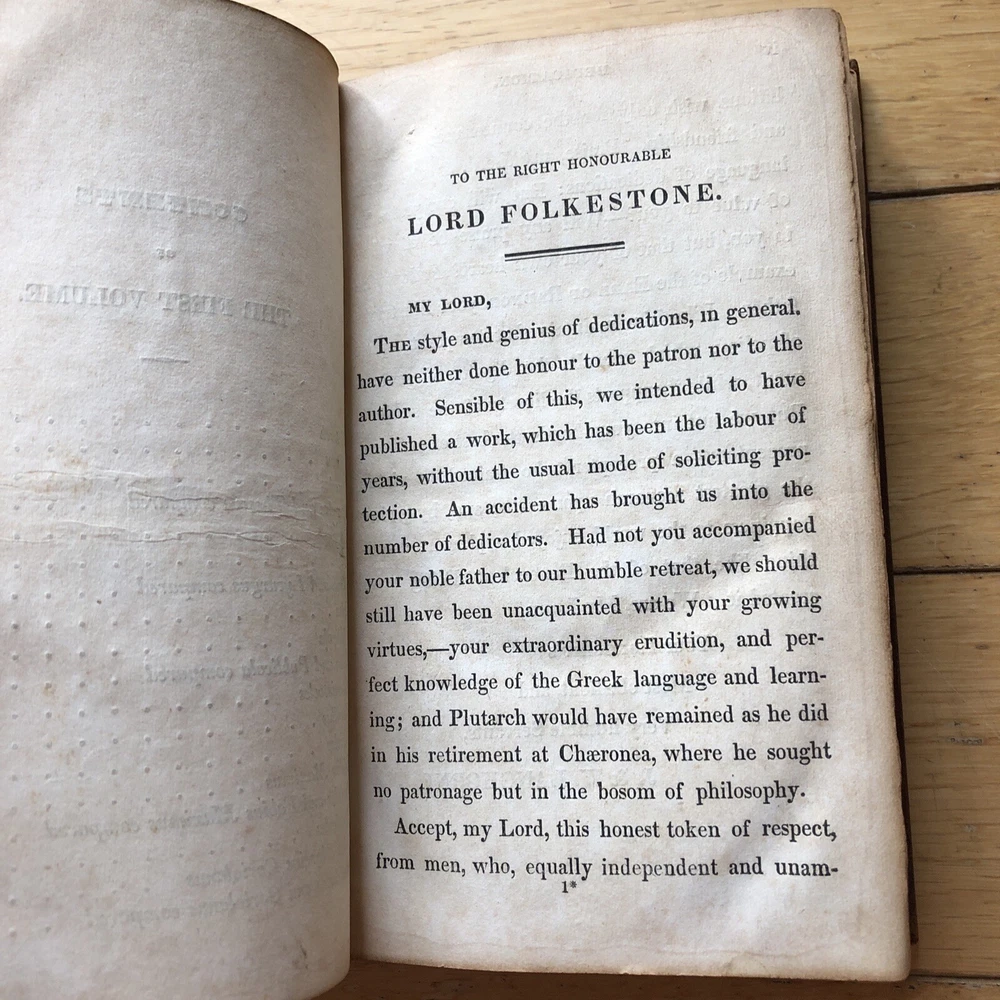 Plutarch's Lives in 4 Volumes, complete Set, by John & William Langhorne, leather, 1836/1841/1844. Complete set!! Volume I - 1836, 440 pages; Volume II- 1841, 465 pages; Volume III - 1844, 471 pages; Volume IV - 1844, 435 pages. Condition: name of the previous owner imprinted on covers and tag on 1st page, yellowing. For more details, refer to the pictures or contact us please. Will be shipped 100% insured with a tracking number!