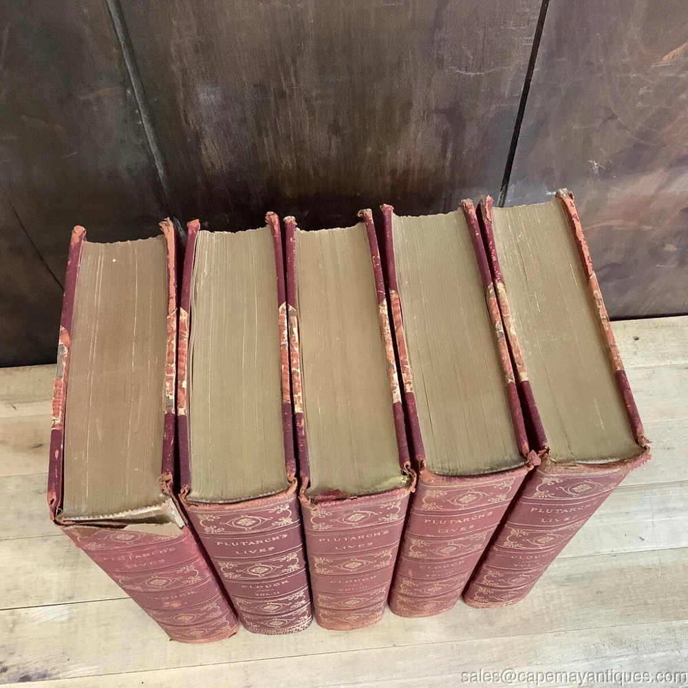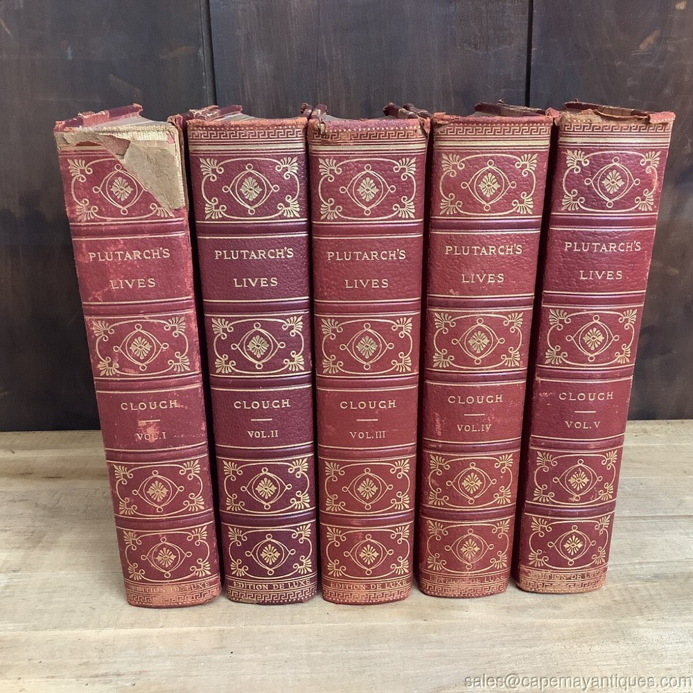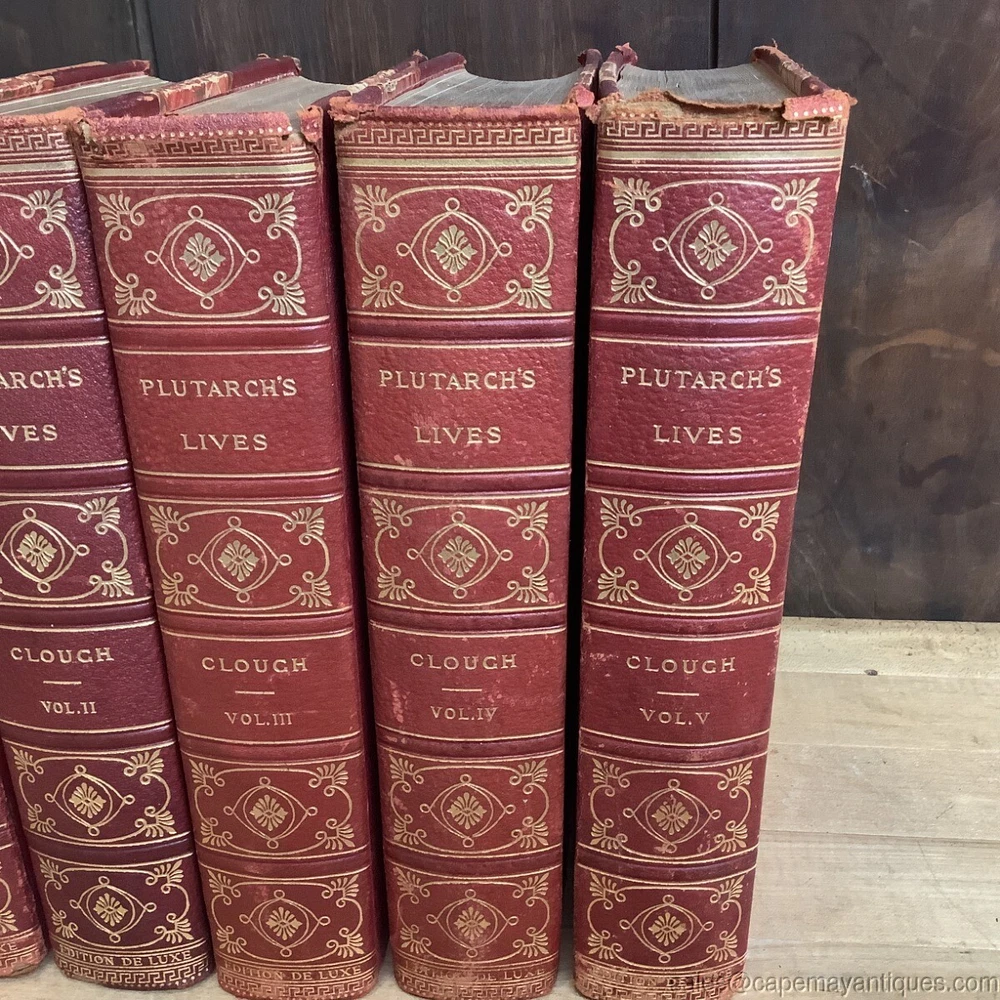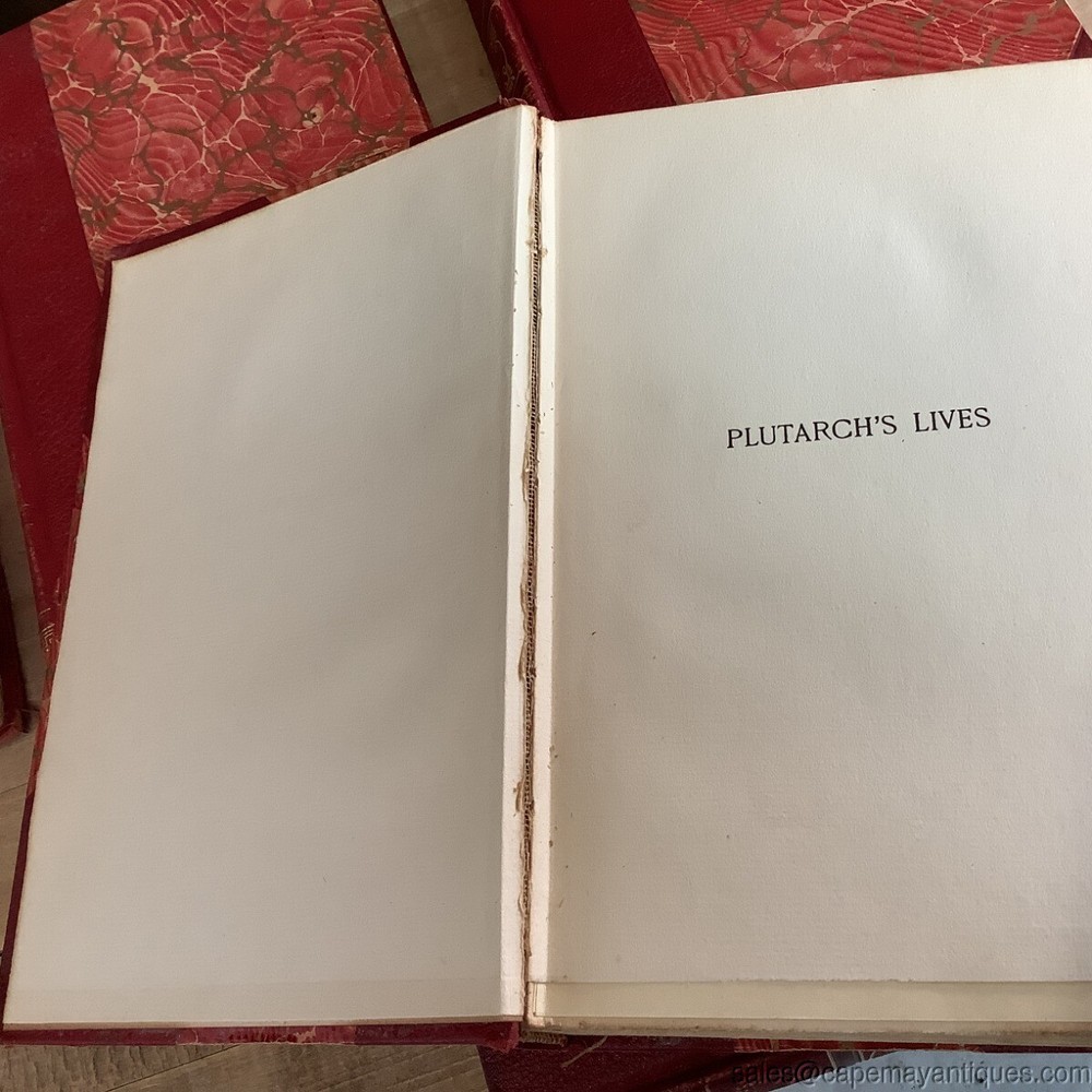 Plutarch's Lives Volumes I thru 5 De Luxe Edition Red Leather Binding Antique Description Antique set of Volume I through V. The binding is 1/4 leather wrapped as are corners front and back. Gorgeous gold lettering. The pages are the uneven thick paper. Interior red marble pattern on front and back covers plus red marbling on front and back covers. Each book is 8.5" by 5.5" and 2' deep. Gorgeous decorator or designer books. De Luxe edition. Limited to One Thousand Sets Printed for Subscribers only. Very good condition except the wear shown on covers, binding tops and bottoms from use. Pages are in good condition. Volume I, has damage to top of binding and spine is slightly split as shown in photo. Condition Notes: Very good condition except the wear shown on covers, binding tops and bottoms from use. Pages are in good condition. Payment Payment Options: Paypal Shipping Shipping Options: Domestic shipping: Weight based Shipping Charges. Domestic Carriers are: Usps Book Rate International shipping: Weight based Shipping Charges. International Carriers are: Usps Priority Intl I will ship to: United States, Worldwide Weight: 5 lbs. Shipping and Handling: Please check eBay's Shipping & Payment tab Vendio provides powerful selling automation for sellers of all sizes. Get business information that counts! - Vendio Counters are active content free.