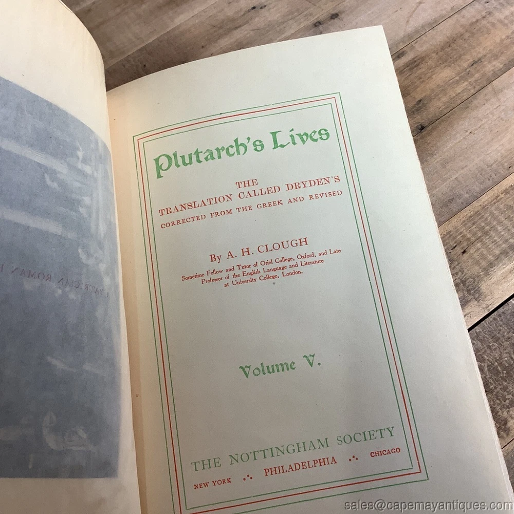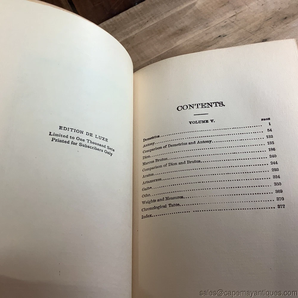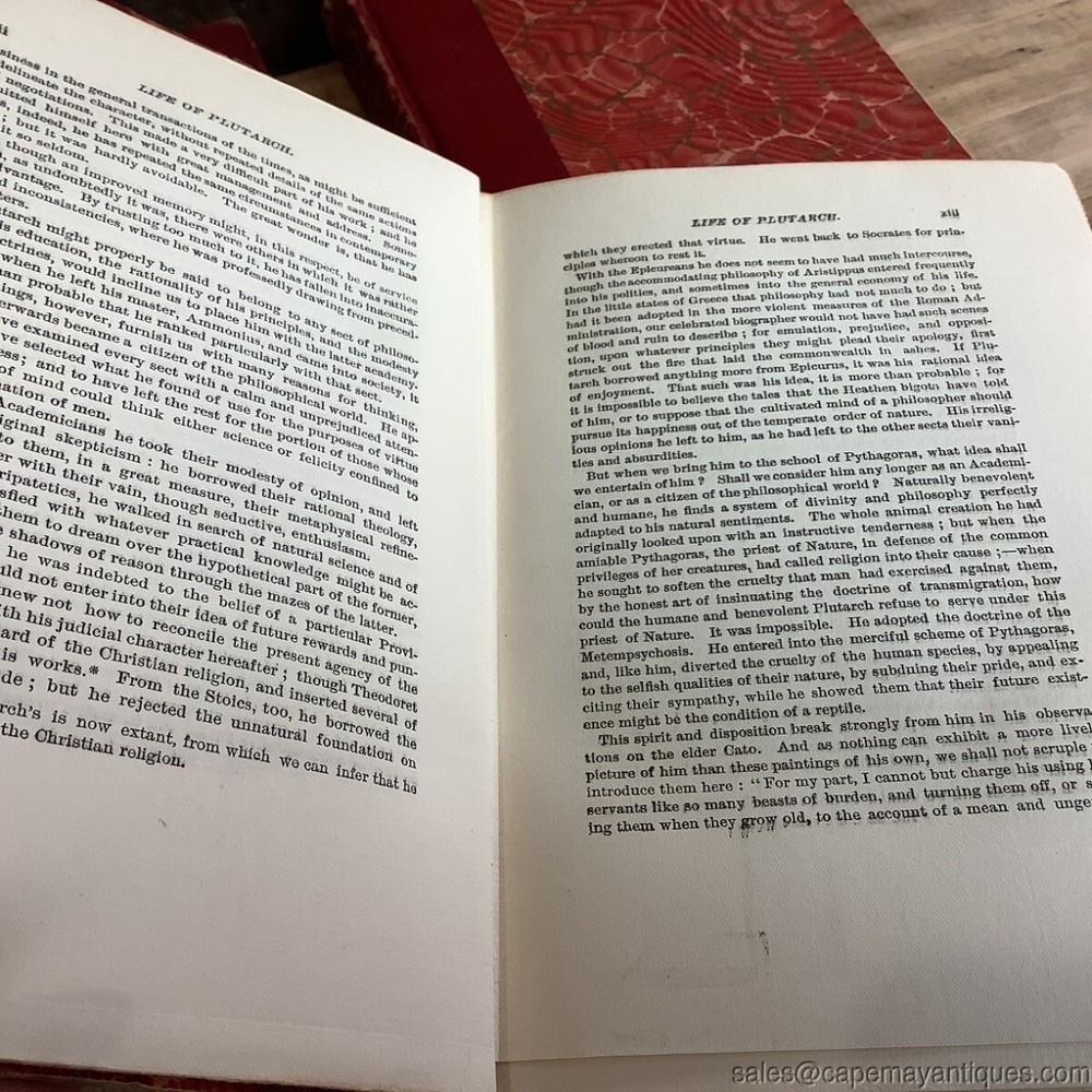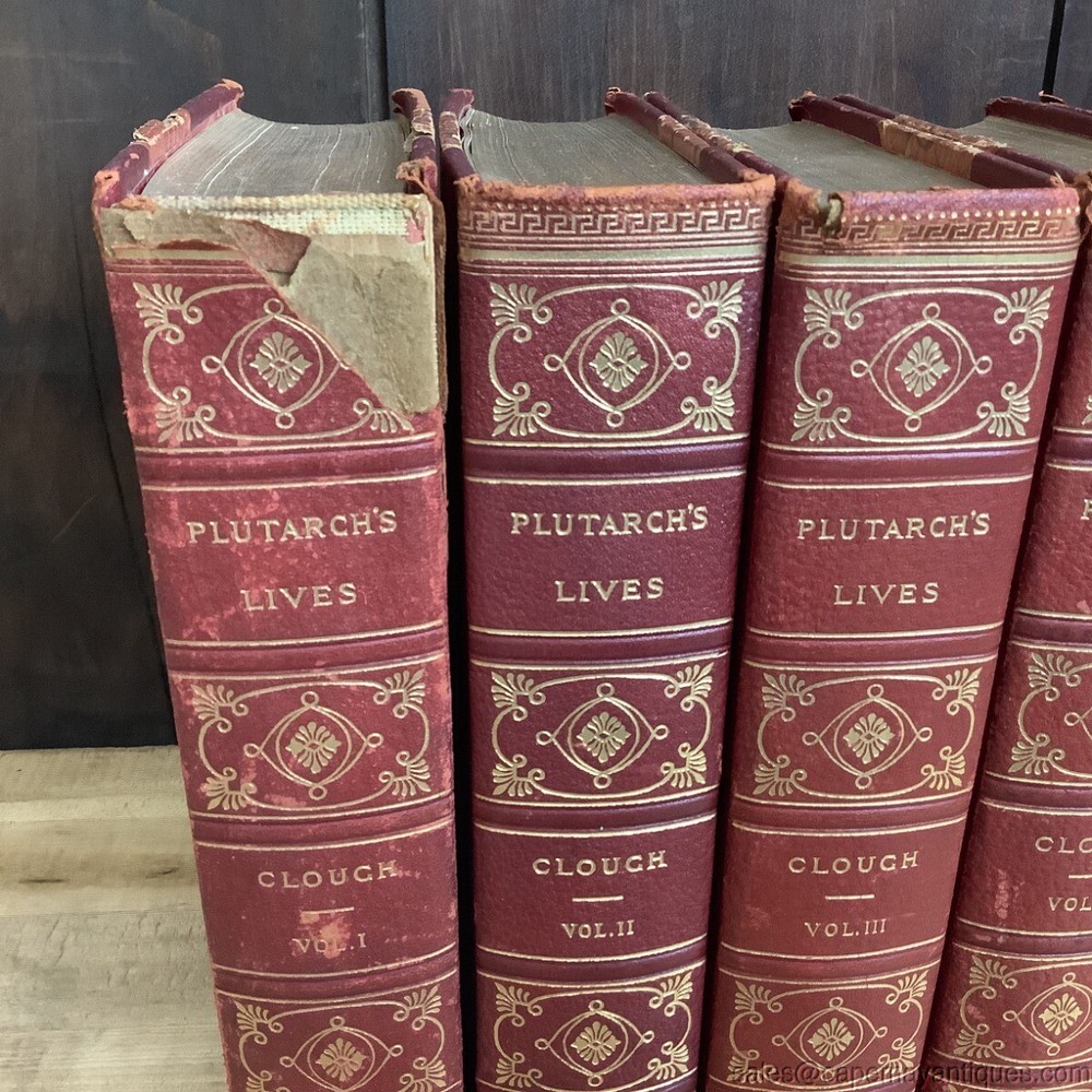 Plutarch's Lives Volumes I thru 5 De Luxe Edition Red Leather Binding Antique Description Antique set of Volume I through V. The binding is 1/4 leather wrapped as are corners front and back. Gorgeous gold lettering. The pages are the uneven thick paper. Interior red marble pattern on front and back covers plus red marbling on front and back covers. Each book is 8.5" by 5.5" and 2' deep. Gorgeous decorator or designer books. De Luxe edition. Limited to One Thousand Sets Printed for Subscribers only. Very good condition except the wear shown on covers, binding tops and bottoms from use. Pages are in good condition. Volume I, has damage to top of binding and spine is slightly split as shown in photo. Condition Notes: Very good condition except the wear shown on covers, binding tops and bottoms from use. Pages are in good condition. Payment Payment Options: Paypal Shipping Shipping Options: Domestic shipping: Weight based Shipping Charges. Domestic Carriers are: Usps Book Rate International shipping: Weight based Shipping Charges. International Carriers are: Usps Priority Intl I will ship to: United States, Worldwide Weight: 5 lbs. Shipping and Handling: Please check eBay's Shipping & Payment tab Vendio provides powerful selling automation for sellers of all sizes. Get business information that counts! - Vendio Counters are active content free.