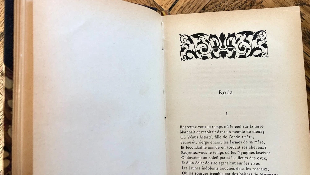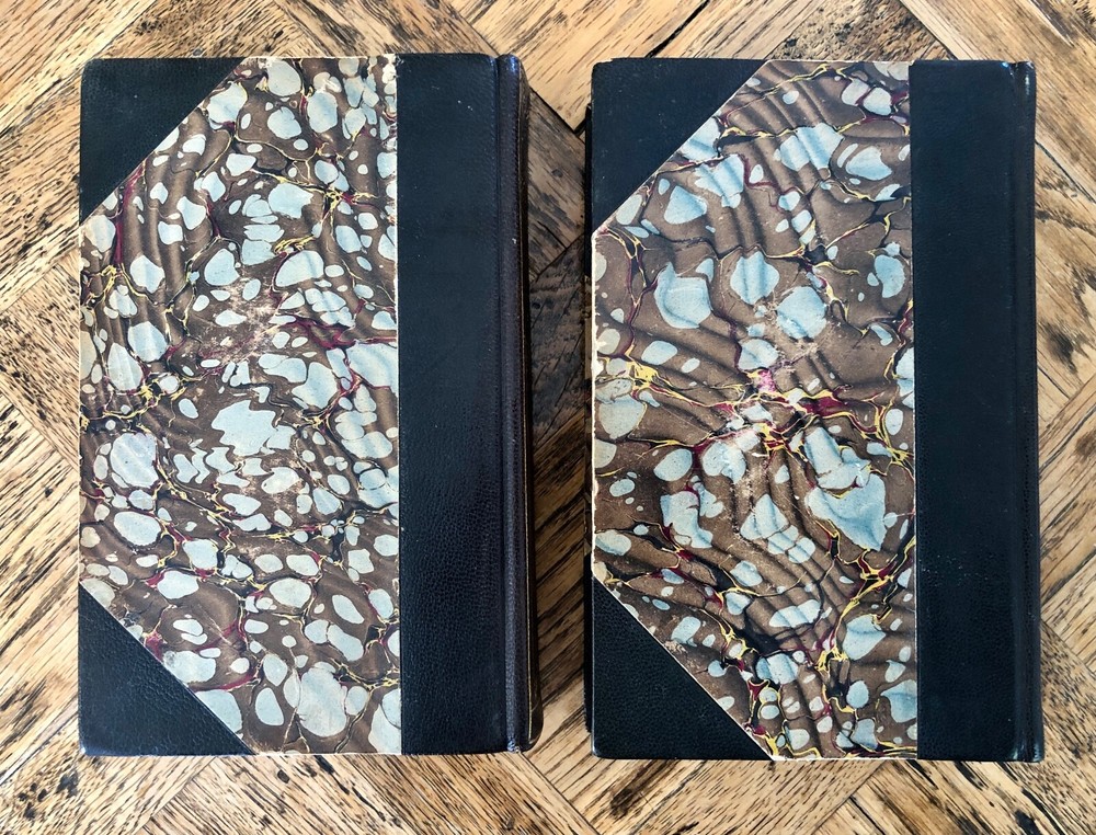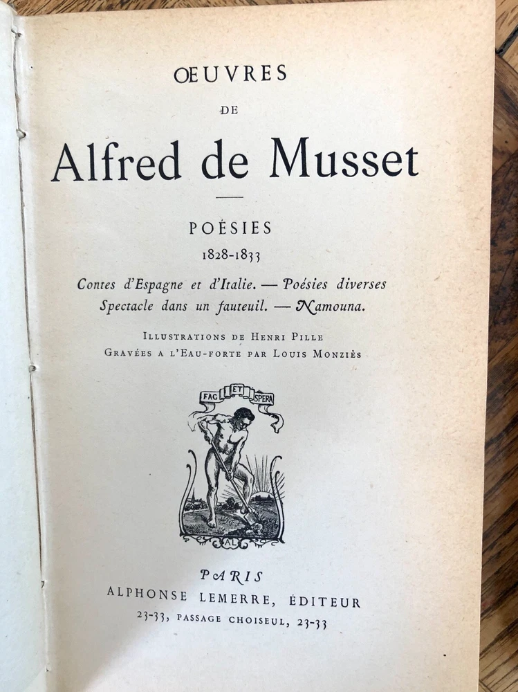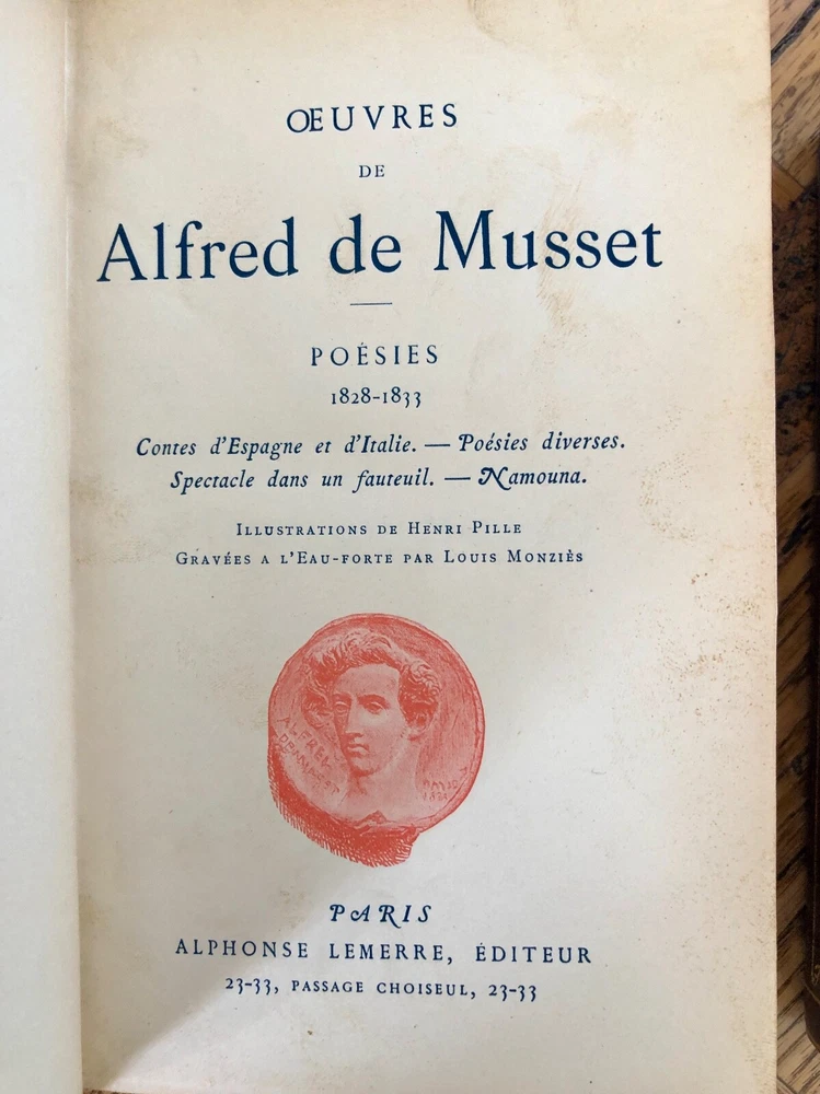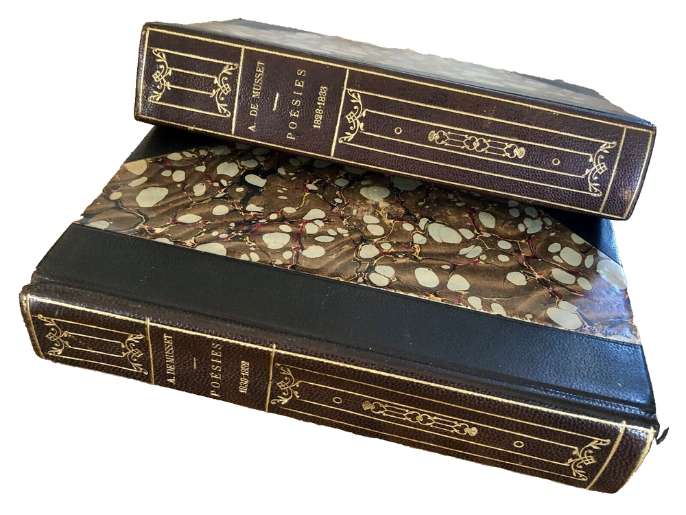 Set of Two Volumes by A. De Musset, Poesies 1828-1833, 1833-1852 Published in Paris, France, illustrated by Henri Pille (In French language) Leather bound with marbled cover decoration books that measure 4 3/4” x 7 3/8” Poesies Alfred De Musset 1828-1833 Poesies Alfred De Musset 1833-1852 These books are in very good condition despite the age . Very little wear to covers. Page yellowing and tanned edges. Bindings look great, pages are clean with no writing inside. Please view all photos for details and condition.