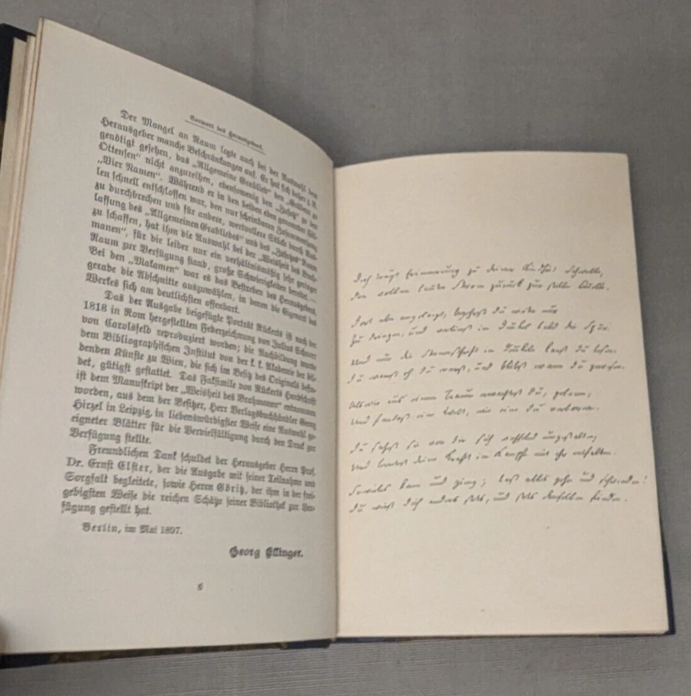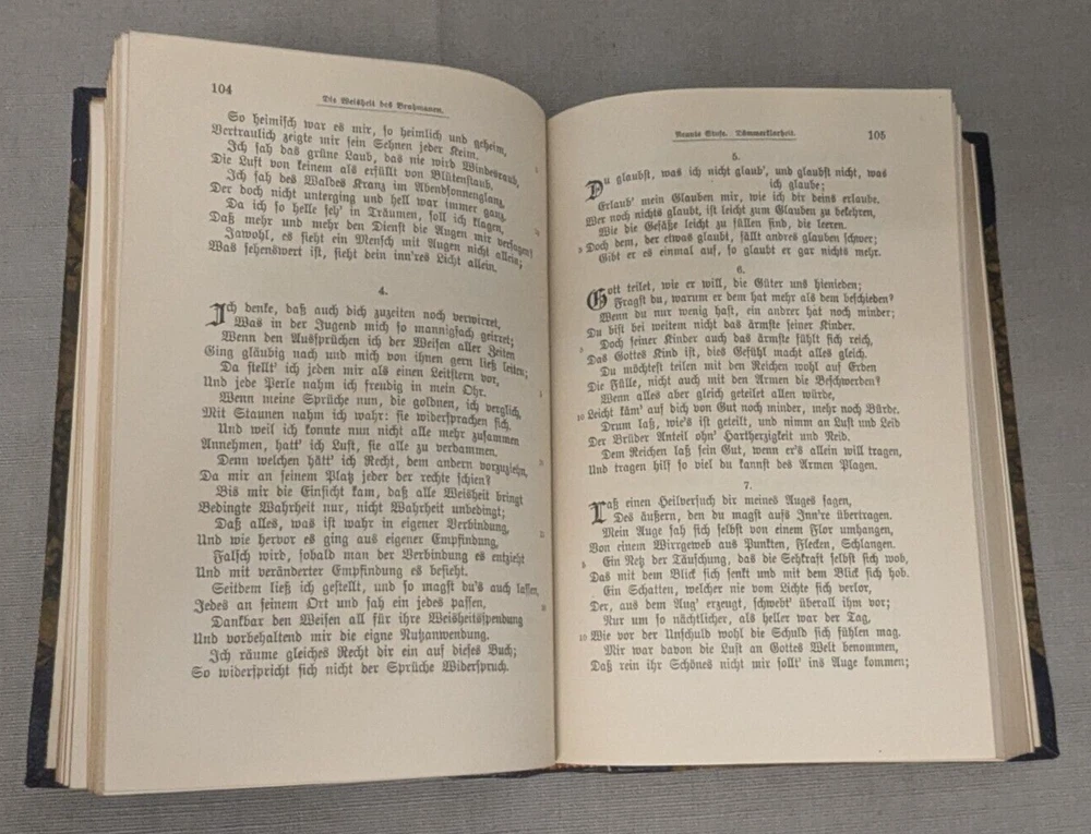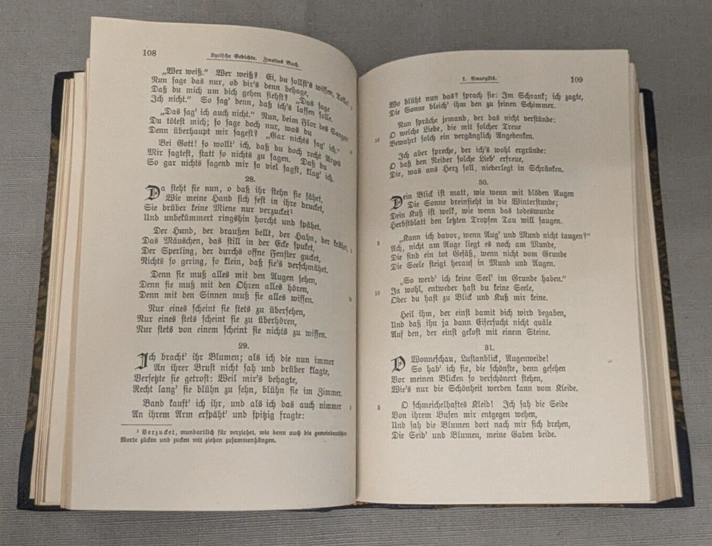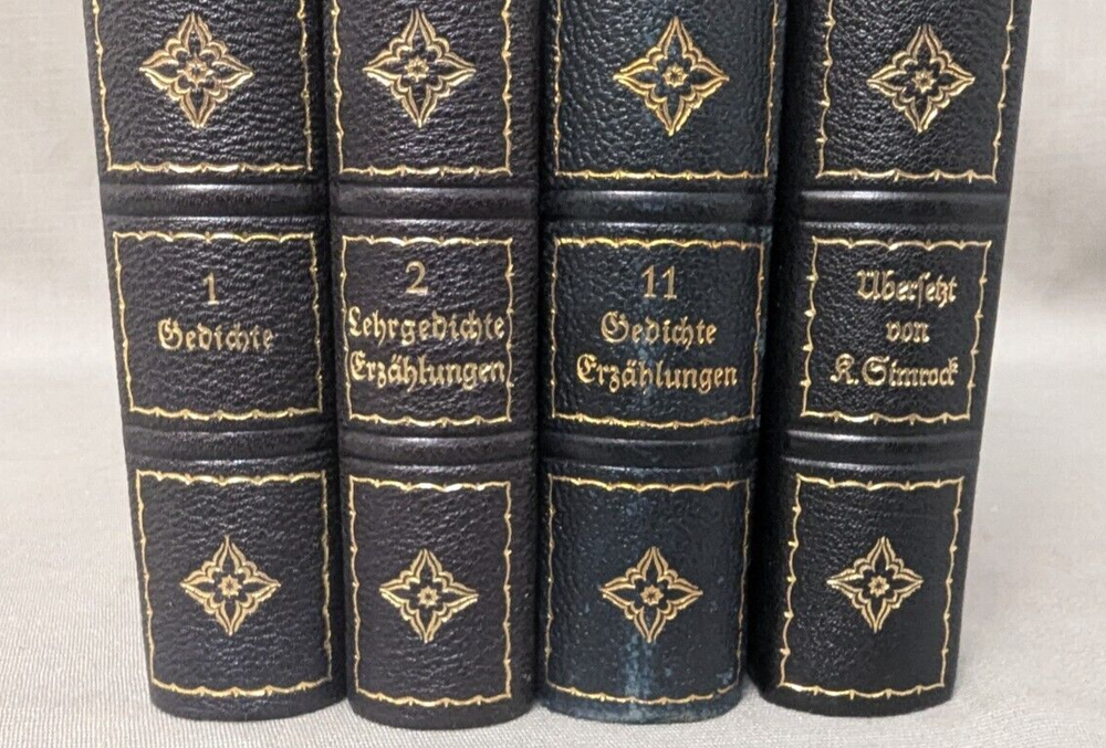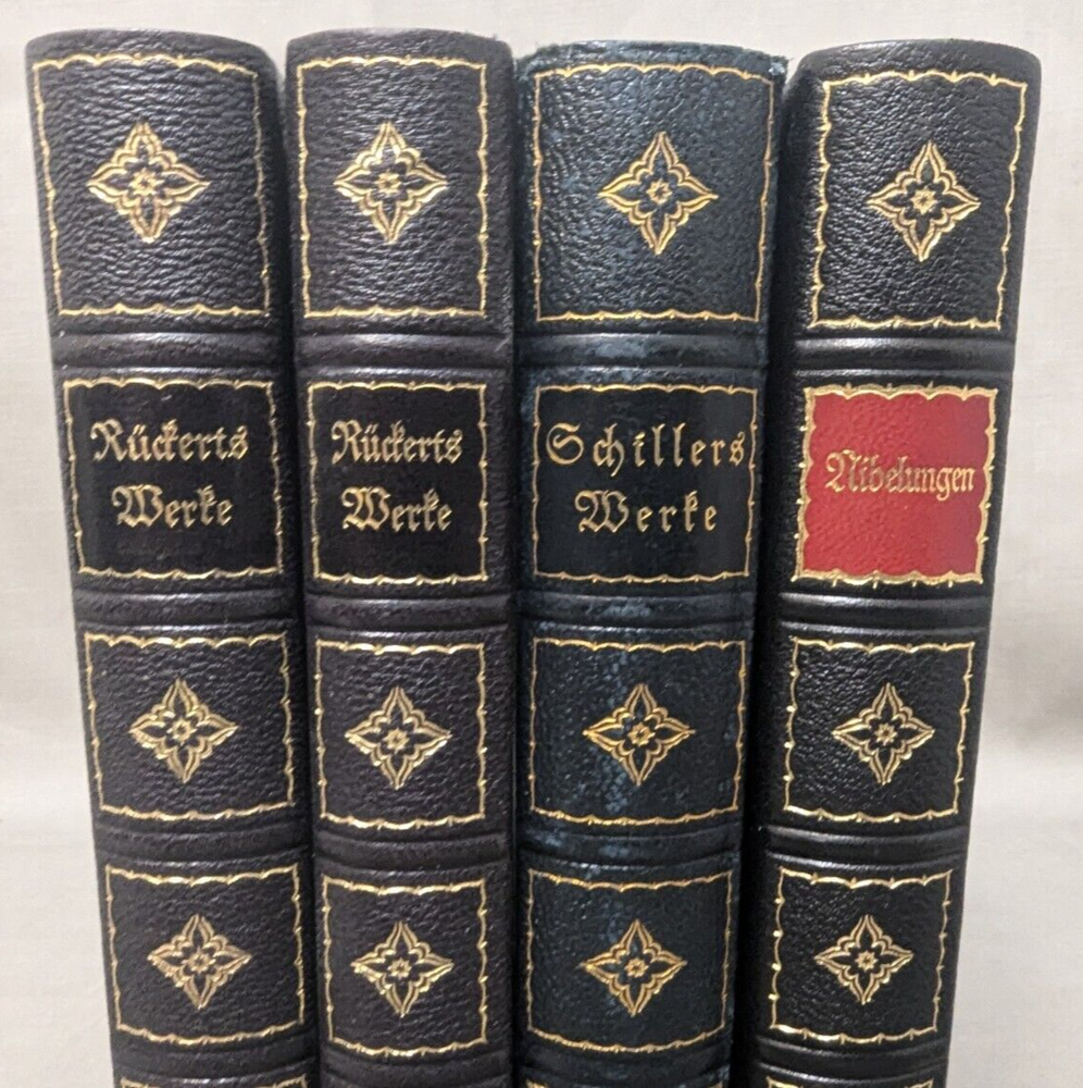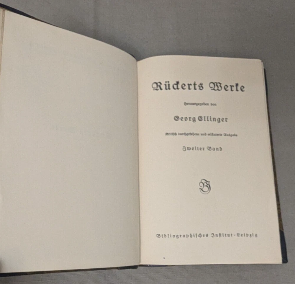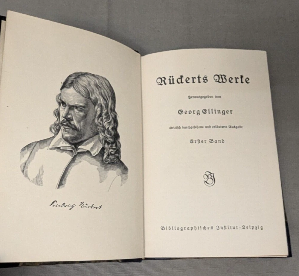 Delve into the world of poetry with the Ruckert's Werke Set, a collection that showcases the essence of German literature. This set features four volumes with luxurious leather spines and gilded tops, elevating its aesthetic appeal and making it a distinguished addition to any bibliophile's collection. Each book is crafted with the highest quality leather, offering a comfortable and timeless feel. Authored by Ruckert, a celebrated figure in poetic circles, this set is a treasure trove of Ungenlied, a masterpiece that resonates with the richness of German heritage. Immerse yourself in the language and poetry that have transcended time, with this set presenting not just a reading experience but a piece of history to cherish. In very good condition. Please view all photos for visual condition. Please, message me with any questions, before bidding or purchasing. Thank You and Good luck! Upon receiving payment, item(s) usually ship within three (3) business days (M-F). If you need your purchase shipped faster, please message me and we will be happy to rush your purchase. Payment within three (3) days of winning the auction is appreciated! Thank you for stopping by and giving me a look! Every effort is made to describe items fairly and correctly. I will be more than happy to answer any questions or send additional photos, by email during the auction. Please look at the pictures and ask questions before bidding or purchasing. Thank you.