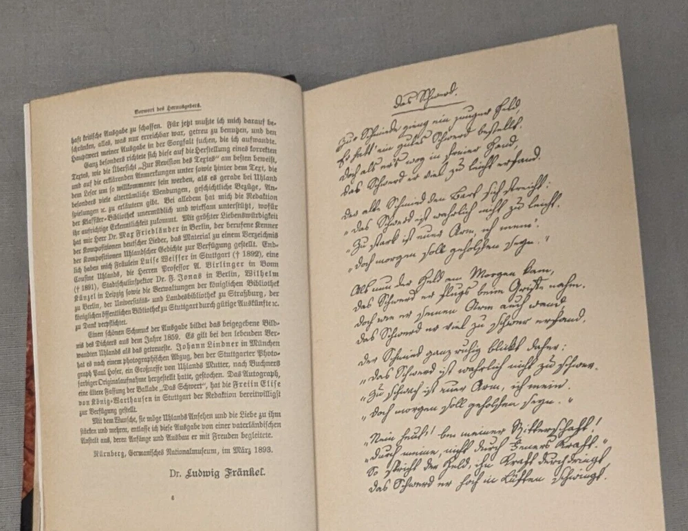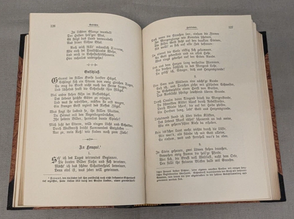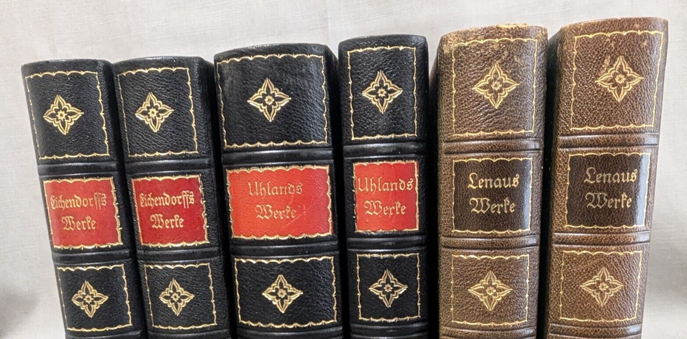 Delve into the richness of German poetry with the Lenav's Uhland's Eichendorff Werke set. This exquisite collection of six books is a testament to the timeless art of verse, compiled by some of the most celebrated authors in the language. Each book is encased in supple leather detail with gilded tops, giving the set an air of classic elegance that is sure to captivate any bibliophile. In excellent condition. Please view all photos for visual condition. Please, message me with any questions, before bidding or purchasing. Thank You and Good luck! Upon receiving payment, item(s) usually ship within three (3) business days (M-F). If you need your purchase shipped faster, please message me and we will be happy to rush your purchase. Payment within three (3) days of winning the auction is appreciated! Thank you for stopping by and giving me a look! Every effort is made to describe items fairly and correctly. I will be more than happy to answer any questions or send additional photos, by email during the auction. Please look at the pictures and ask questions before bidding or purchasing. Thank you. The works are presented in their original German, offering an authentic experience for language aficionados and collectors alike. Whether for scholarly study or aesthetic enjoyment, this set promises to be a valuable addition to any library, making it an ideal gift for lovers of literature and culture.