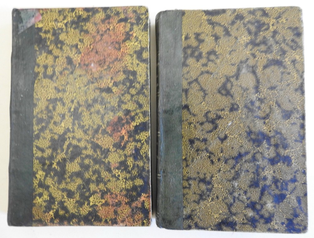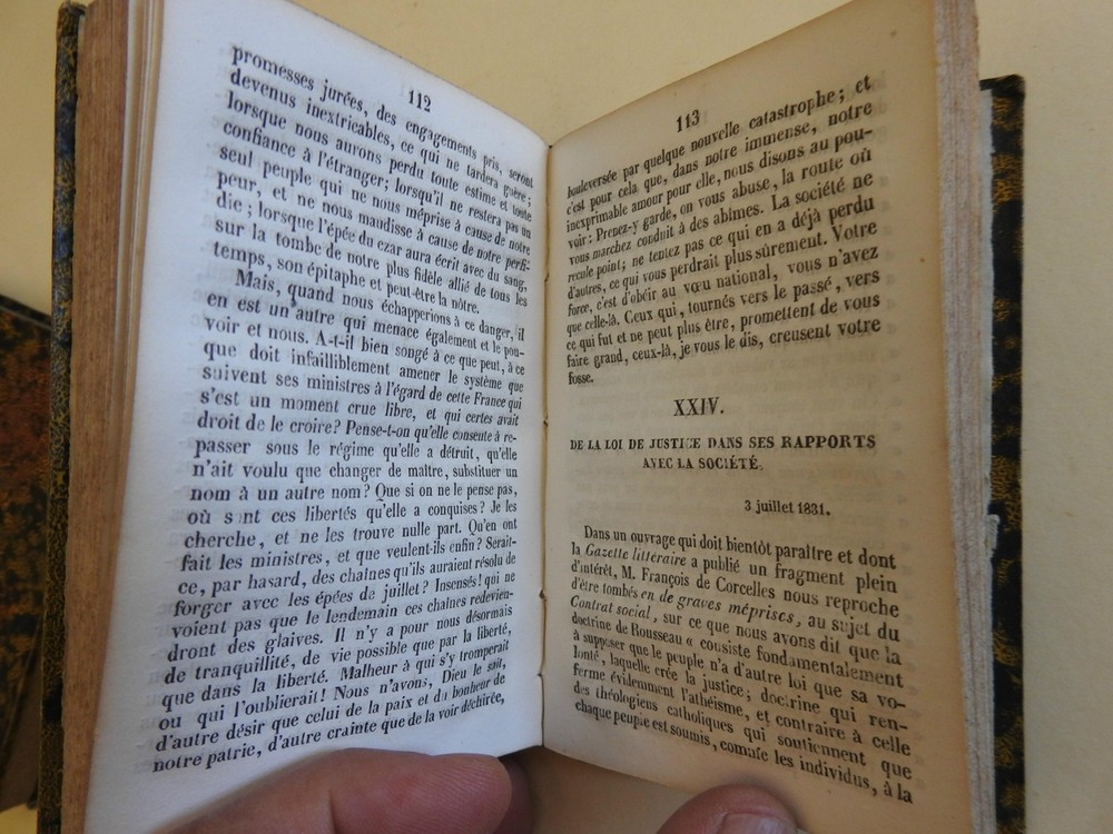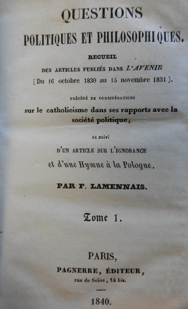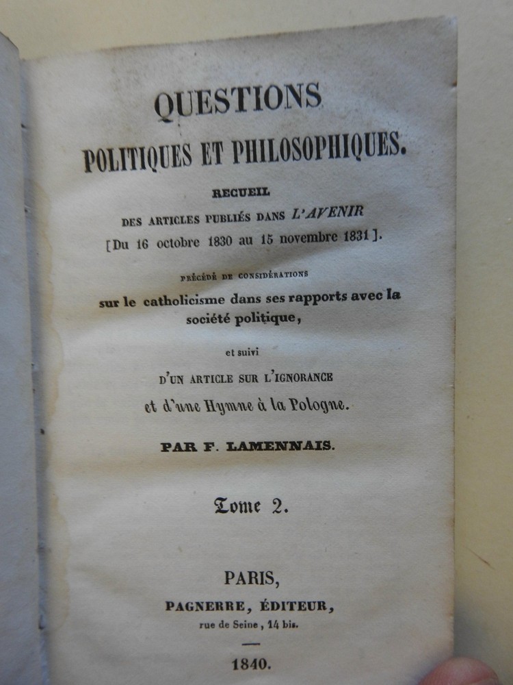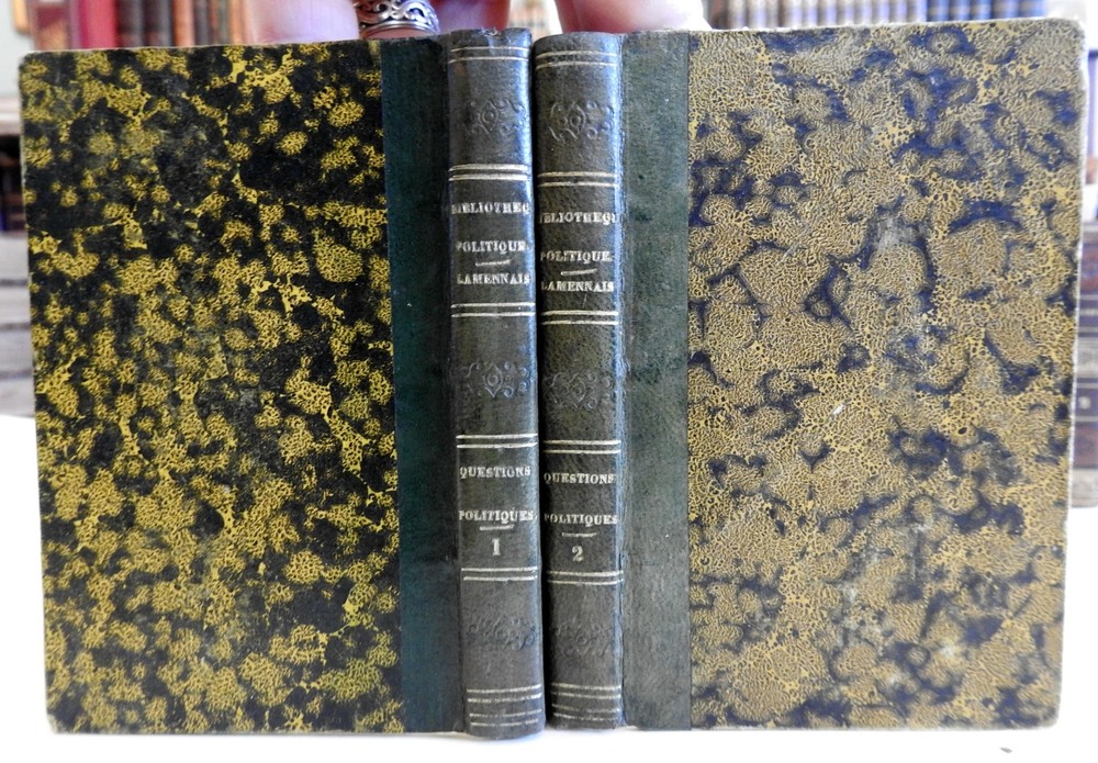 Politics & Philosophy 1840 French small leather books rare Lamennais 2 v. set Politics & Philosophy 1840 French small leather books rare Lamennais 2 v. set (Old Books, Political Philosophy, Lamennais, French Books, 19th Century Books). Qeuestions Politques et Philosophiques, by Hugues Lamennais. Published 1840, Paris by Pagnerre. 2 volumes, 202, 178 pages. Text in French. Scarce mid-19th century French philosophy set, charming small format. Period 1/4 leather bindings, smooth spines, gilt bands, gilt title lettering, marbled covers. Bindings remains clean, tight, and sound. Interior contents display scattered age spotting and toning. Book remains well preserved and attractive on the shelf. It displays a pleasing and unique age patina and is in nice antiquarian condition, the age flaws easy to overlook or forgive. Please review photos for more detail and our best attempt to convey how this antique set survives. Books Measures c. 5" H x 3 1/4" W. [B386].