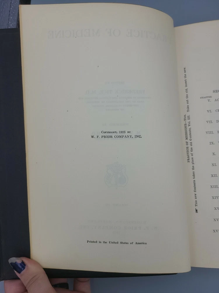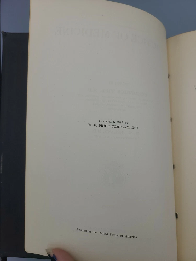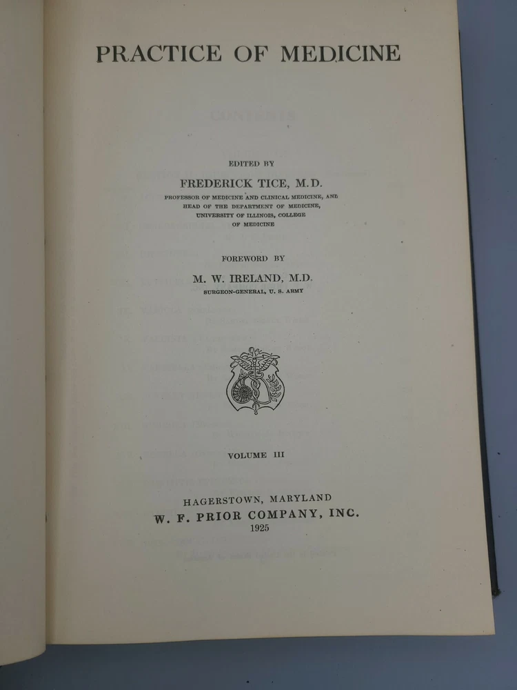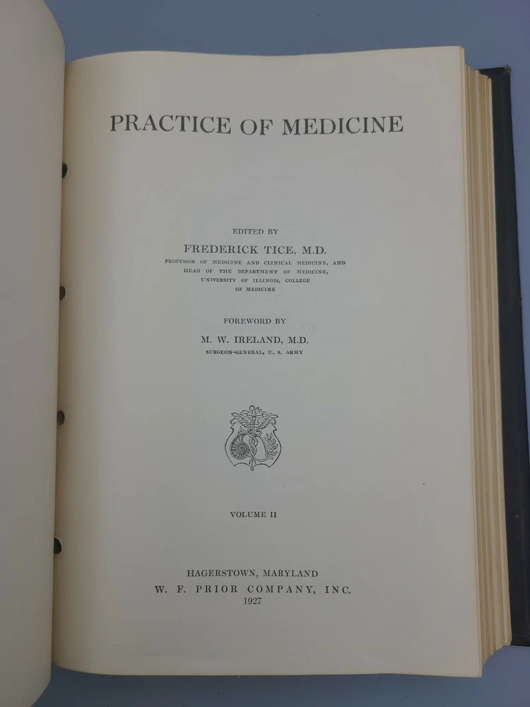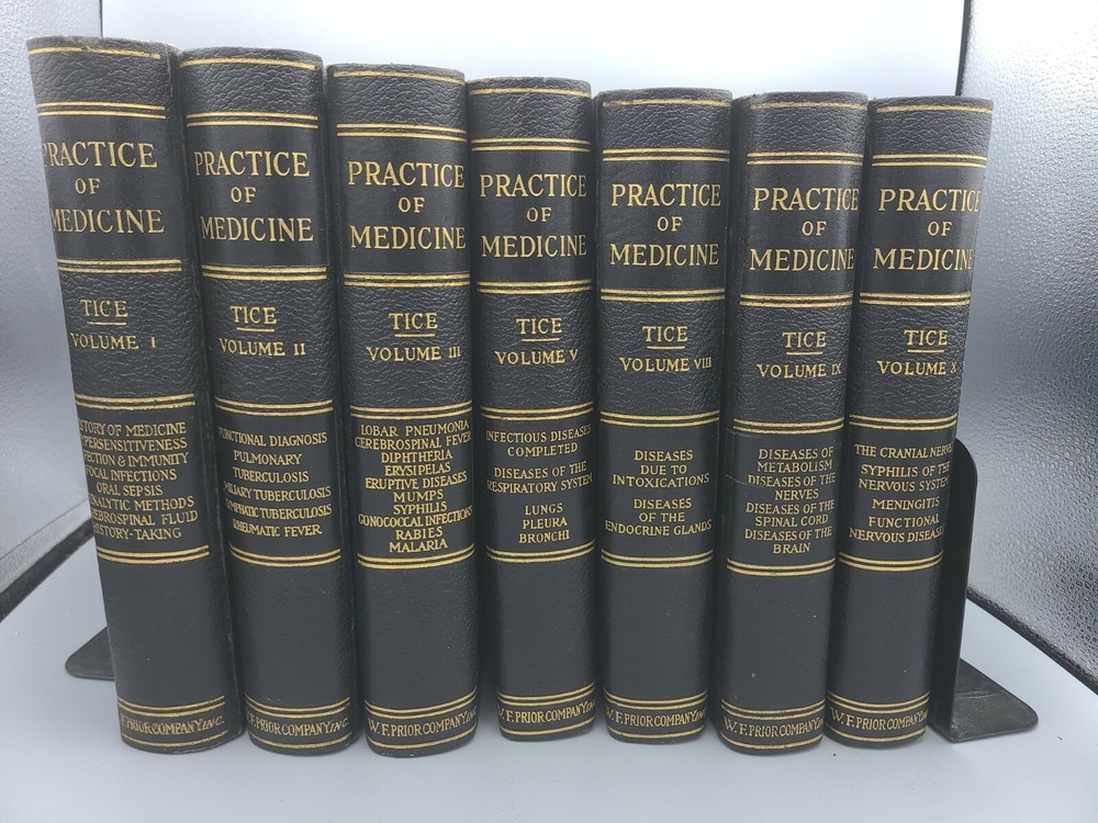 Practice of Medicine - Frederick Tice incomplete set; seven (7) out of ten (10) volumes. Pin bound; minor rusting, pictured. Overall in very good condition; minor cracking of joints in each copy, pictured. No markings or damage on pages. All volumes listed from 1925 with the exception of Volume II listed as 1927, pictured. Present Volumes: Volume I: History of medicine, Hypersensitiveness, Infection & Immunity , Focal Infections, Oral Sepsis, Urinalytic Methods, Cerebrospinal Fluid, History-Taking Volume II: Functional Diagnosis, Pulmonary, Tuberculosis, Miliary Tuberculosis, Lymphatic Tuberculosis, Rheumatic Fever Volume III: Lobar Pneumonia , Cerebrospinal Fever, Diphtheria, Erysi Pelas, Eruptive Diseases, Mumps, Syphilis, Gonococcal Infections, Rabies, Malaria Volume V: Infectious Diseases Completed, Diseases of the Respiratory System, Lungs, Pleura, Bronchi Volume VIII: Diseases Due to Intoxications, Diseases of the Endocrine Glands Volume IX: Diseases of Metabolism, Diseases of the Nerves, Diseases of the Spinal Cord, Diseases of the Brain Volume X: The Cranial Nerves, Syphilis of the Nervous System, Meningitis, Functional Nervous Diseases Please contact us for additional questions and/or pictures. PAL 5-2-4