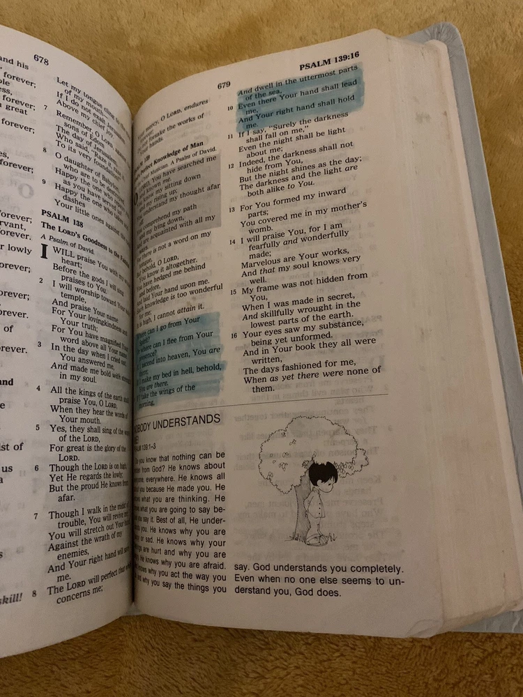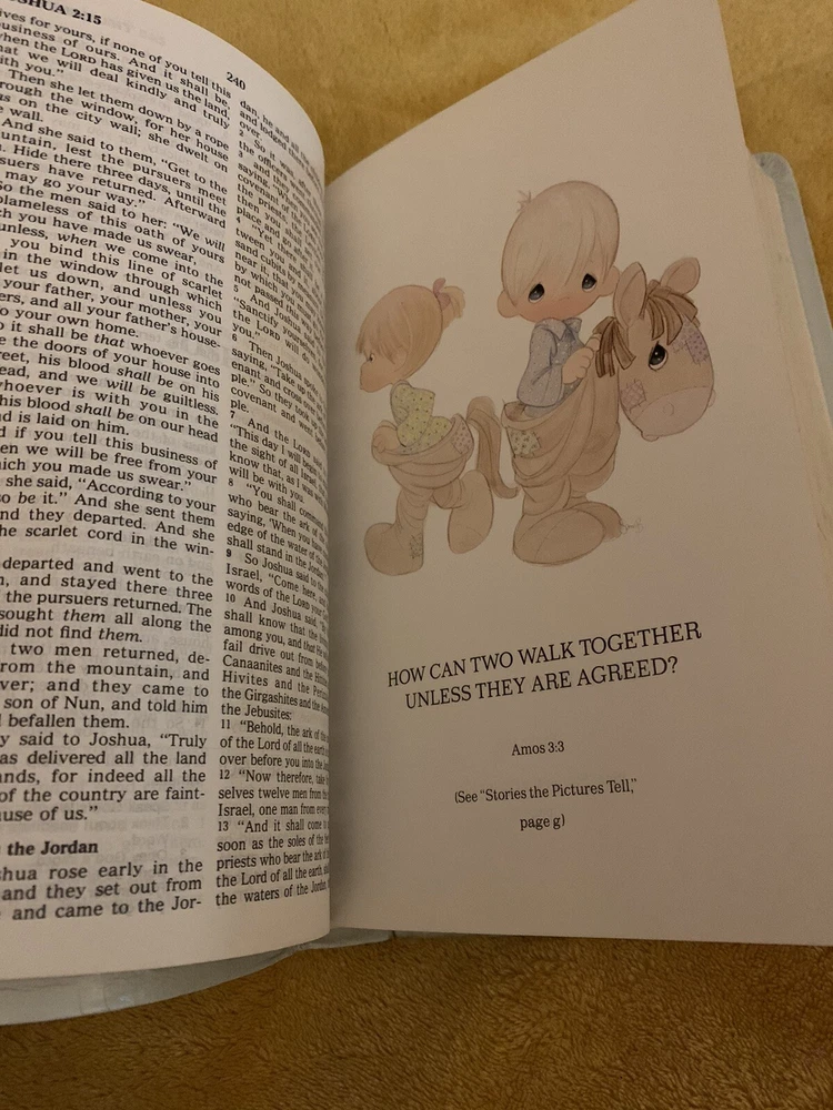 This beautiful Precious Moments Bible is a must-have for anyone interested in religion and spirituality. The book features a Faux Leather Bound cover in Blue Mist, with exquisite illustrations that will enhance your reading experience. Measuring 5.5 inches in length, 9 inches in height, and 1.5 inches in width, this keepsake edition is perfect for ages ranging from 2-12. Some signs of wear Some highlighting Cover has some worn areas No torn, missing or ripped pages