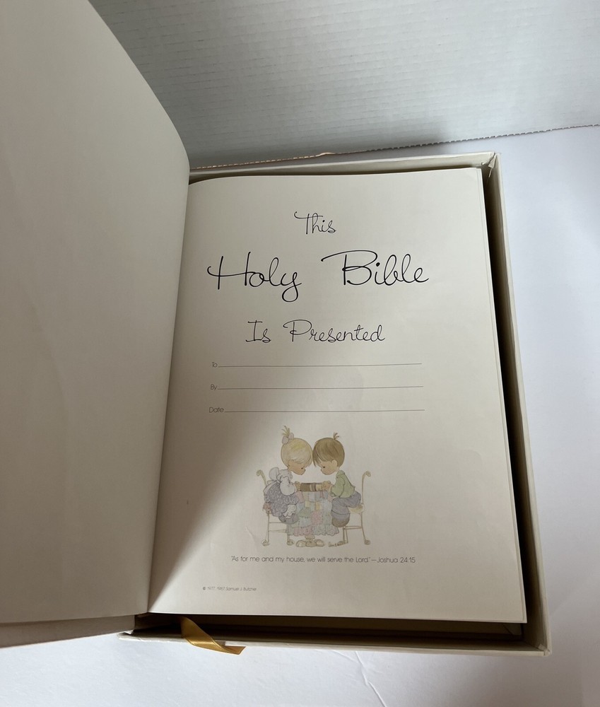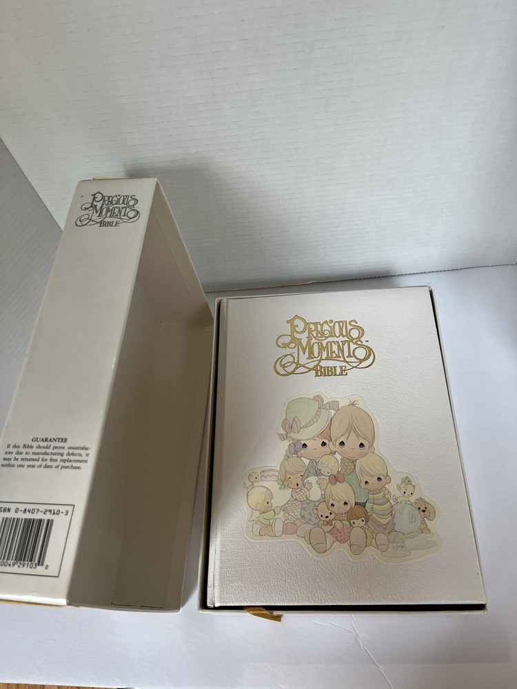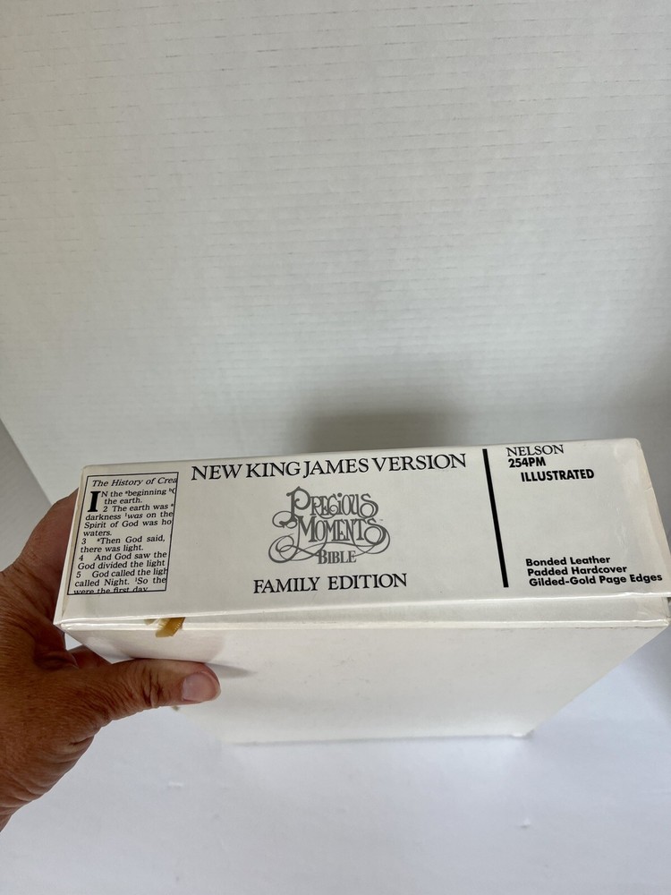 This Precious Moments Bible Family Edition published by Thomas Nelson is a collector's item that features a beautiful leather-bound cover with gilded gold page edges. It is a New King James red letter version The book is illustrated and comes in a special box. There is no writing in the Bible, it is clean. Small creasing on cover.