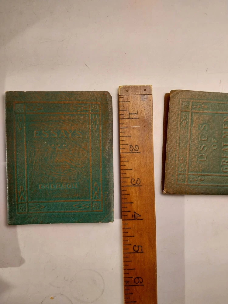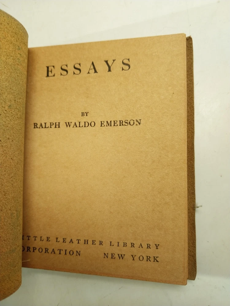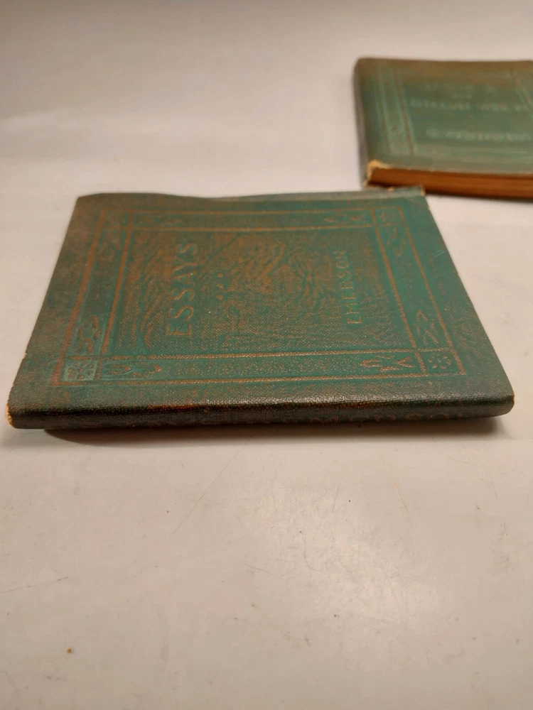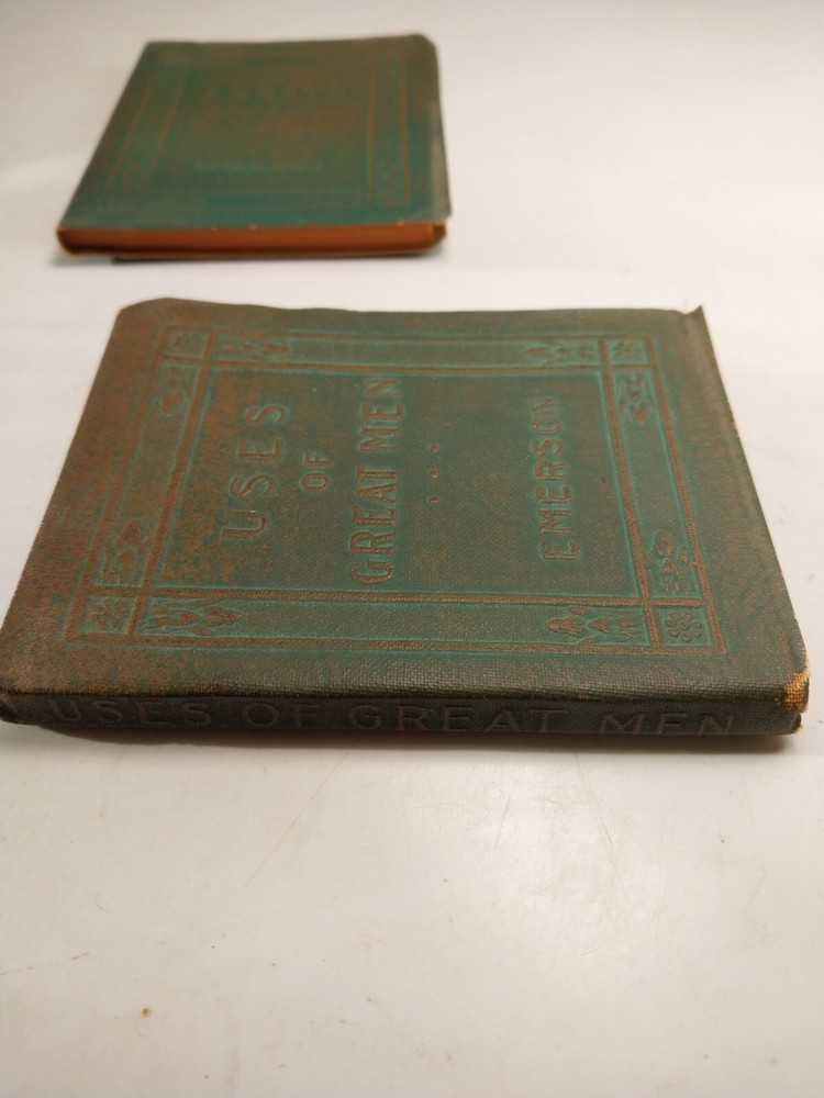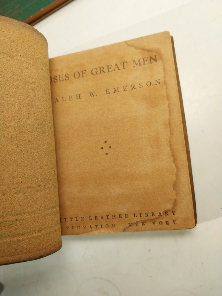R W Emerson Essays & Uses of Great Men Little Leather Library Miniature Book Set Book set measures approximately 3" x 4" and is in good used condition with some signs of age, use, and wear; age related toning to pages, please see photographs for condition details.