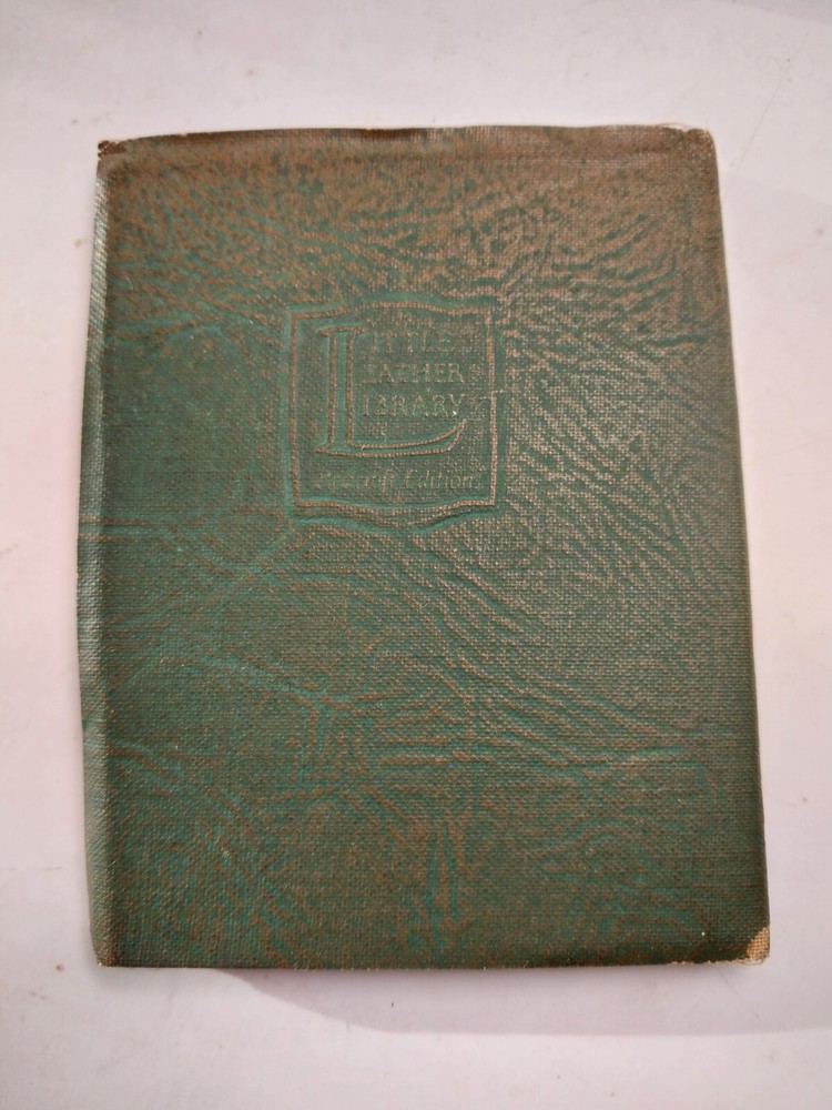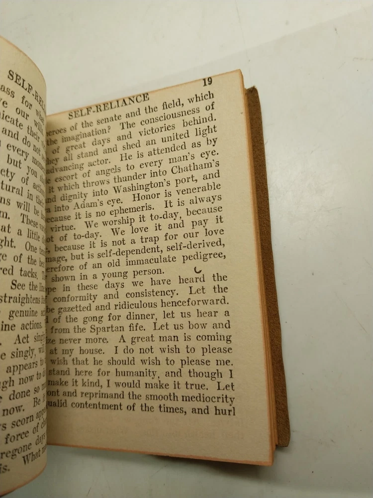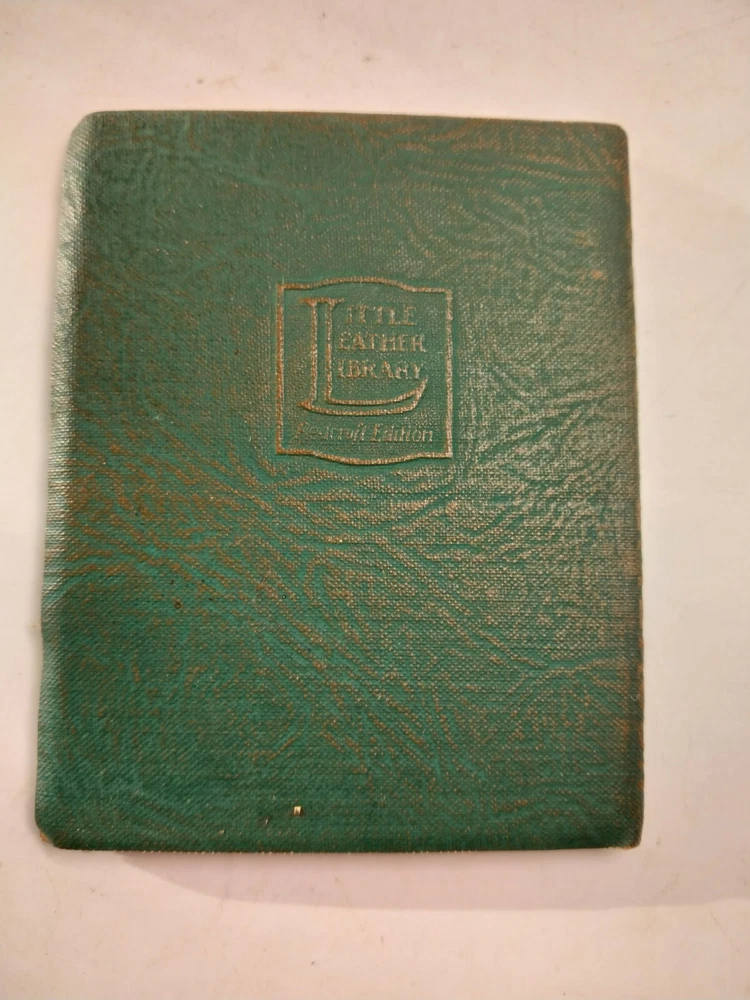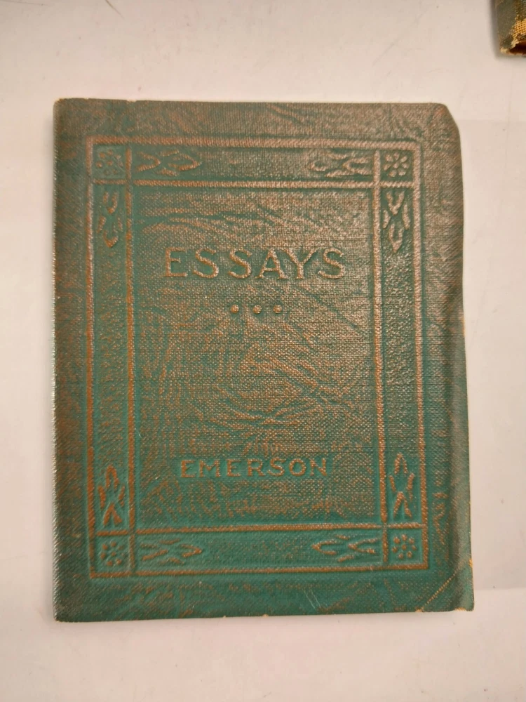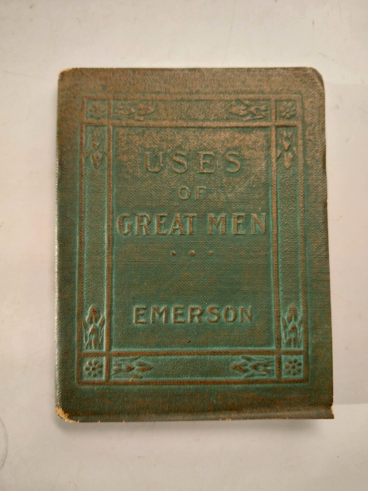 R W Emerson Essays & Uses of Great Men Little Leather Library Miniature Book Set Book set measures approximately 3" x 4" and is in good used condition with some signs of age, use, and wear; age related toning to pages, please see photographs for condition details.