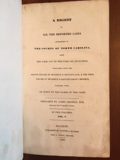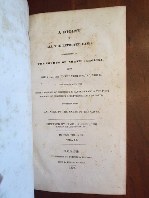 A digest of all the reported cases determined in the courts of North Carolina : from the year 1778 to the year 1837, inclusive, concluding with the second volume of Devereux & Battle's law, & the first volume of Devereux & Battle's equity reports : together with an index to the names of the cases By James Iredell Published: Raleigh : Turner & Hughes, 1839. Two volumes. 972 pp. A married set, each in its original or early leather binding, Boards loosening on Volume I, secure on Volume II. Exceptionally SCARCE set. I've done my best to describe the book, but if you have additional questions, please don't hesitate to send me an e-mail.