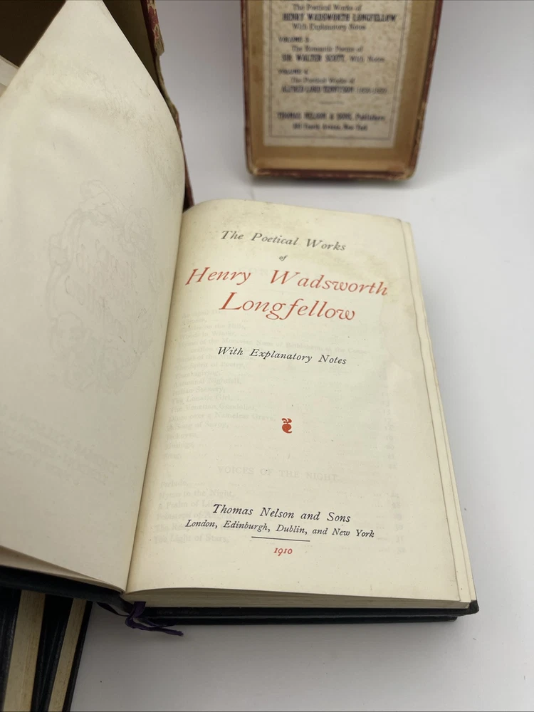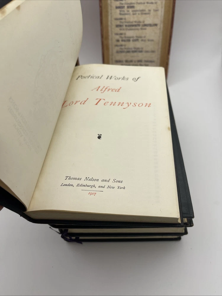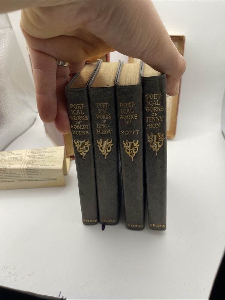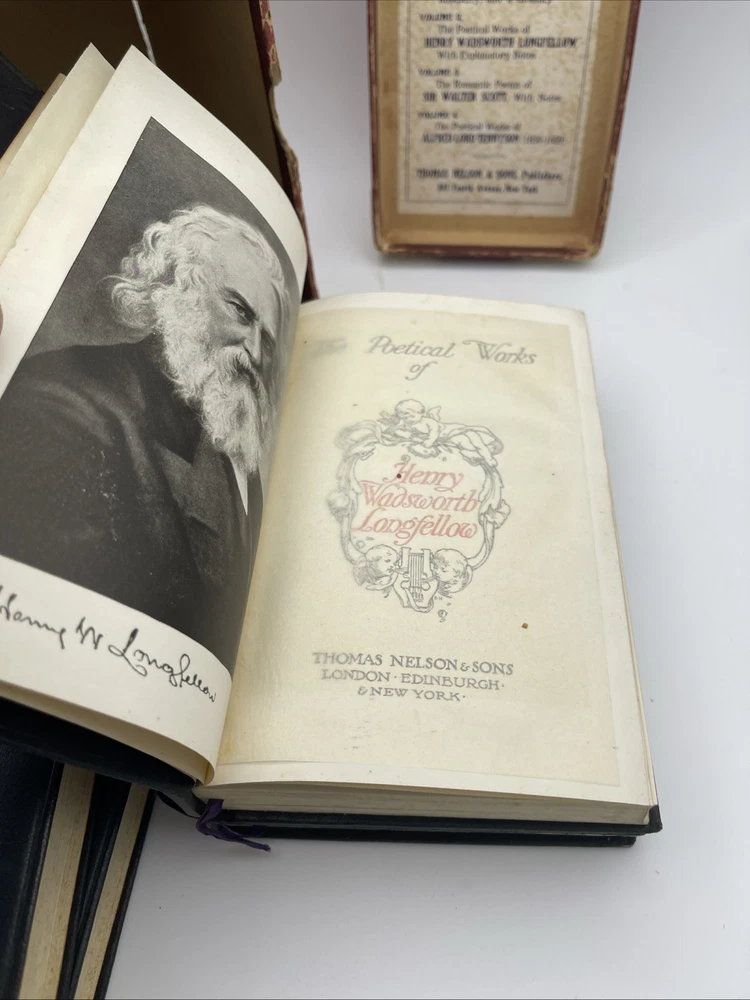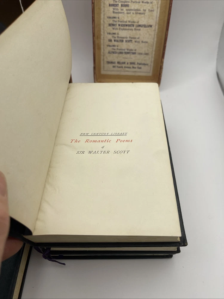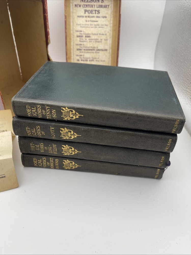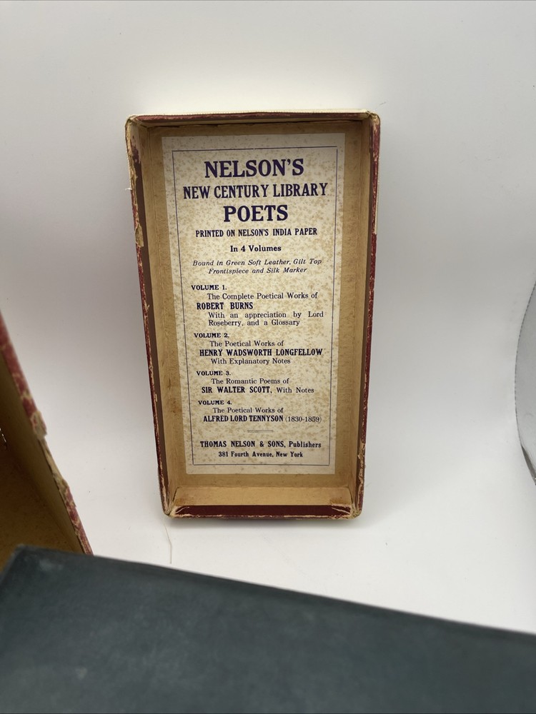 Good shape especially their age. Includes original box and paperwork. Delve into the richness of verse with the Rare 1904 New Century Library Poets Works, featuring the works of Tennyson, Scott, Burns, and Longfellow. This exquisite leather-bound set is a treasure for both bibliophiles and enthusiasts of classic poetry. The collection is presented in English and showcases the original works of Walter Scott, encapsulating the beauty and depth of poetry from a celebrated era. Each book within the set is a testament to the craftsmanship of the period, with bindings that have aged gracefully over time. The set is a perfect addition to any antique book collection or as a stand-alone display piece that embodies the spirit of literary history. Whether for study or as a decorative shelf item, this trio of poetic mastery is a timeless acquisition.