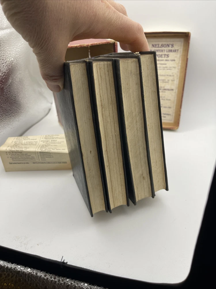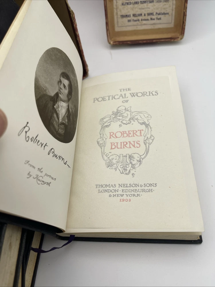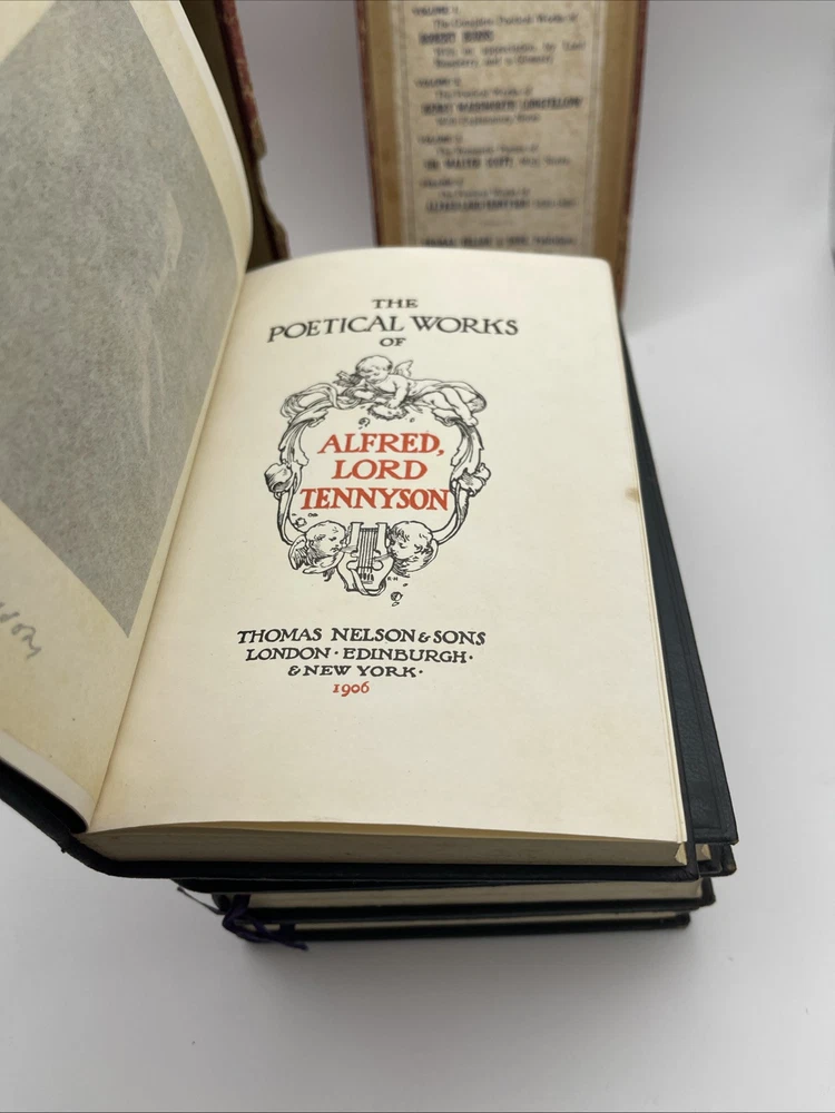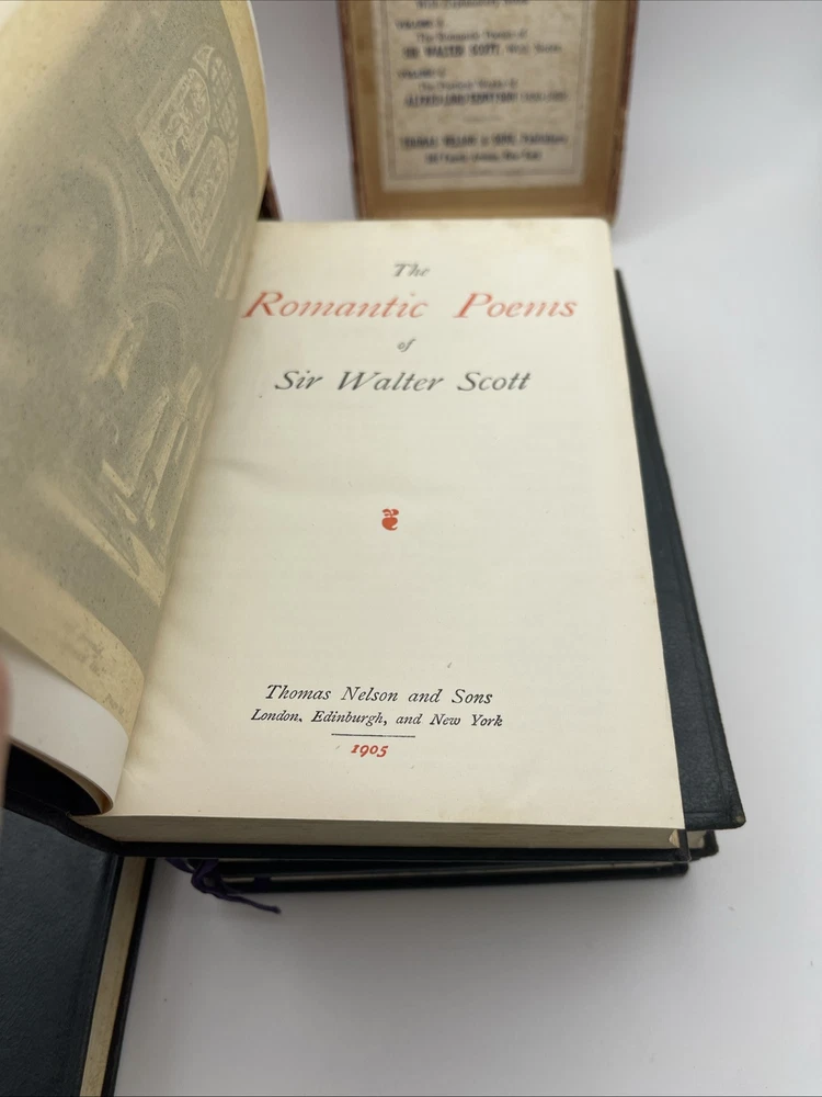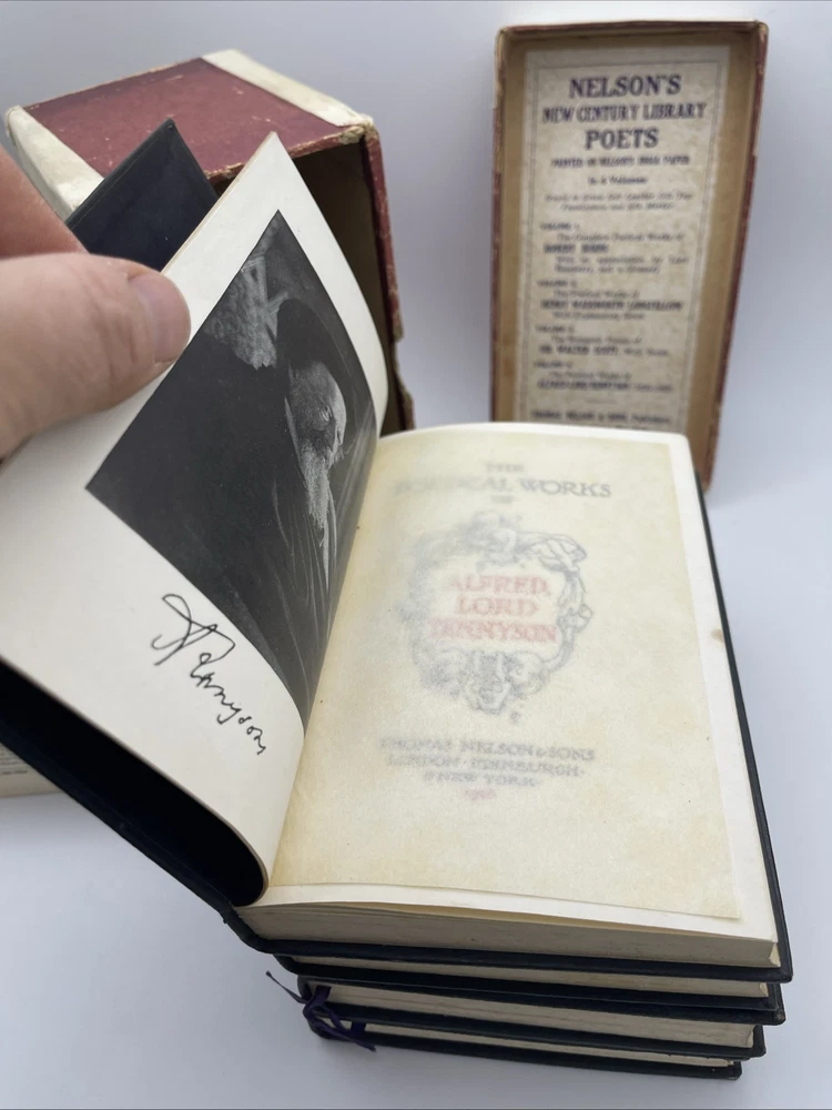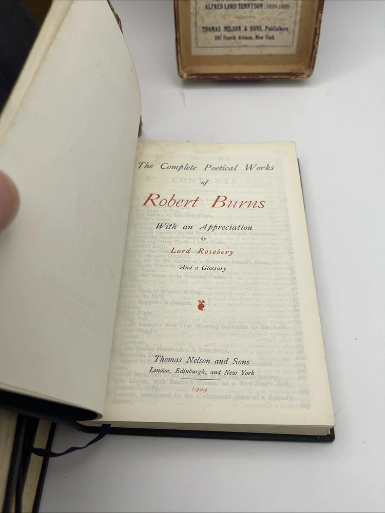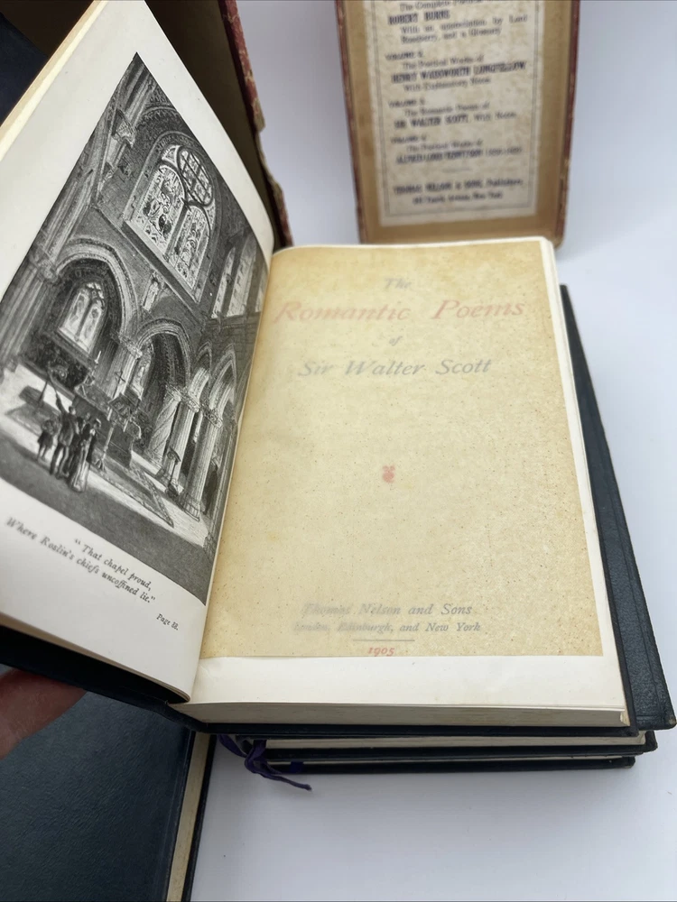Good shape especially their age. Includes original box and paperwork. Delve into the richness of verse with the Rare 1904 New Century Library Poets Works, featuring the works of Tennyson, Scott, Burns, and Longfellow. This exquisite leather-bound set is a treasure for both bibliophiles and enthusiasts of classic poetry. The collection is presented in English and showcases the original works of Walter Scott, encapsulating the beauty and depth of poetry from a celebrated era. Each book within the set is a testament to the craftsmanship of the period, with bindings that have aged gracefully over time. The set is a perfect addition to any antique book collection or as a stand-alone display piece that embodies the spirit of literary history. Whether for study or as a decorative shelf item, this trio of poetic mastery is a timeless acquisition.
