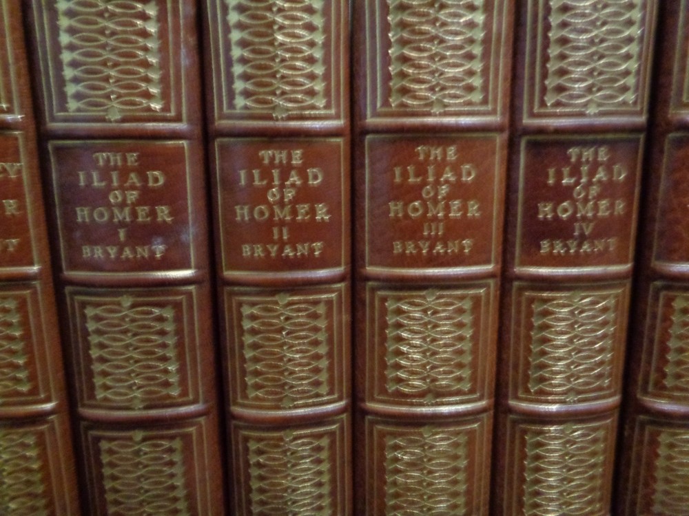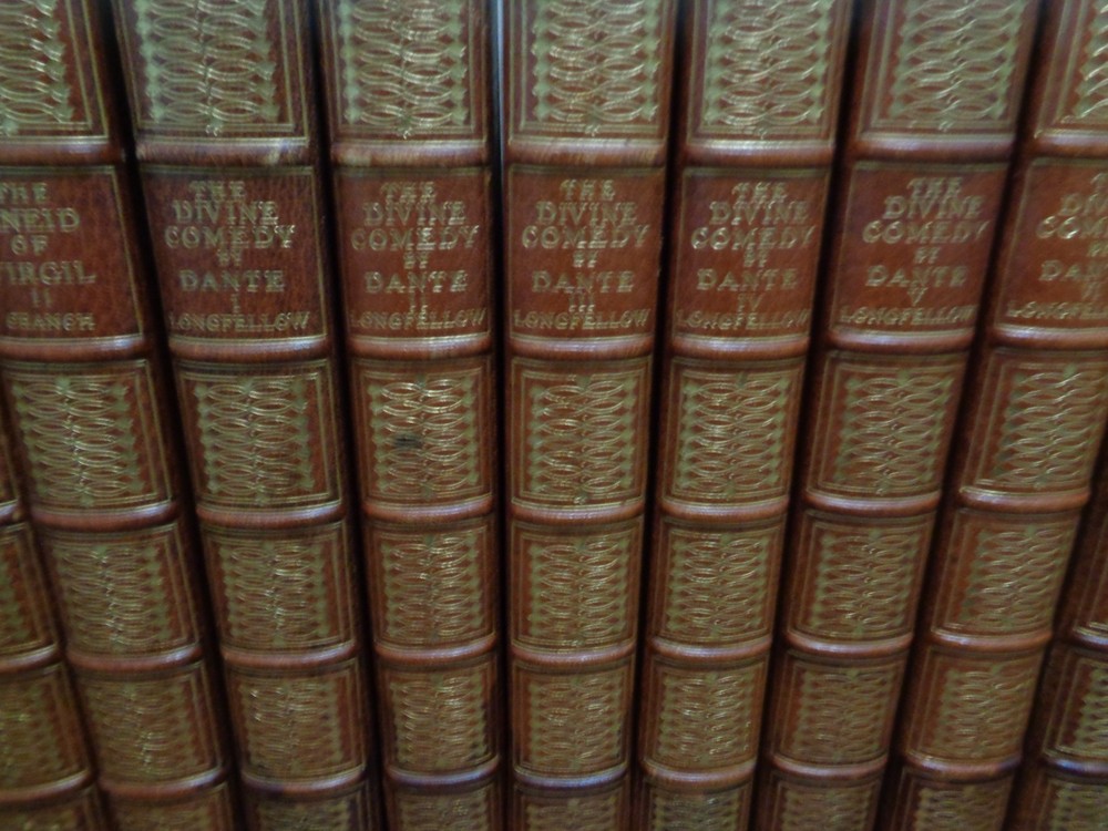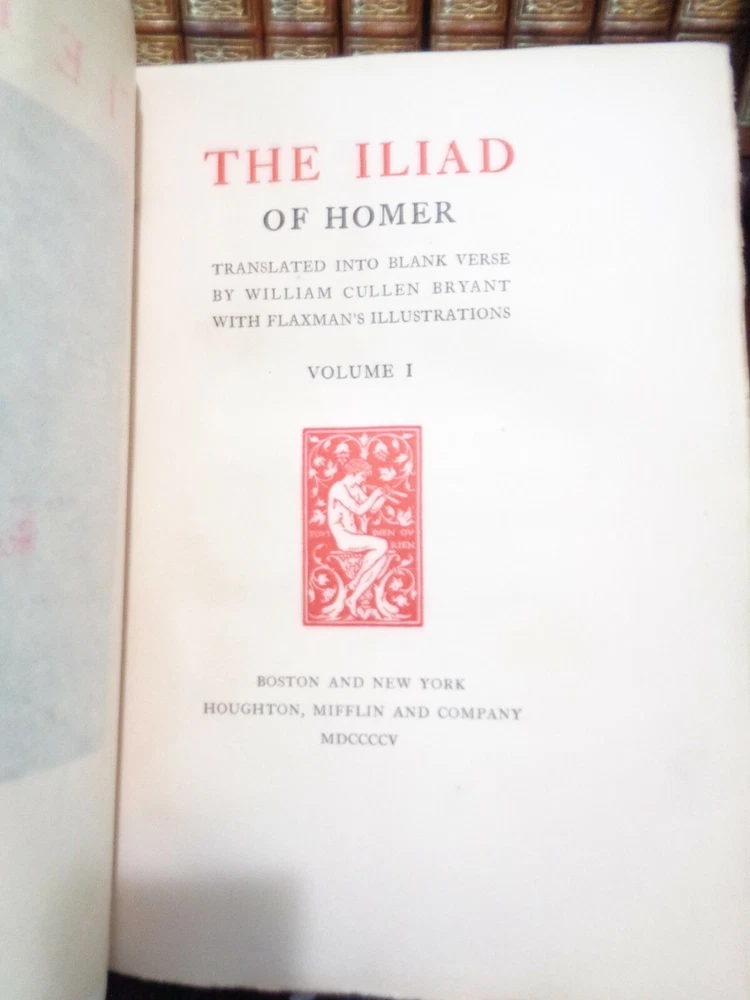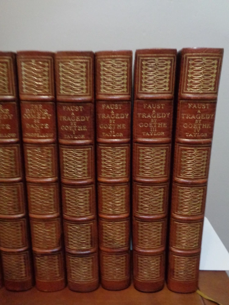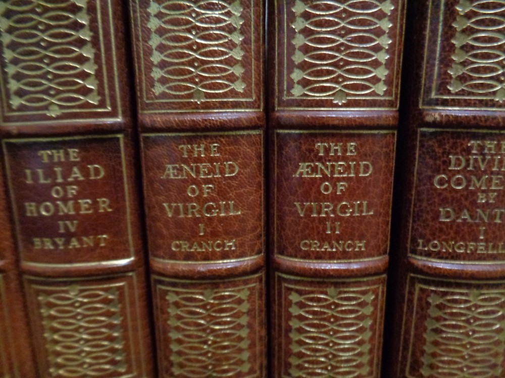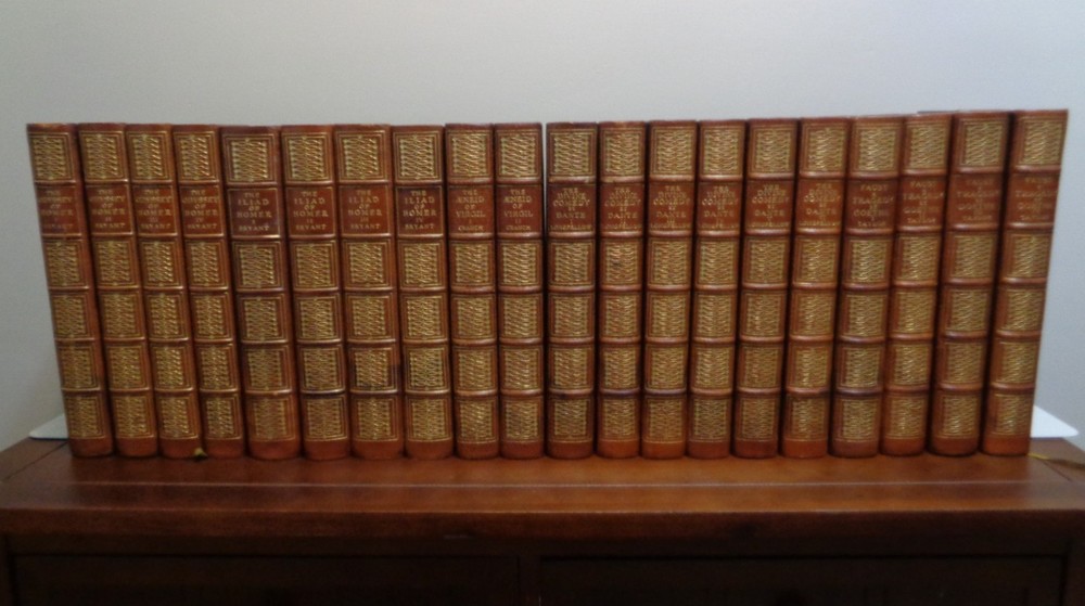 Beautiful, Oversized Limited Edition Set, #187 of 600 Complete in 20 Volumes The Odyssey and the Iliad of Homer The Einid of Virgil The Divine Comedy, Dante Faust, Goethe CALCULATED SHIPPING OR LOCAL PICKUP IN CENTERVILLE/DAYTON, OHIO. We are pleased to offer this twenty-volume set. These volumes make an outstanding shelf display with their large size and gilt-embossed calf leather bindings, with 5 raised bands on the spines. This is a limited-edition printing by Houghton Mifflin, published in 1905. Each book is hand-numbered 187 of 600 printed. The set includes: The Odyssey of Homer, Volumes I-IV, translated to English by William Cullen Bryant The Iliad of Homer, Volumes I-IV, translated to English by William Cullen Bryant and illustrated by Flaxman The Einid of Virgil, Volumes I-II The Divine Comedy by Dante, Volumes I-VI, translated to English by Henry Wadsworth Longfellow Faust, A Tragedy by Goethe, Volumes I-IV, translated by Bayard Taylor Each volume has a double frontispiece, one illustrated in color followed by a black/white of the same, and each with intact tissue separators. There are multiple other B/W illustrations in each volume. Illustrations are by Flaxman and others. Frontispieces include Ulysses & Rausica, Circe, Return of Ulysses, Ulysses & Telemachus, Homer, Helen & Paris, Automodon and the Horses of Achilles, Assembly of the Gods, Aeneus & Dido, Dante Affrighted by the Three Beasts, Dante's Dream, Beata Beatrix, Marguerite Leaving Church, Faust & Helena, etc. The volumes are in good to very good condition for age. The half-leather covers are beautiful, with only light fading/discoloration. There is excellent retention of the gilt embossed spine titles and little wear. These are original covers, marbled boards and endpapers in nice condition. The bindings are secure and tight. All joints and hinges are intact. The pages are gilt edged on top and all pages are present and bound. The pages are good, with little reading wear. MOST pages are in very good condition but there are some light moisture stains on a few pages in 12 of the volumes. Examples are shown. The other books are clean. There is no odor. There is no handwriting in the books, no page tears, and no dog ears. Original page ribbons are present. Each bo ok measures about 10 inches tall. The set takes 30 inches of shelf space. The set weighs about 75 pounds. We will ship in multiple boxes, so they be more easily carried. *Option to pick up in-person. After purchase, we can meet you at an agreed location in the Greater Dayton area. Meet at Antiques Village (Centerville), Heart of Ohio Antique Mall (Springfield), or Ohio Valley Antique Mall (Hamilton). Also, can ship at buyer's cost.* We ship on the next business day after purchase and we maintain an excellent ebay customer satisfaction rating. Please check out our other ebay antiques, fine collectables, and our rare antiquarian book selection. Thank you for shopping with us. Please make us a favorite ebay seller and come again! GardenNut01 Mindy & Jack Note: We search high and wide for interesting items and we do our best to package these items well and ship promptly. If you experience problems with your order(s), please contact us through ebay's "contact seller" feature. We will do what we can to make everything right!
