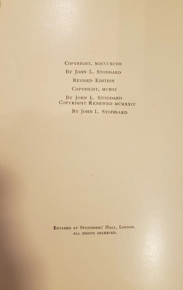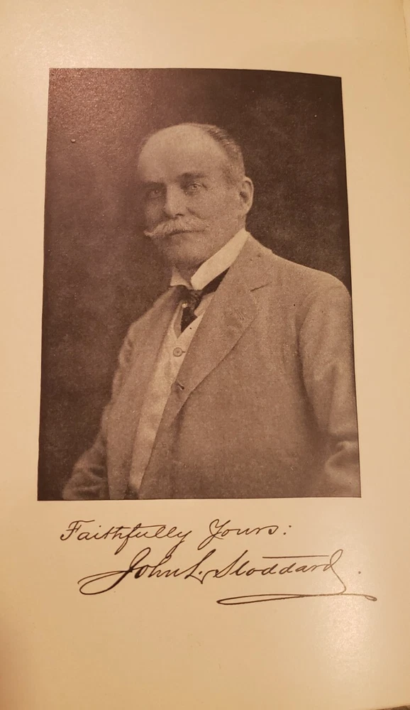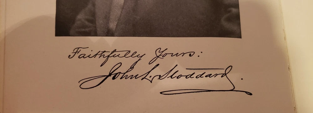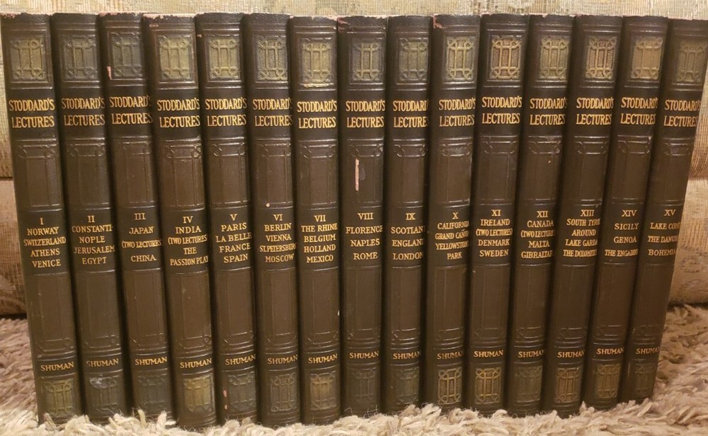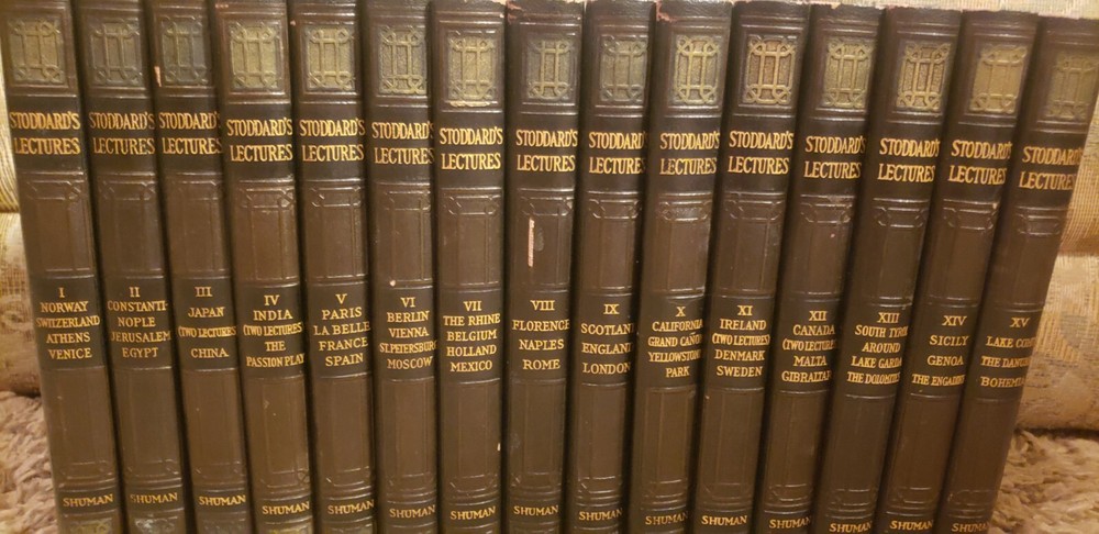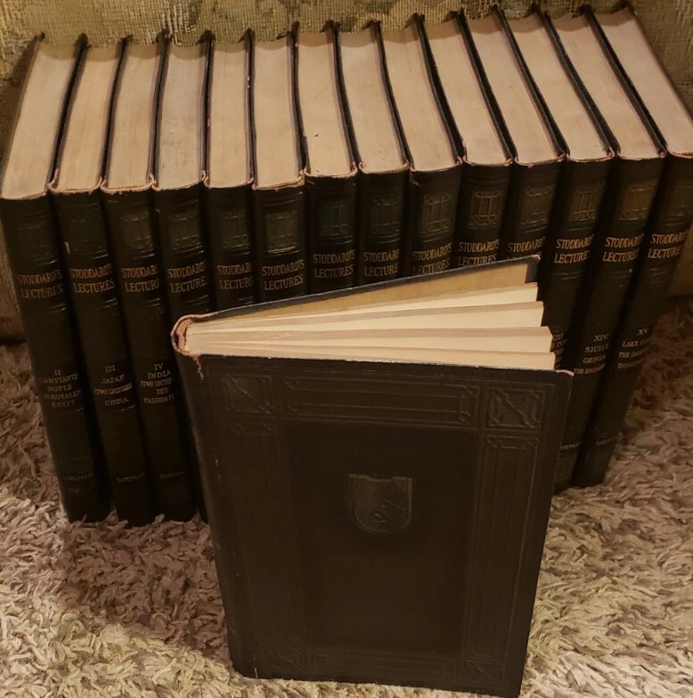 A superb 15 Volume set of John L. Stoddard's Lectures copywright 1898. 1st volume is signed by Stoddard on 2 pages (shown in pictures). The 15th volume is also signed. Each volume has minimal wear commensurate with age. Overall, each book is in Very Good condition. Spines are fully intact and tight. Each leather outer cover of every volume is embossed with a shield emblem (also shown in pictures). A must read for any and all history lovers! John L. Stoddard's signature is a bonus to these already outstanding books!