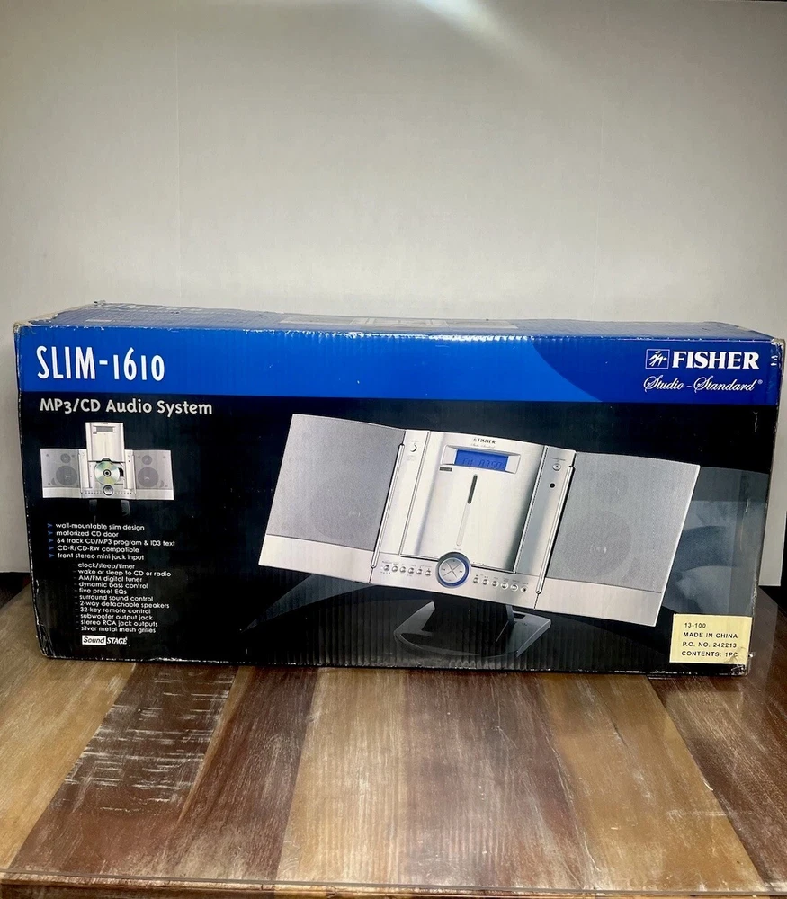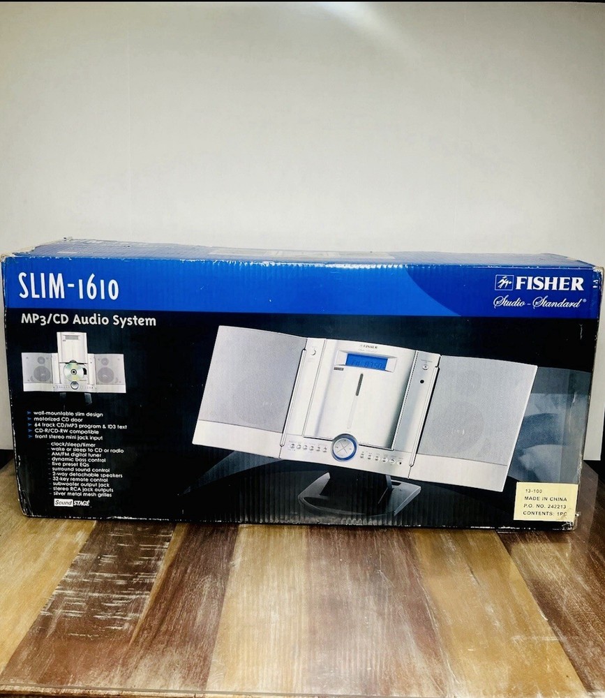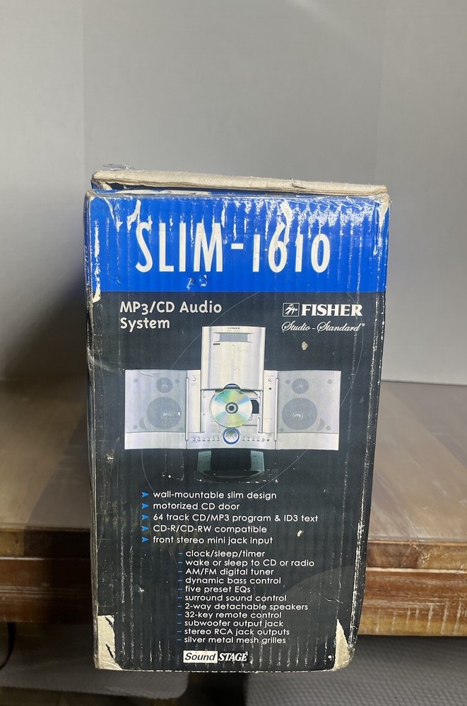 This vintage Fisher Slim Audio System is a rare find for any music lover. It comes with a remote, FM Radio, and plays CDs. The unit is designed to be slim and compact, making it perfect for any space. The model number is SLIM 1610, and it is a brand new item. The audio system is not only functional but also stylish, adding a touch of elegance to any room. It is a great addition to any multimedia collection and perfect for anyone who enjoys listening to music. This unit type is a single unit, and the quantity available is one. Don't miss out on the opportunity to own this amazing Fisher Slim Audio System.