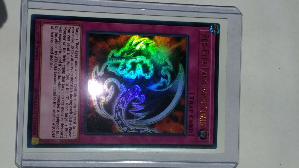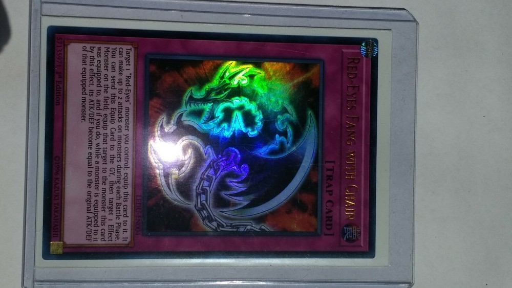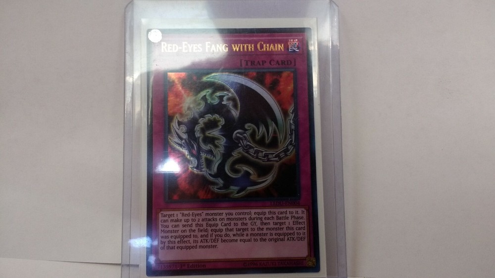 Hello, thank you for viewing this auction of Red-Eyes Fang With Chain LEDU-EN004 1st Edition! This card was pulled from a pack and immediately was put into a card sleeve and card case. This card is an amazing card for any "Red-Eyes" deck! If you have any questions, please feel free to ask away. Feel free to offer! If you would like me to provide more pictures, I can if needed. Thank you for taking your time to look and have a great day!