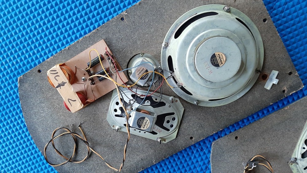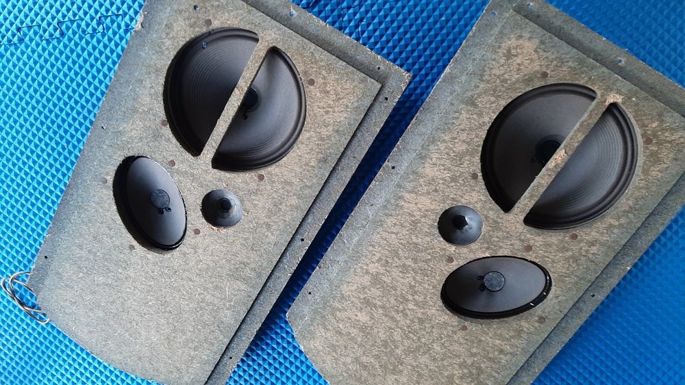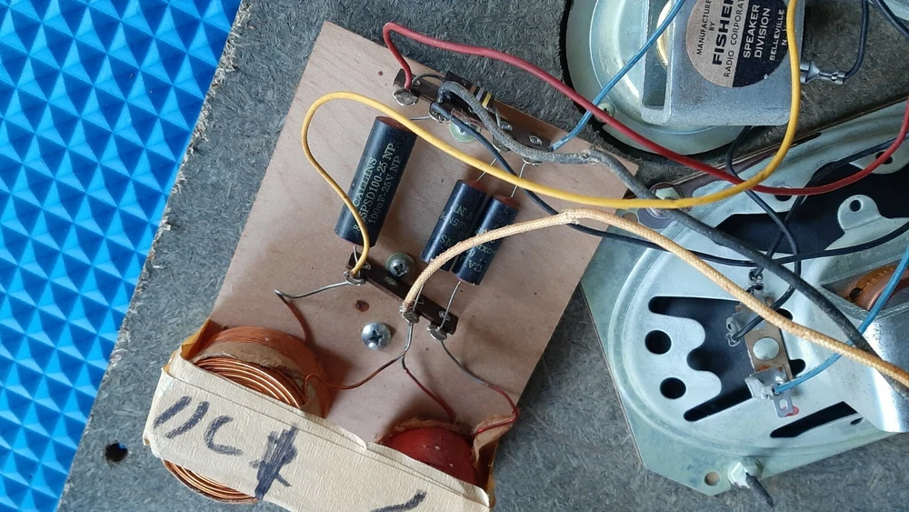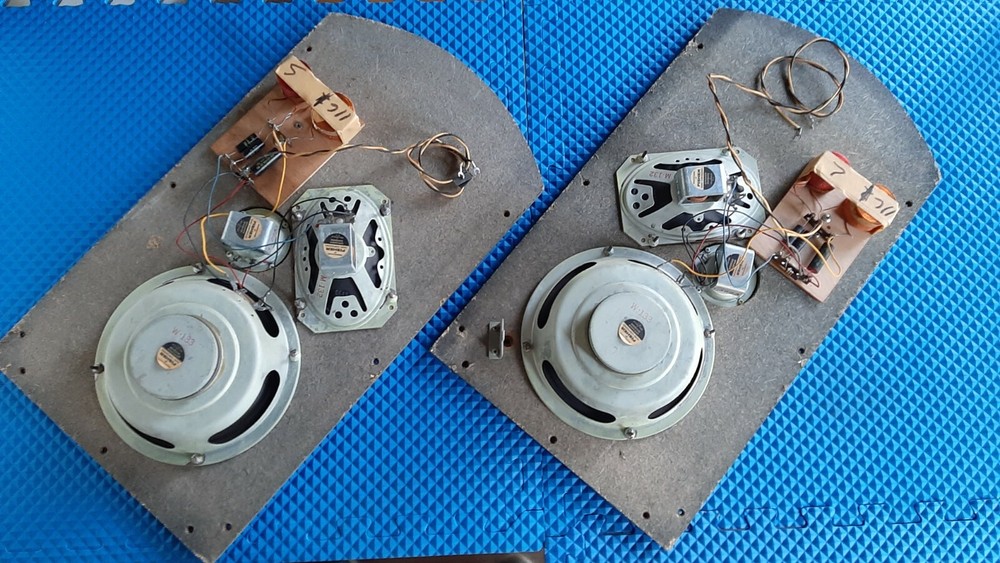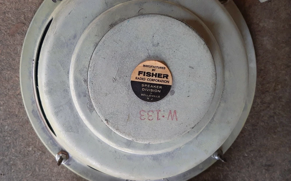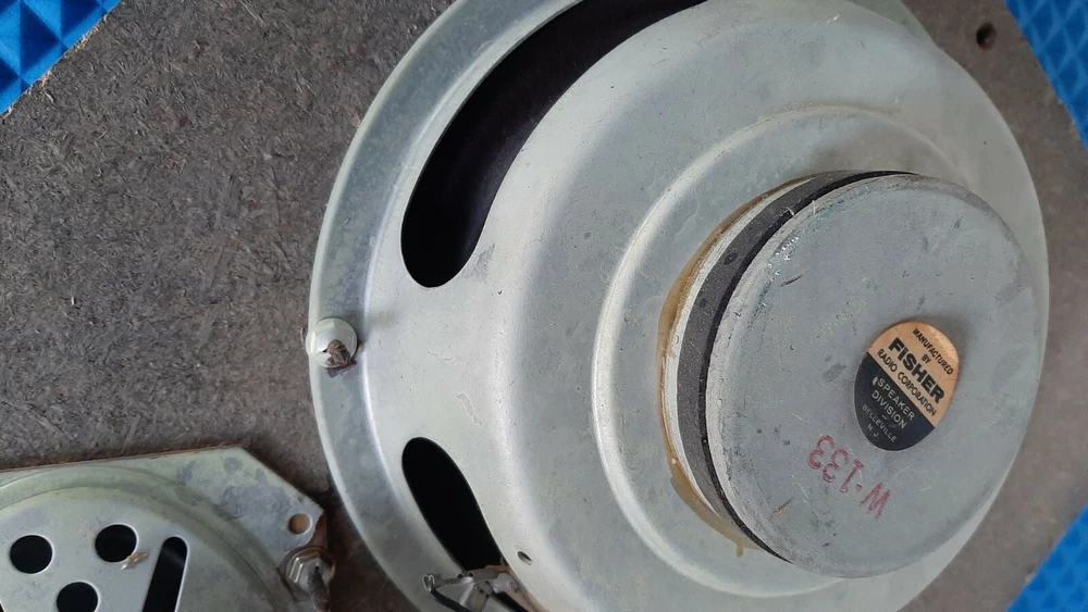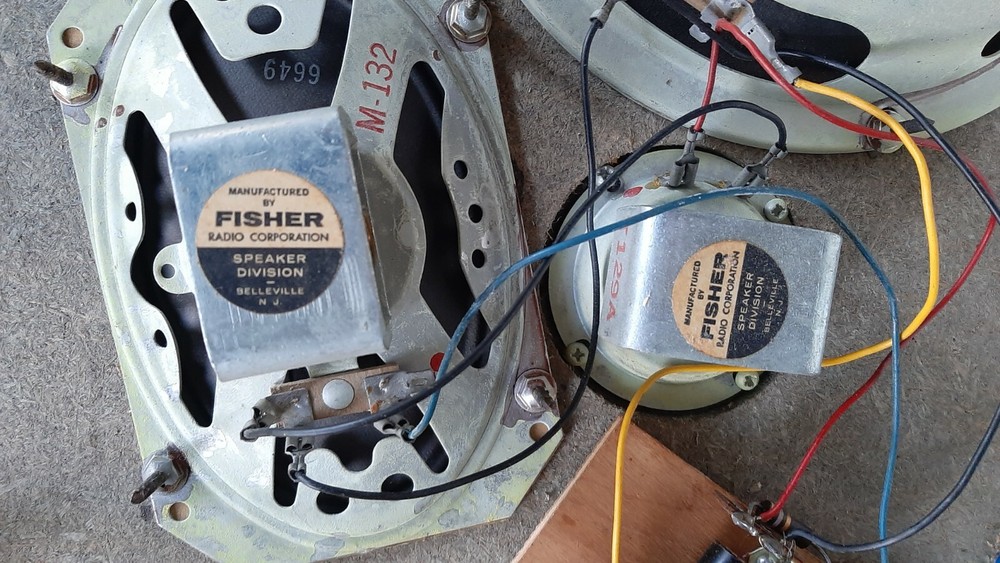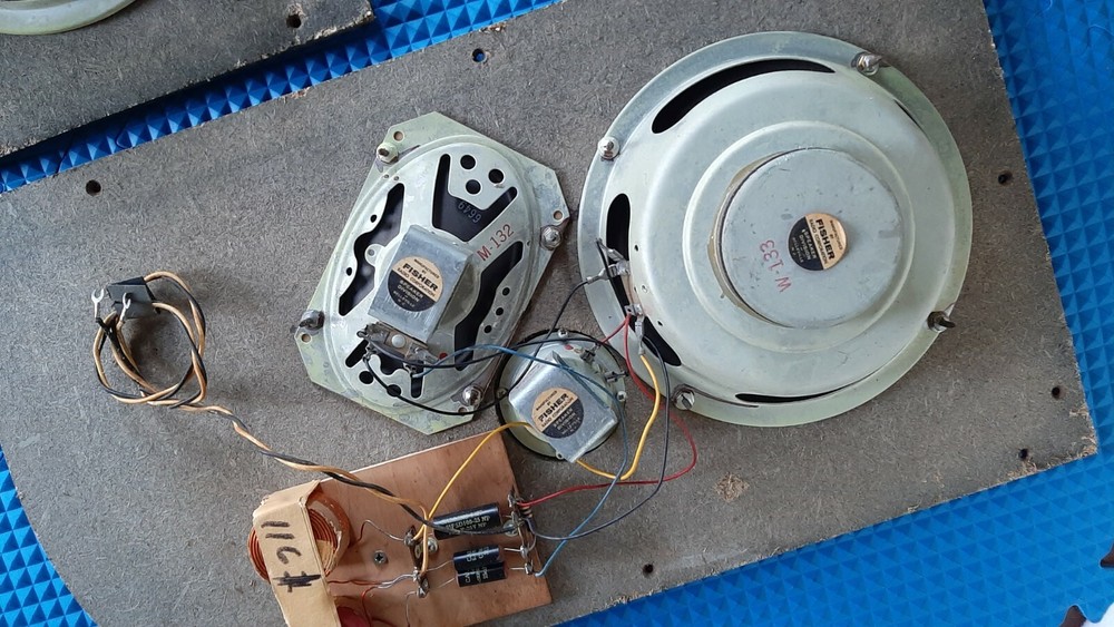 PRICE REDUCED! Vintage Fisher Stereo Speaker system board from 1960s Console 3-way w. Crossover Taken from a Fisher tube console stereo bought in the 1960s, this is the complete speaker system, with crossovers, mounted on particle board panels Each system consists of one woofer, approx. 7", one midrange, approx. 3 1/2" by 6", and one tweeter, approx. 3" in diameter. There is a crossover network with coils and caps. The cones are in good shape, with one small hole in one of the woofers. The speakers all have been tested and work fine. The system overall sounds like it should. The particle boards are showing their age, with a little crumbling around the edges. Definitely a piece of 1960s memorabilia, and they don't sound bad! [You can have just the speakers without the mounting board if desired]