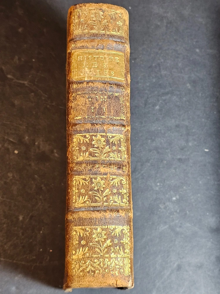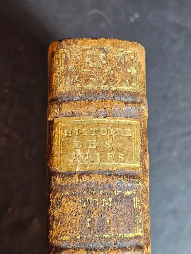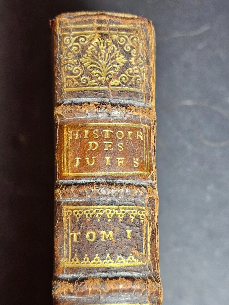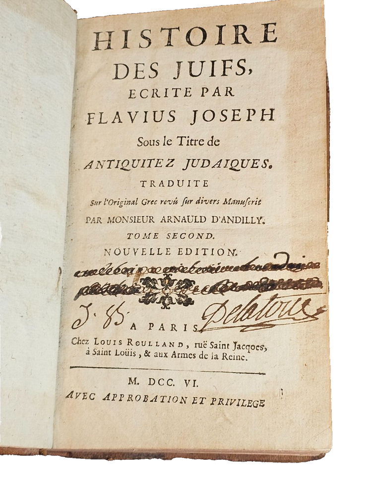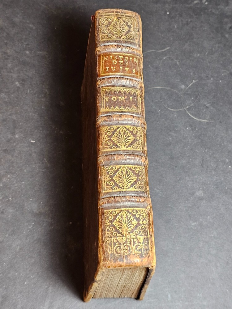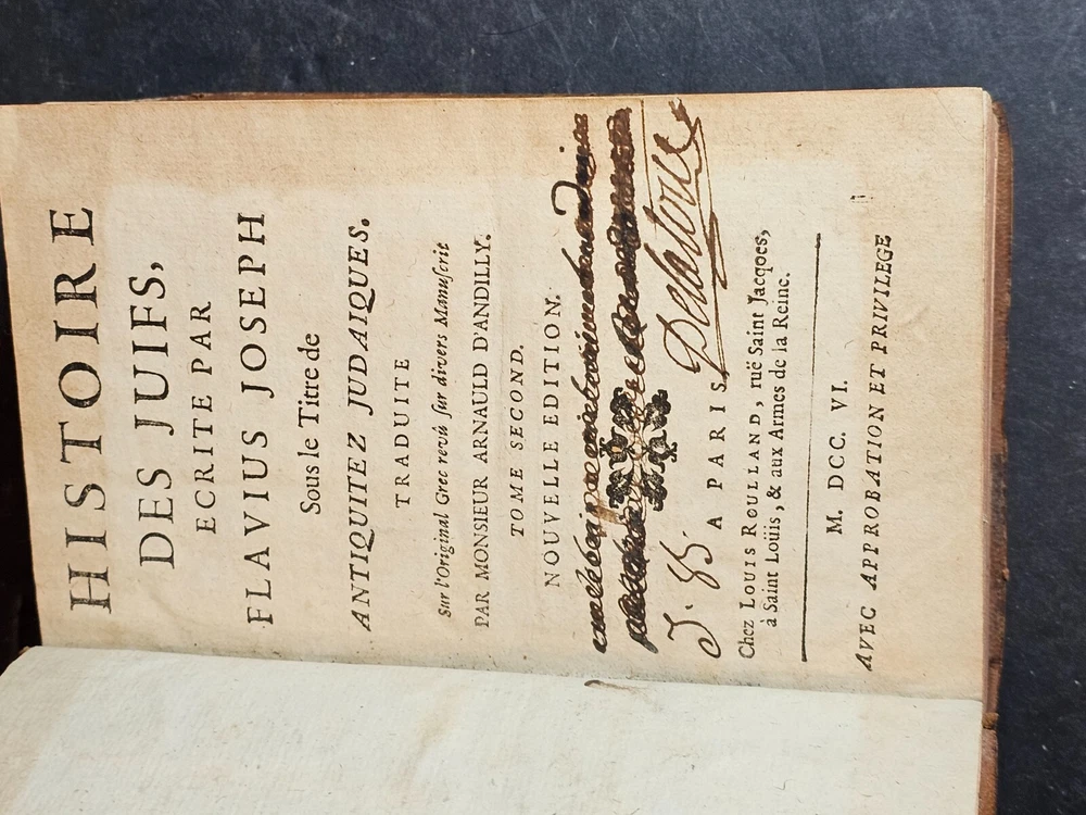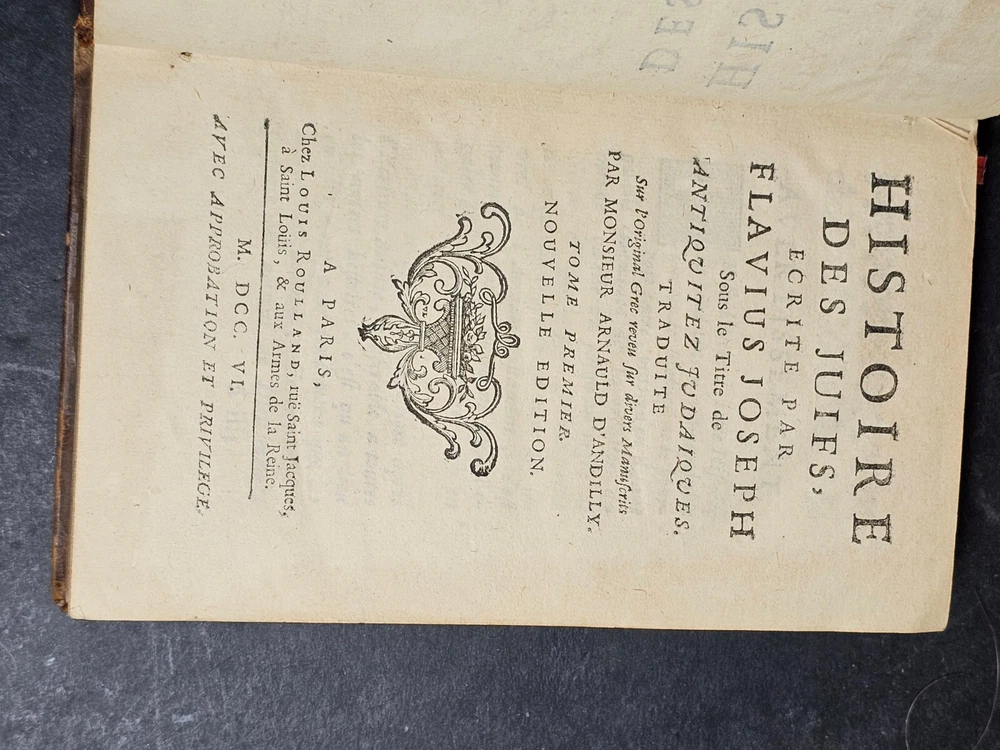 Title: Rare 1706 French Edition of Flavius Josephus' "Jewish Antiquities" in 2 Volumes Description: This is a rare 2-volume leather-bound set of "Jewish Antiquities" by Flavius Josephus, published in French in 1706 in Paris, France. The books are in overall good condition, with some minor wear and tear. There are some edge cracks on the lower portion of the spine of volume 1, and some wear on the right front lower corner of volume 2. There are no missing pages, rips, or tears. The books are complete and tight. Volume 1 ends with page 493, and volume 2 ends with page 505. This is a rare and valuable set of books that would make a great addition to any library or collection. Product Details: Author: Flavius Josephus Title: Jewish Antiquities Edition: French, 1706 Publisher: Chez Jean-Roulland, Paris Binding: Leather Condition: Overall good, with some minor wear and tear Pages: 986 (in total) Brief History of 1706 Copies: The 1706 French edition of "Jewish Antiquities" by Flavius Josephus is a rare and valuable book. It was the first time that Josephus' work had been translated into French, and it was a popular book in its day. Only a handful of copies are known to exist today, making this a truly special find.