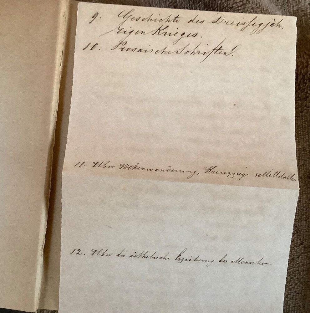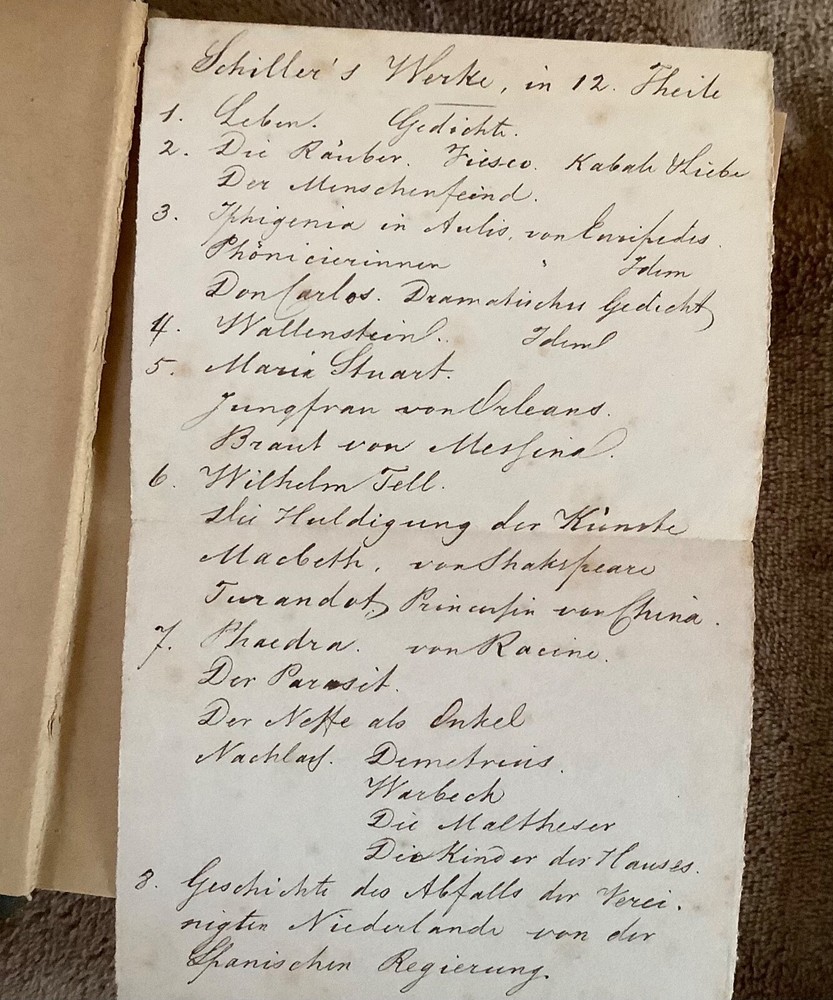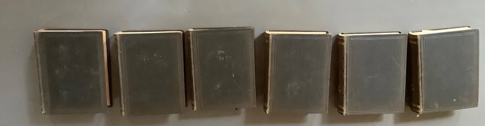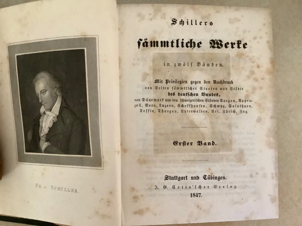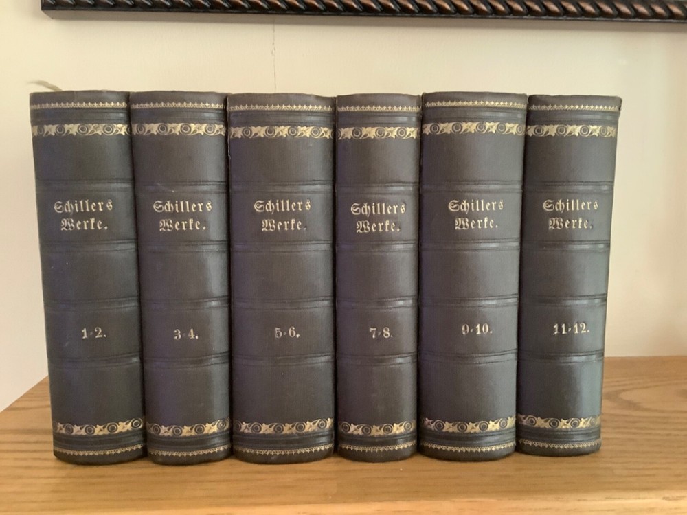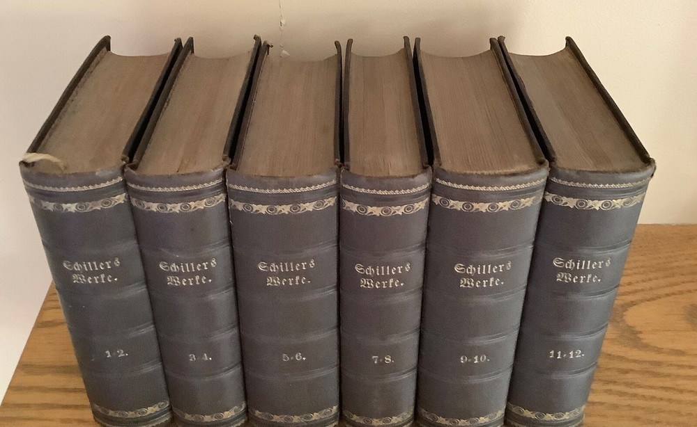 Nice rare antique leather 1847 German book set of Schillers works. Volumes 1-12 in six books. Books have foxing on pages but they do not appear to have any tears. Bindings are tight. Leather has some scuffing as you can see in picures but overall in decent condition for the age. Language is in German. Book sizes are approx. 6" H x 5" W each.