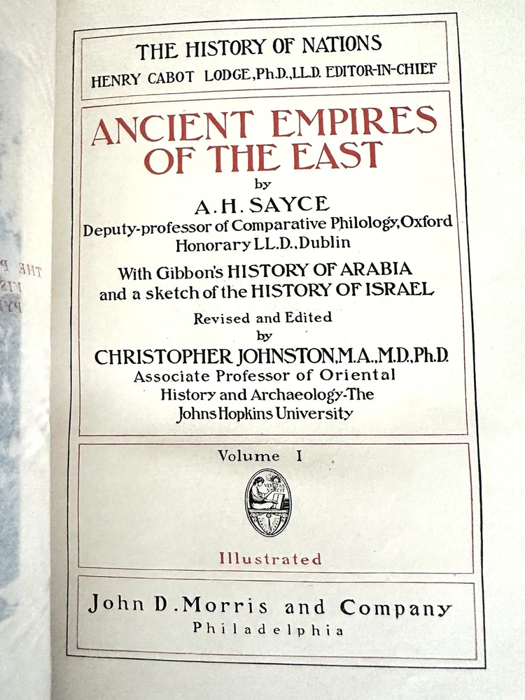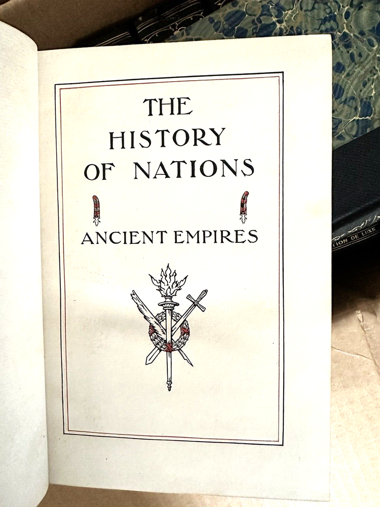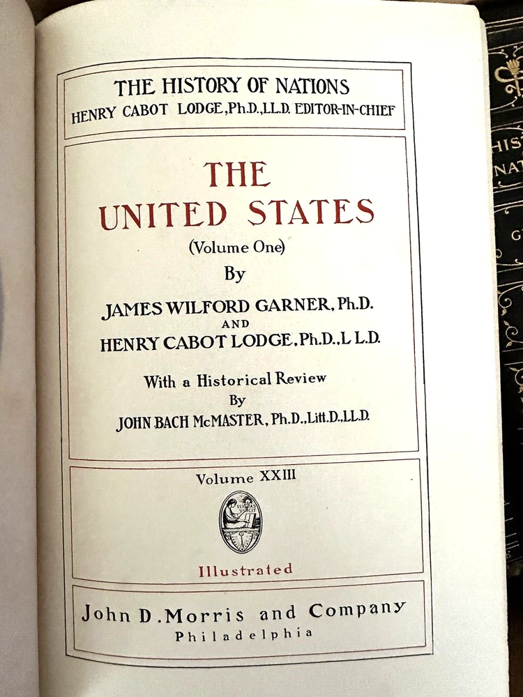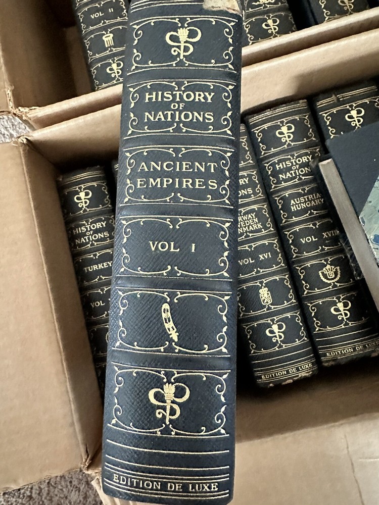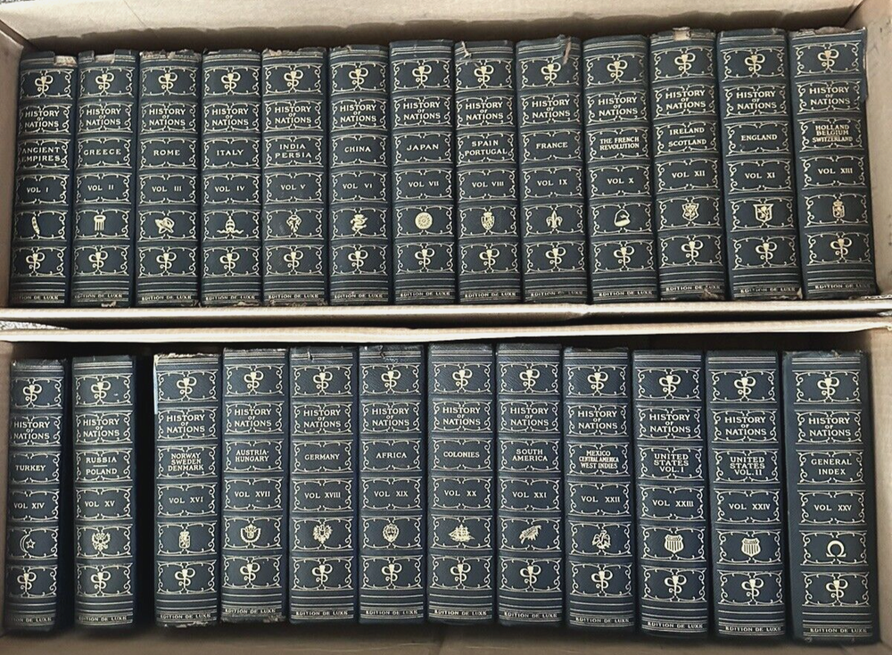 Rare 1906 First Edition Edition De Luxe Complete Set History of Nations Henry Cabot Lodge, Editor Publisher: John D. Morris 25 Volumes, including General Index Good condition (see photos) Bindings are tight Bookplate on each volume (see photo) Corners bumped and rounded Shelf handling wear to covers (see photos) Some covers are chipped at the top (see video) One volume has a small tape on the cover Illustrated with frontispieces, colored & b/w plates and Text maps Dimensions: 9 1/2" x 6 1/2" x 3" (each volume) Vol. I: Ancient Empires of the East. Vol. II: Greece. Vol. III: Rome. -Vol. IV: Italy. Vol. V: India - Modern Persia. Vol. VI: China. Vol. VII: Japan. Vol. VIII: Spain and Portugal. Vol. IX: France. Vol. X: The French Revolution. Vol. XI: England. Vol. XII: Ireland and Scotland. Vol. XIII: Holland and Belgium - Switzerland. Vol. XIV: Turkey. Vol. XV: Russia and Poland. Vol. XVI: Norway Sweden and Denmark - Polar Research. Vol. XVII: Austria - Hungary. Vol. XVIII: Germany. Vol. XIX: Africa. Vol. XX: Colonies of the World. Vol. XXI: South America. Vol. XXII: Mexico Central America and West Indies. Vol. XXIII: United States Vol. I. Vol. XXIV: United States Vol. II; Vol. XXV: General Index. A very rare complete set of first edition deluxe History of Nations. A really cool collection for a history buff or in a great library.