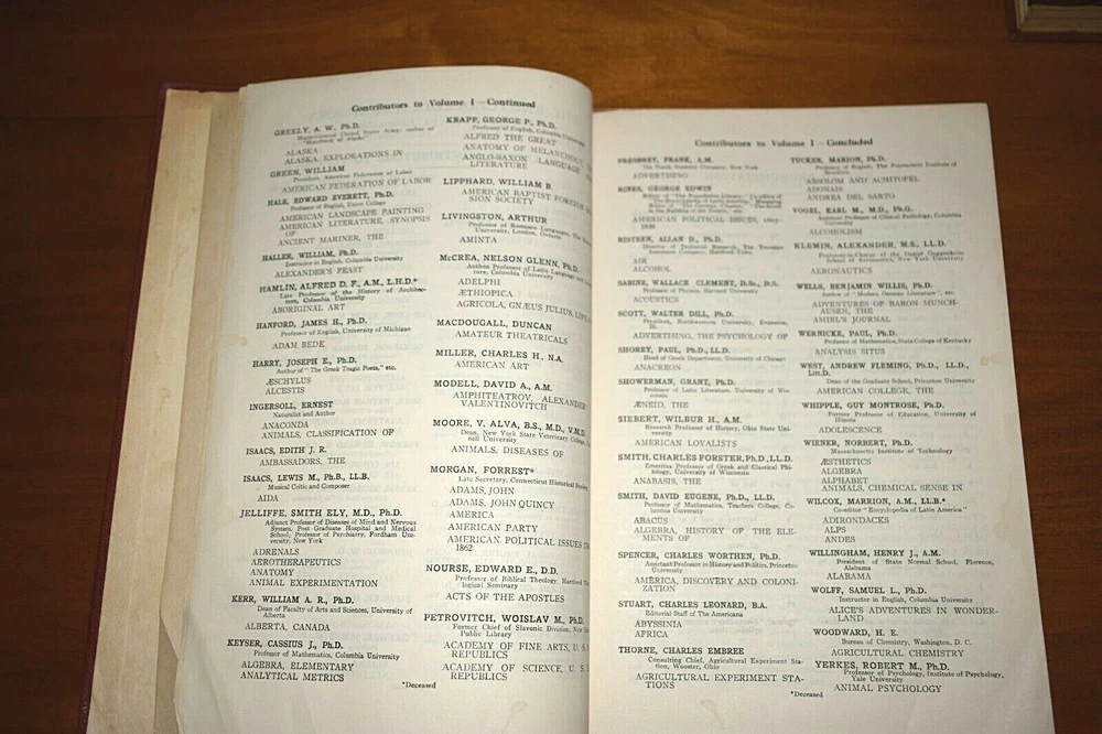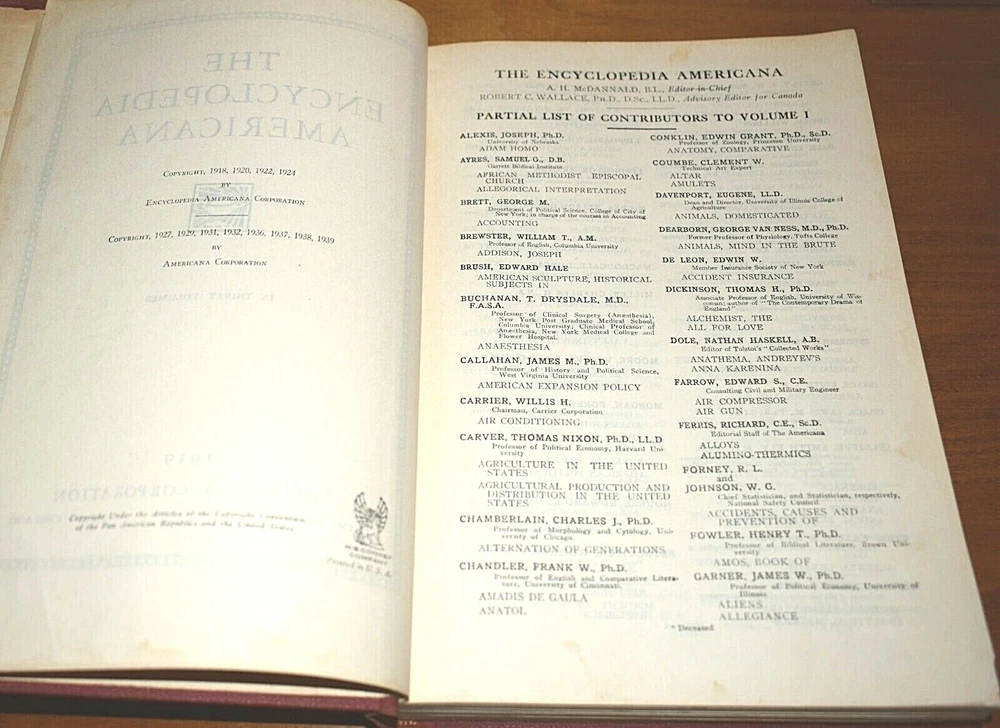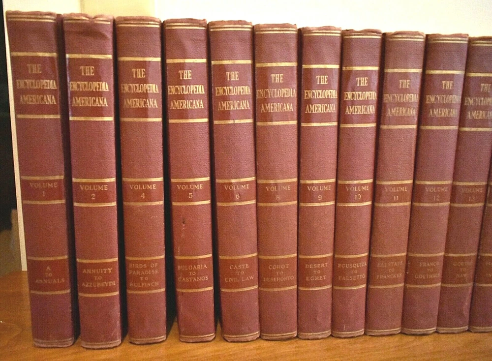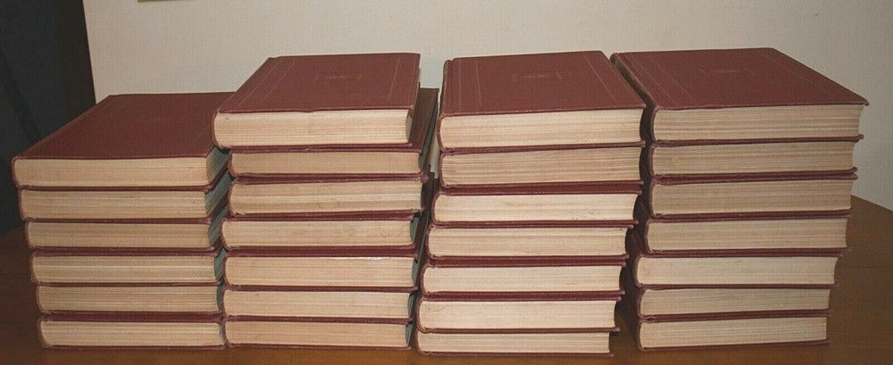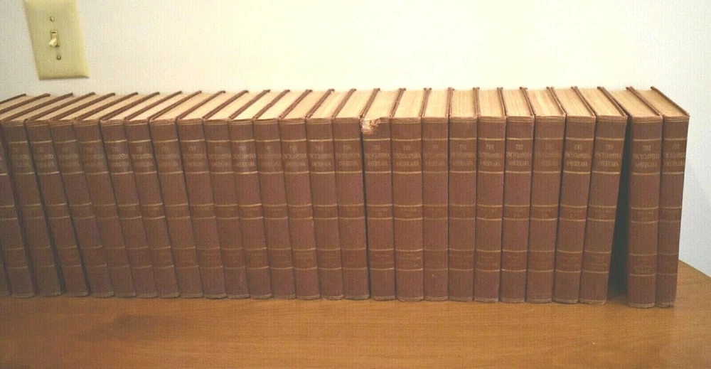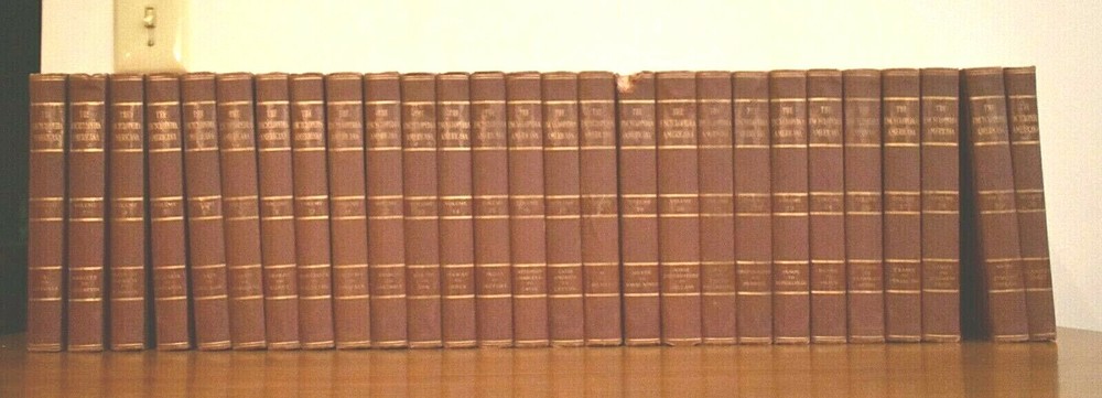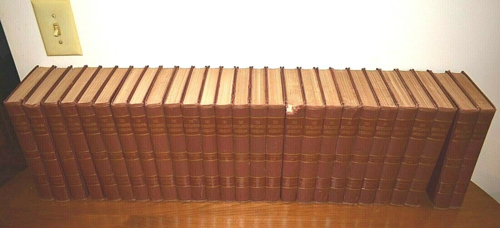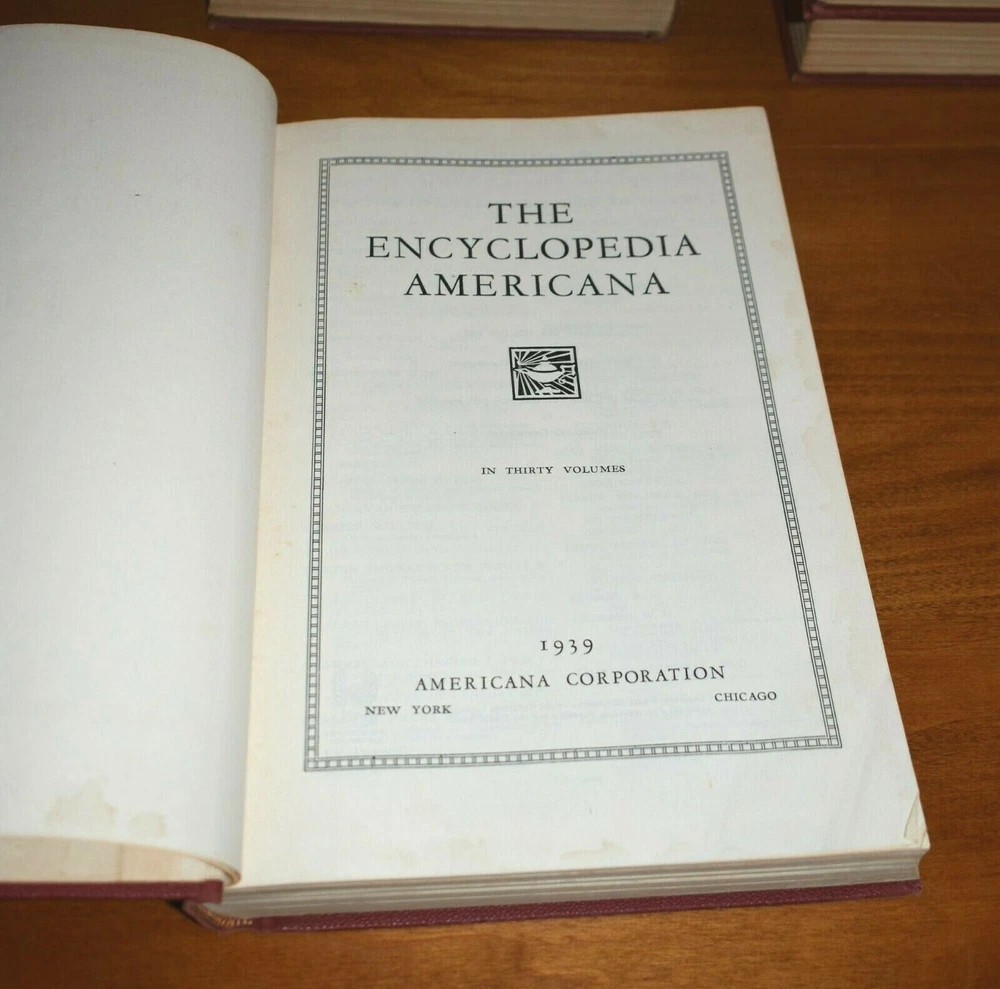 1939 The Encyclopedia Americana In thirty volumes originally, two volumes are missing which are Numbers 3, 25. Number seven is not pictured above, it is now available and in very good condition one word written on the inside cover. All other volumes are in very good condition with no missing or torn pages, they are mostly clean with some minor scatter discoloration on some pages, which for their age they are quite remarkable in condition, most volumes have no worn leather, only number 19 has any notable cover wear on the top binding edge. All volumes have no binding wear with all pages still firmly attached. They are listed to sell as a whole set but if you are looking for particular volume you can contact me through E bay for a quote on a single or more volumes. I can give you more photos on the books in more detail upon request, there are so many I do not have the space to post all the details I would like to. Thanks for looking.