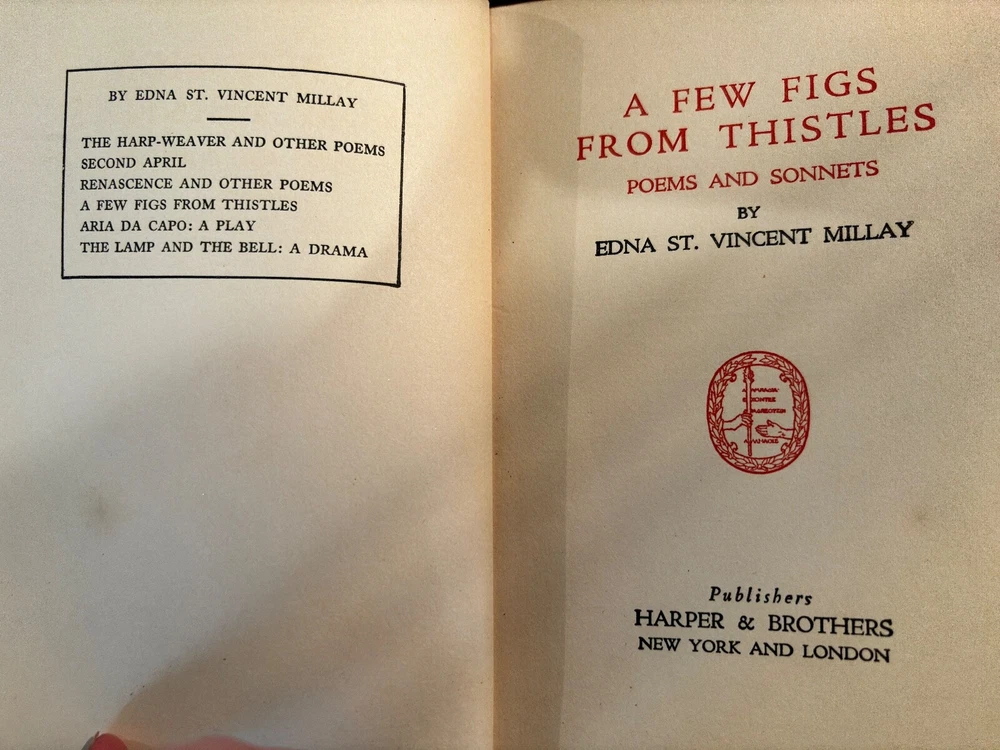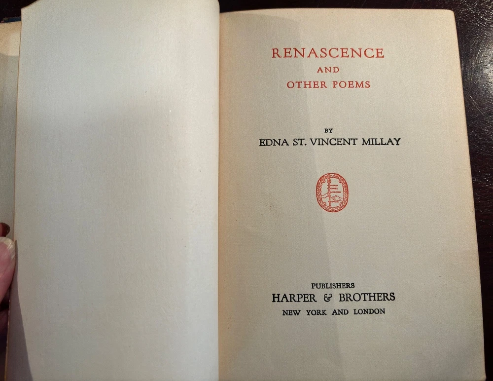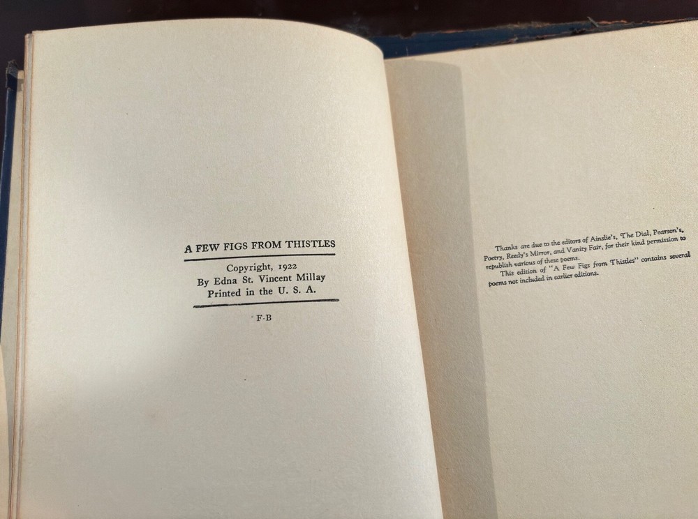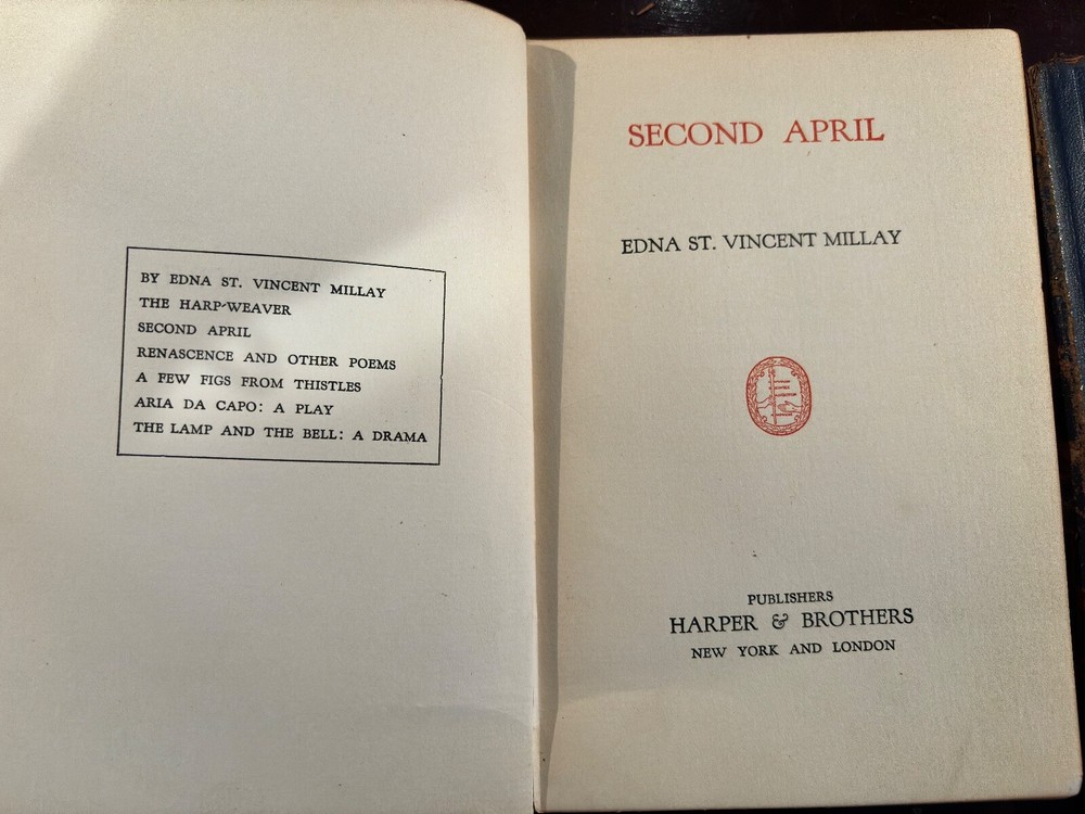 S acrificing rare and treasured 4-volume set of antique books that are family heirlooms. This four-volume set of the poetic works of Edna St. Vincent Millay has been handed down in my family over three generations and the last hundred years. All books have some damage to bindings consistent with age and storage. All volumes have a pasted-in owners printed label with "From the Library of . . . " and previous owner's printed name. All volumes have blue leather bindings with art deco-style gold stamped emblems. Some wear and damage to end bindings consistent with age and storage. All content complete. Renascence and Other Poems Copyright 1917 Published by Harper & Brothers. 73 pages. Second April Copyright 1921zpublidshed byHarper & Brothers 111 pages A Few Figs From Thistles Copyright 1922 Published by Harper & Brothers 39 pages. The Buck in the Snow & Other Poems Copyright 1928 Published by Harper & Brothers 1928 70 printed pages plus end papers Books are antique and fragile, consistent with age, and thus no returns. Please buy carefully.