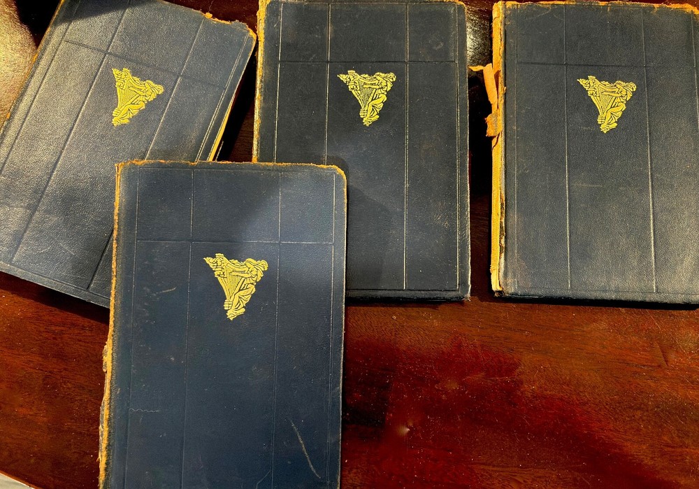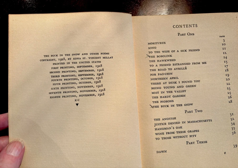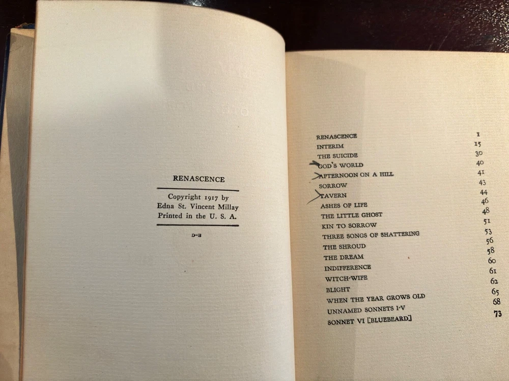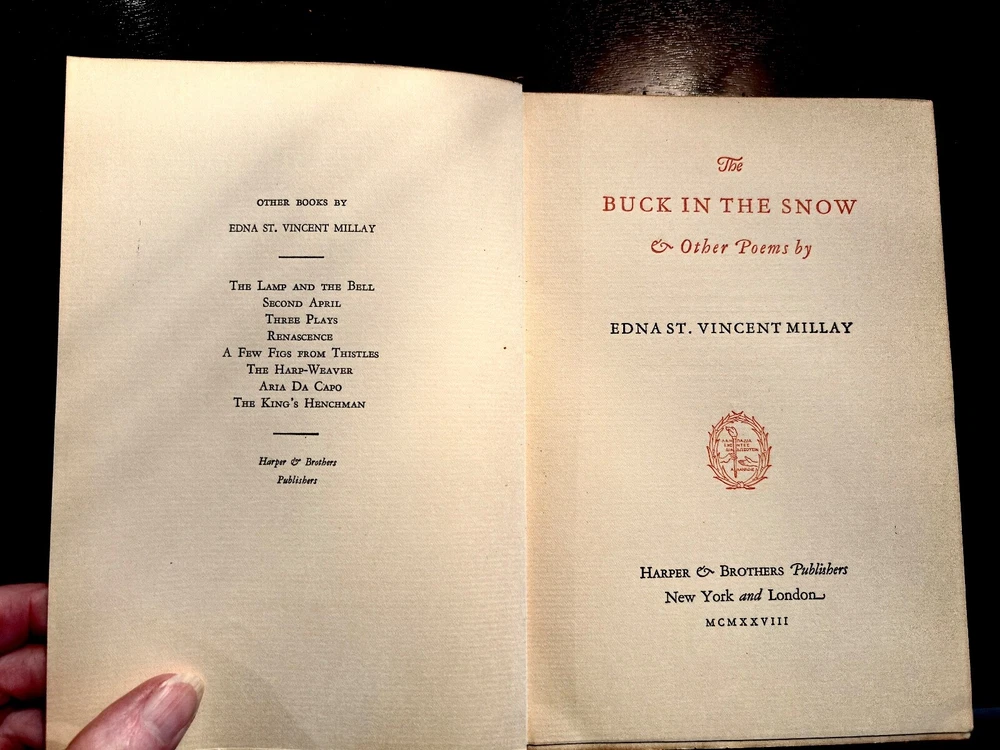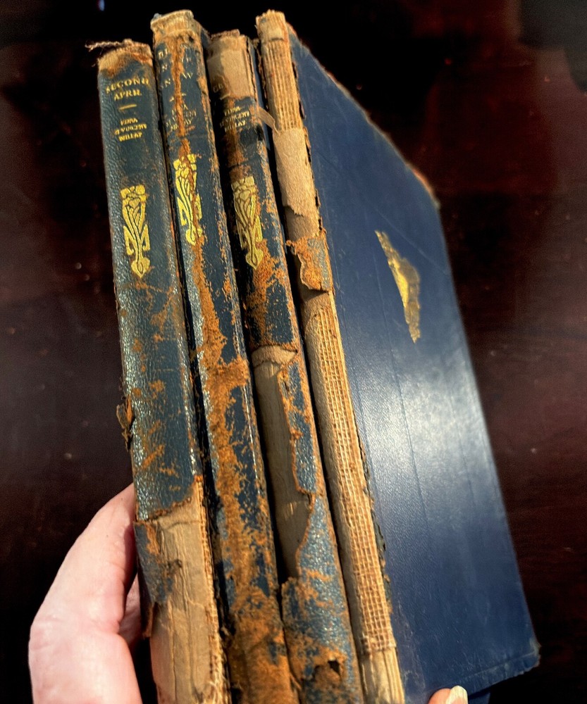 S acrificing rare and treasured 4-volume set of antique books that are family heirlooms. This four-volume set of the poetic works of Edna St. Vincent Millay has been handed down in my family over three generations and the last hundred years. All books have some damage to bindings consistent with age and storage. All volumes have a pasted-in owners printed label with "From the Library of . . . " and previous owner's printed name. All volumes have blue leather bindings with art deco-style gold stamped emblems. Some wear and damage to end bindings consistent with age and storage. All content complete. Renascence and Other Poems Copyright 1917 Published by Harper & Brothers. 73 pages. Second April Copyright 1921zpublidshed byHarper & Brothers 111 pages A Few Figs From Thistles Copyright 1922 Published by Harper & Brothers 39 pages. The Buck in the Snow & Other Poems Copyright 1928 Published by Harper & Brothers 1928 70 printed pages plus end papers Books are antique and fragile, consistent with age, and thus no returns. Please buy carefully.