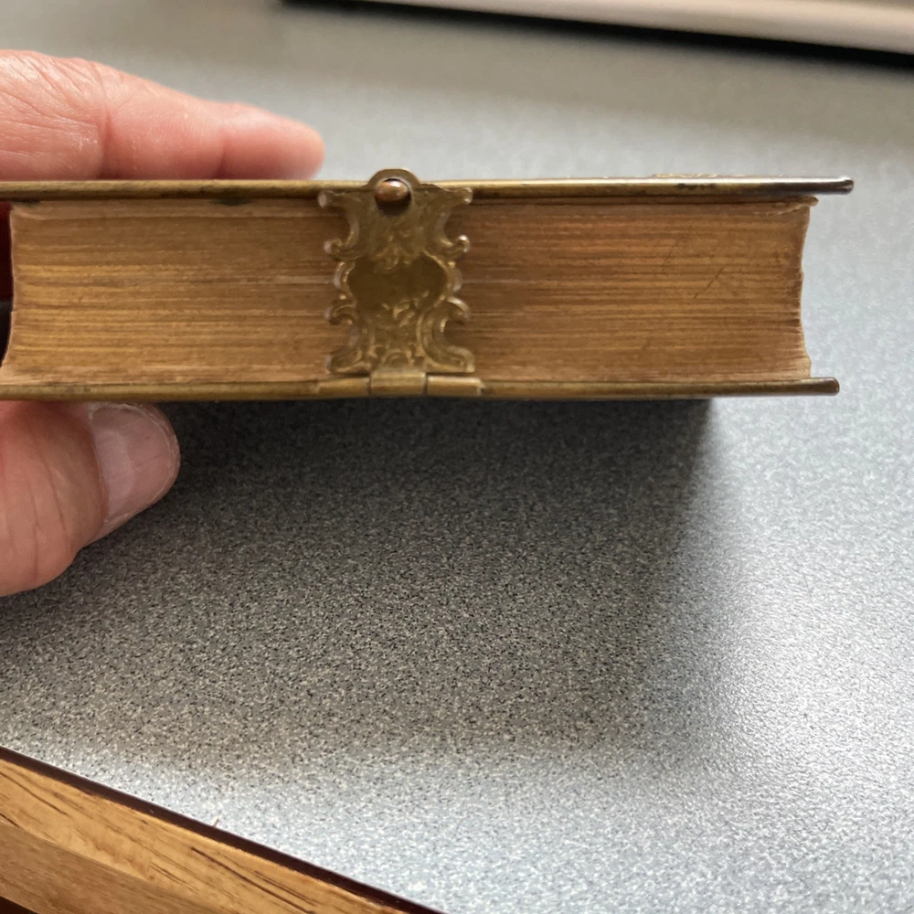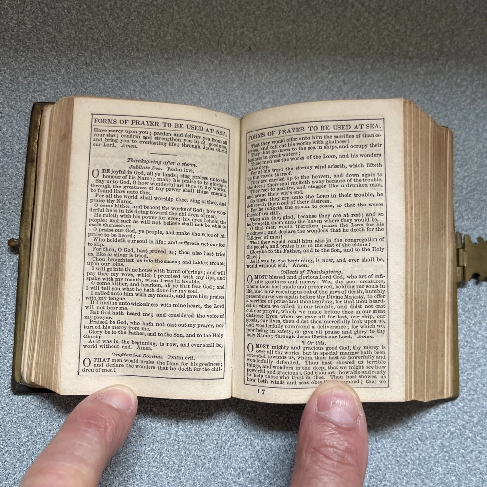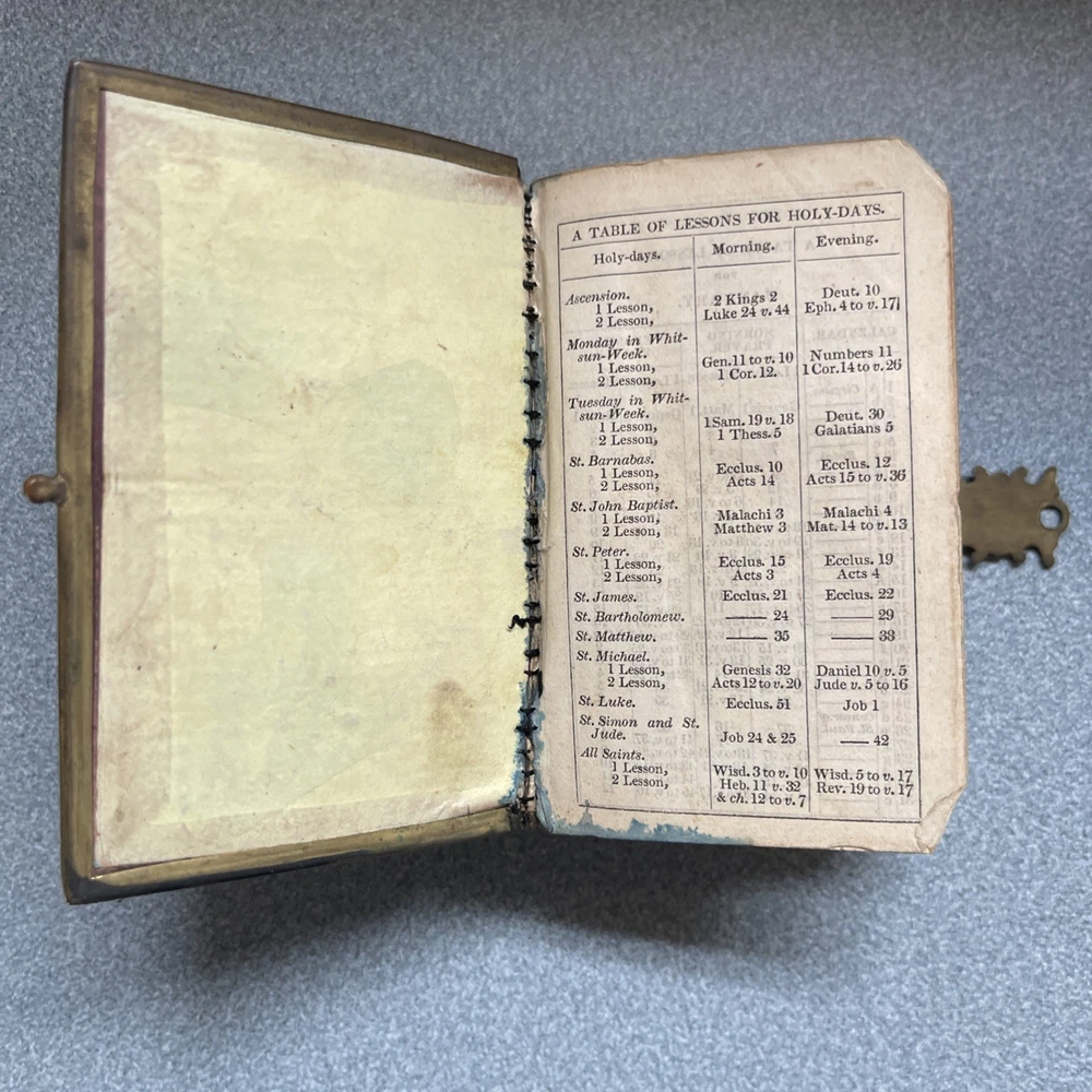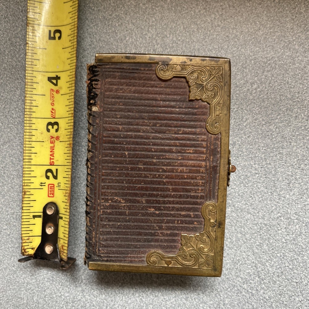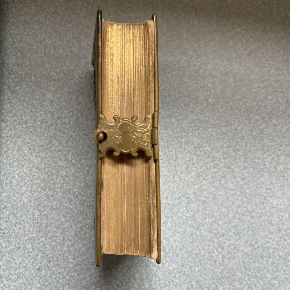 This rare antique Bible Common Prayer set is a 4" edition featuring a miniature brass construction with a clasp for closure. The Bible is bound in leather and written in English, making it a valuable collectible for those interested in Christianity and religious artifacts. With its original author being God, this unique piece is sure to appeal to collectors and enthusiasts of religious literature and items. Rare find! 235 pages. Unsure of year of publication. Seems to be early 1800’S