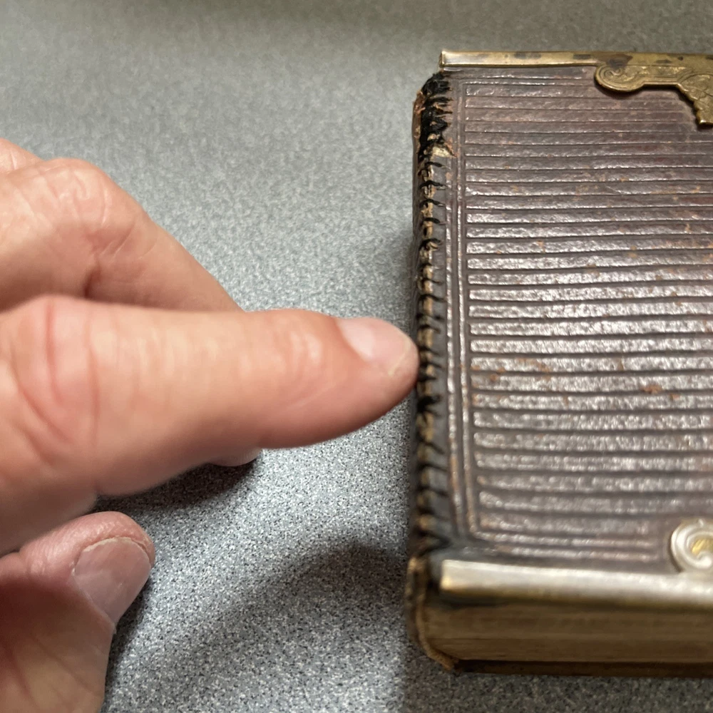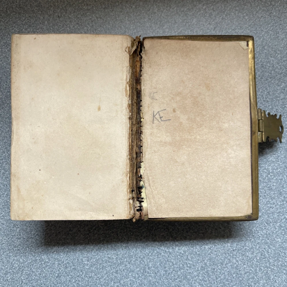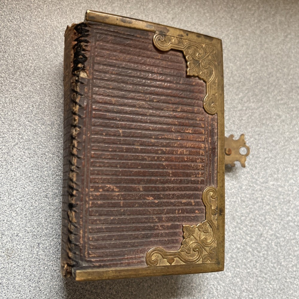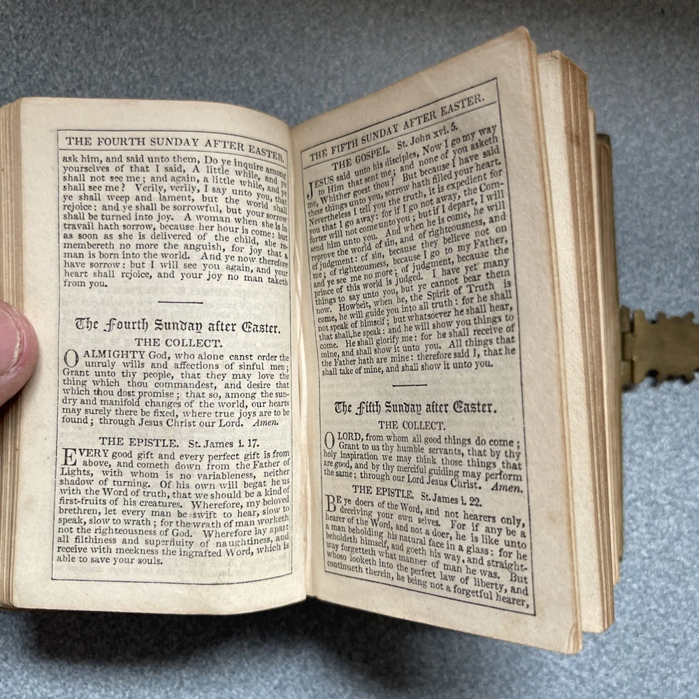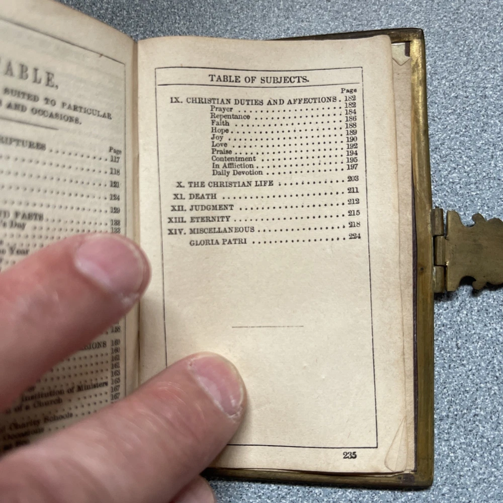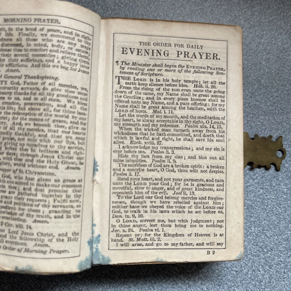 This rare antique Bible Common Prayer set is a 4" edition featuring a miniature brass construction with a clasp for closure. The Bible is bound in leather and written in English, making it a valuable collectible for those interested in Christianity and religious artifacts. With its original author being God, this unique piece is sure to appeal to collectors and enthusiasts of religious literature and items. Rare find! 235 pages. Unsure of year of publication. Seems to be early 1800’S